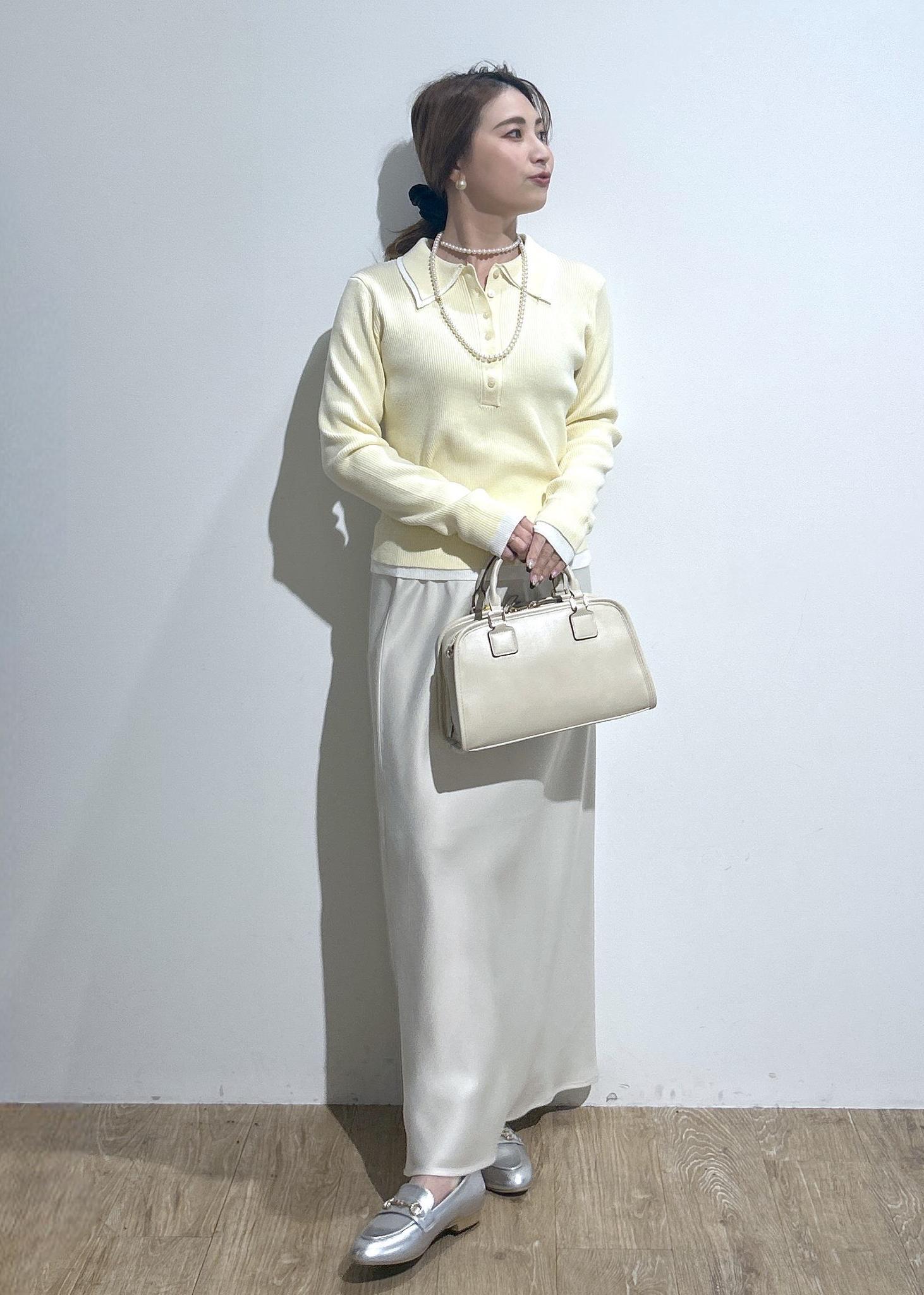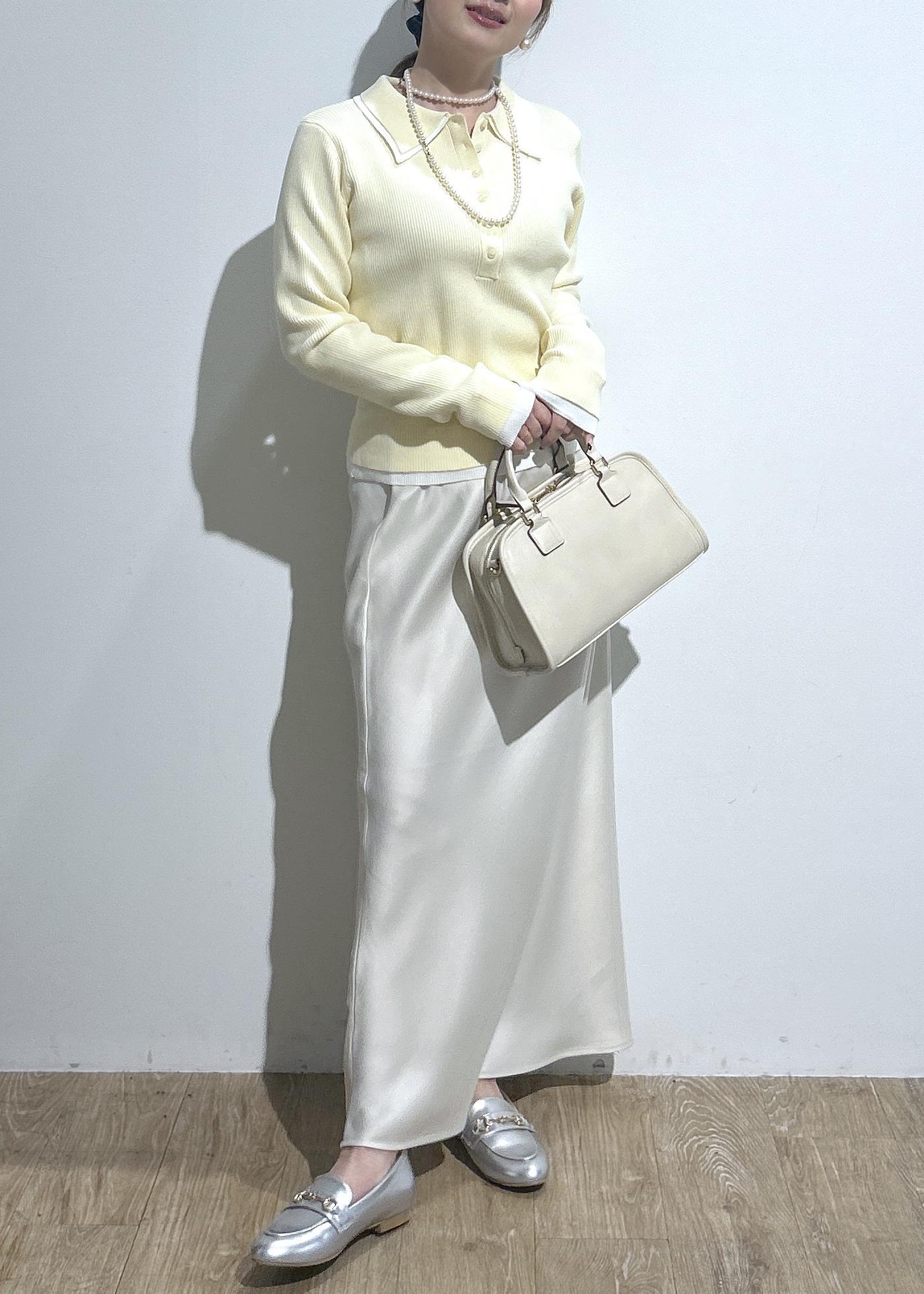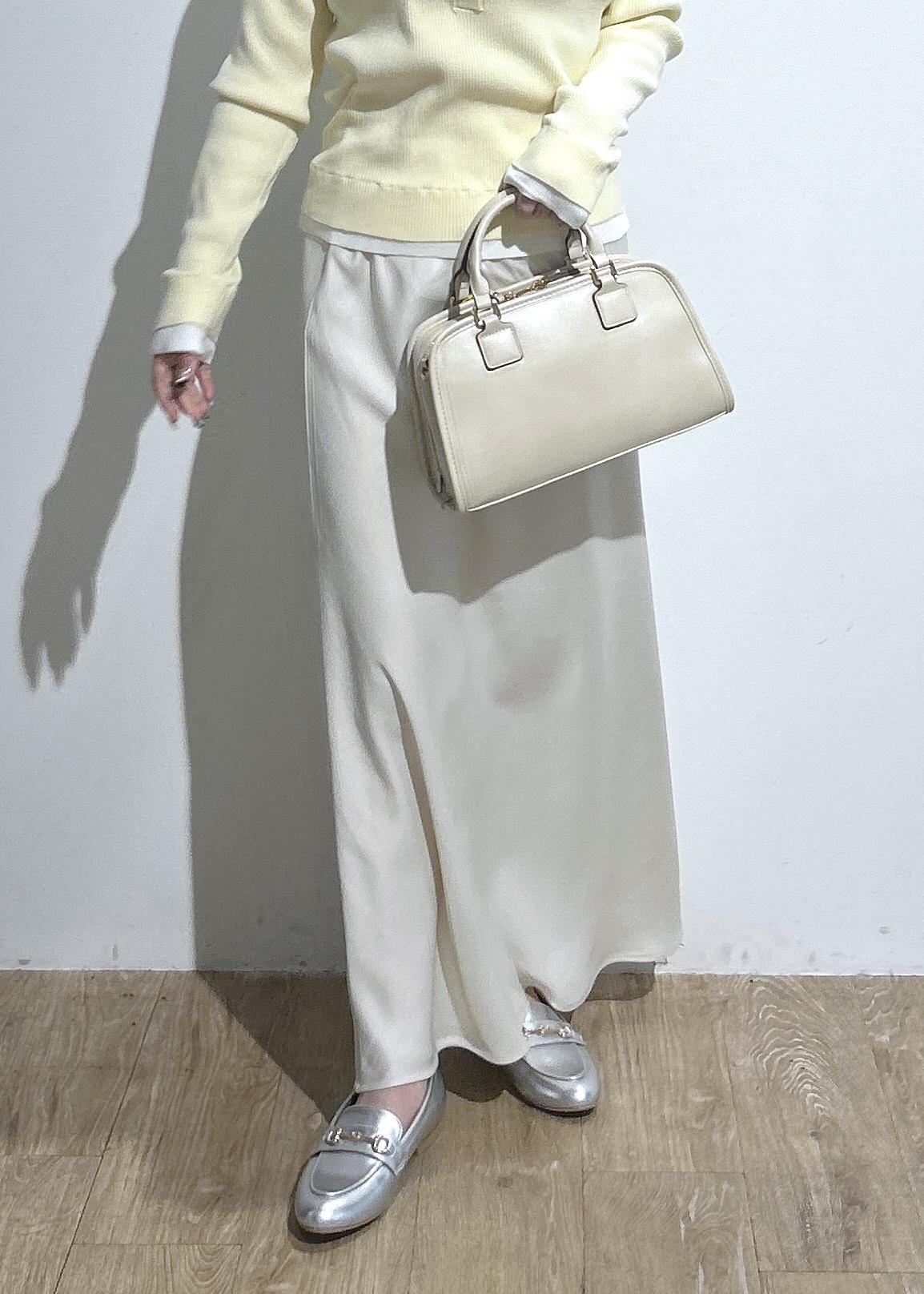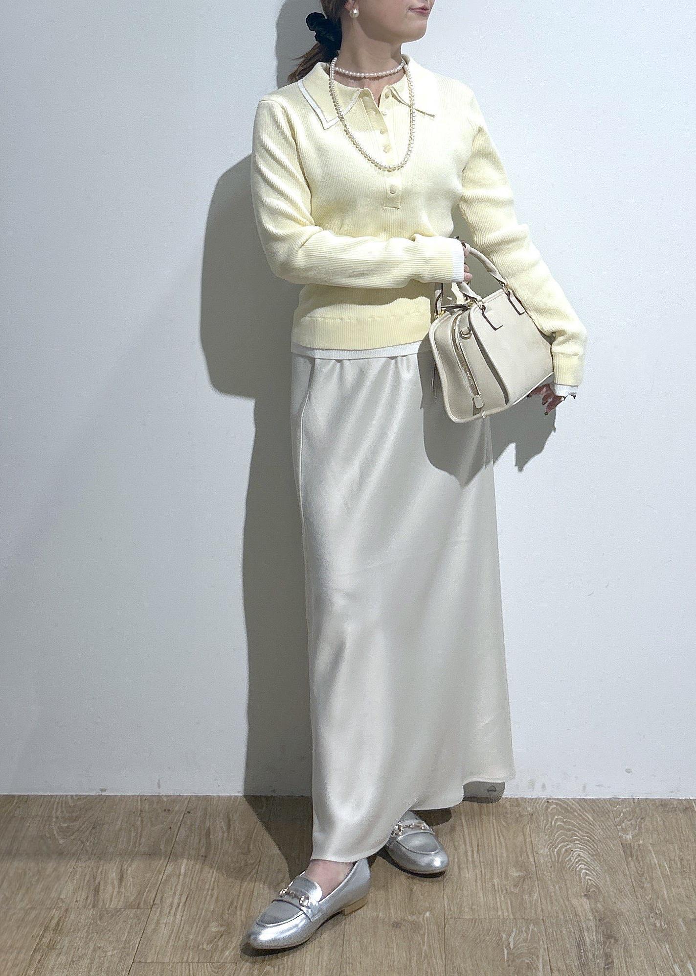ボトムはサテンスカートを合わせて少しフェミニン&上品な印象に♡