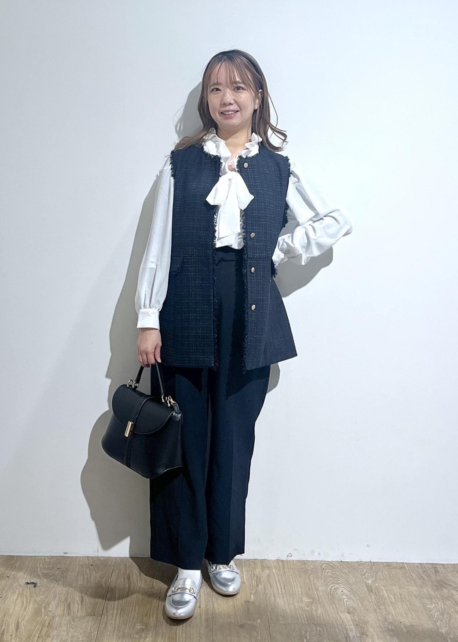 ポイントとなるウエストリボンは、リボンなしでラフに合わせたり、リボンタイ風にアレンジしたりと様々なスタイリングを楽しめます。