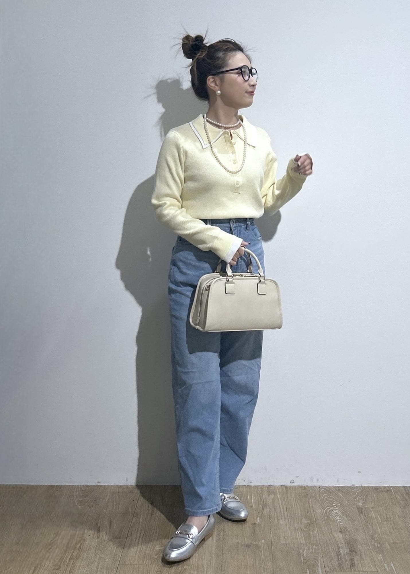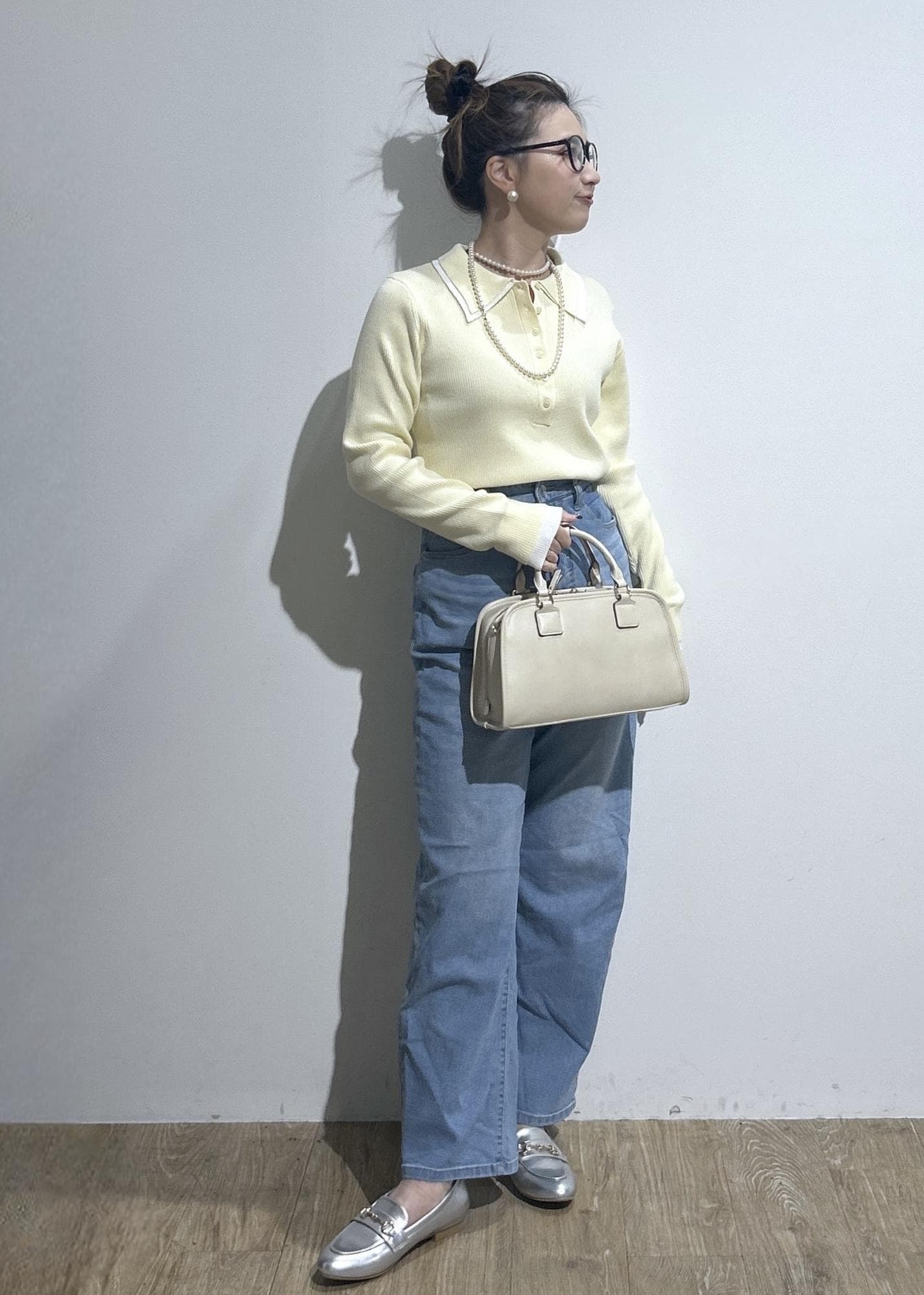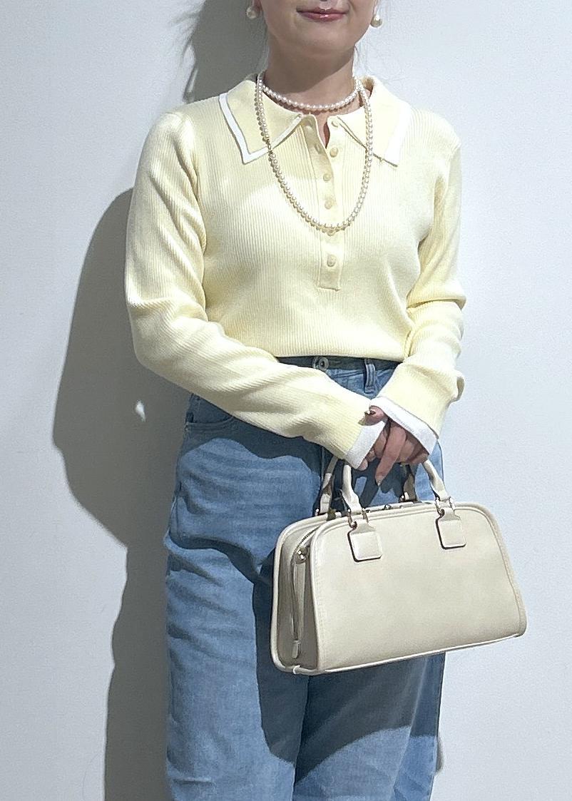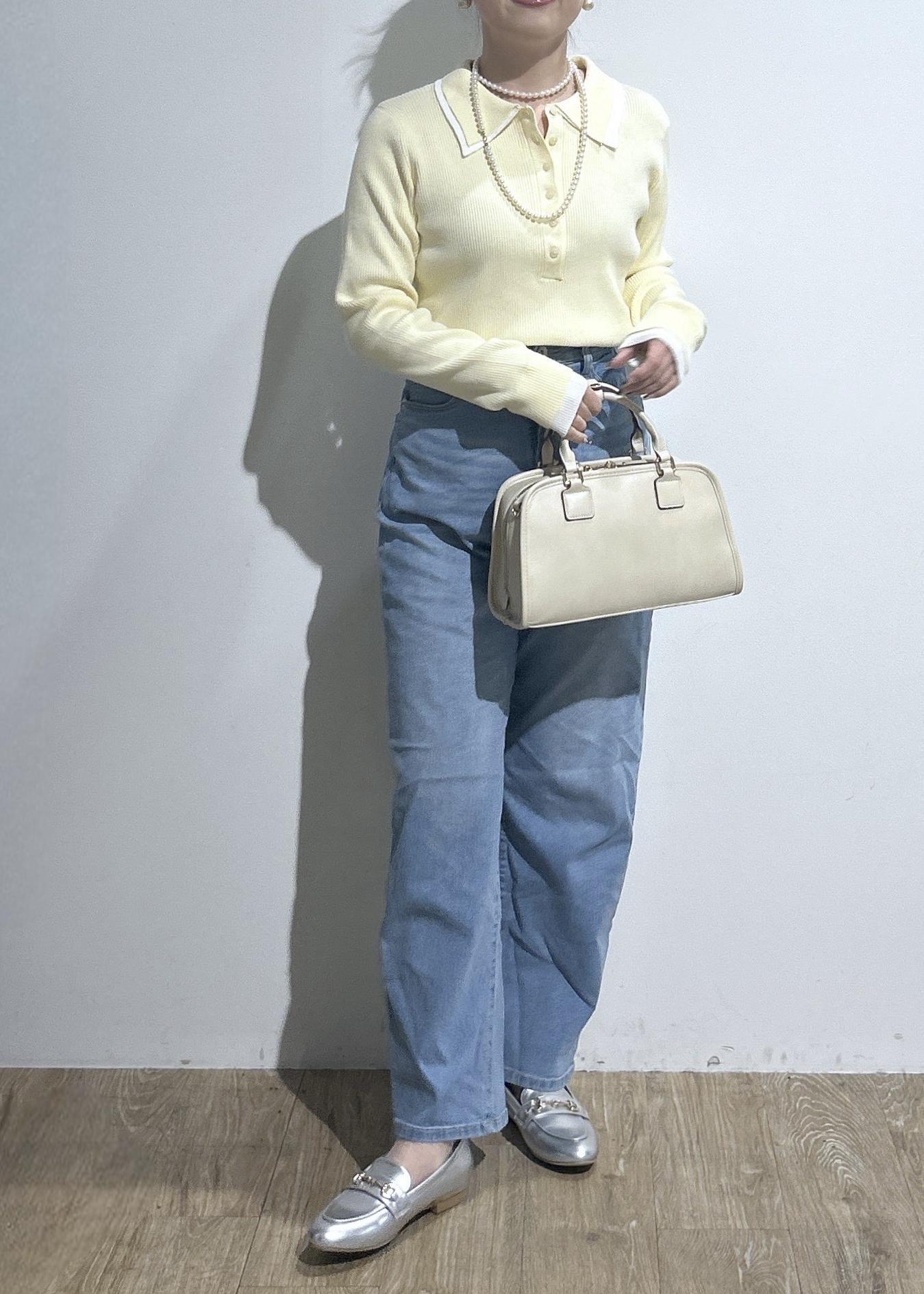 ポロシャツ風リブニット×色落ちデニムの春コーデ。
