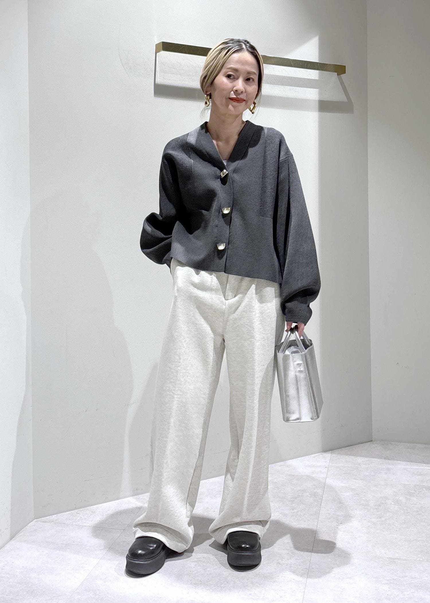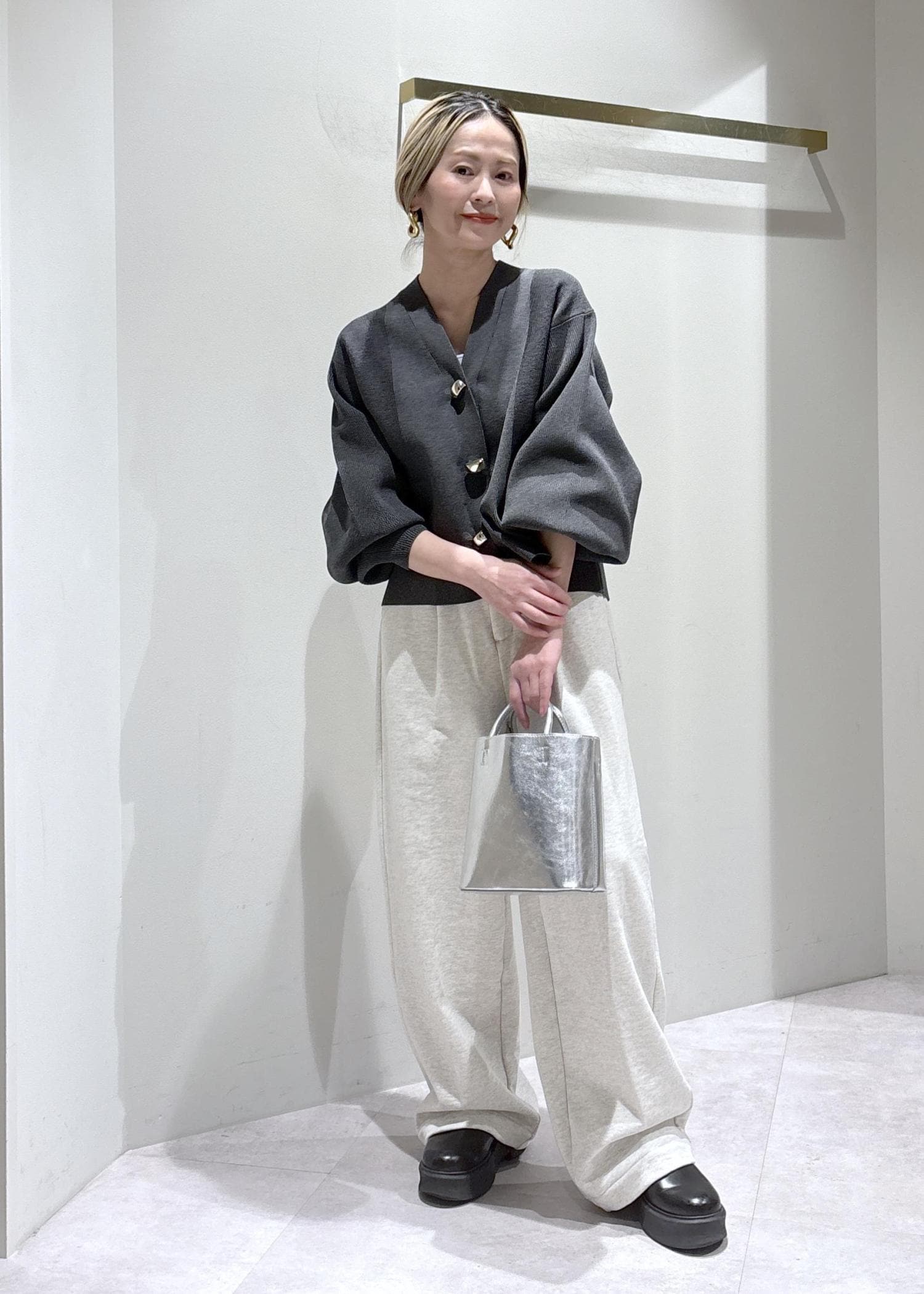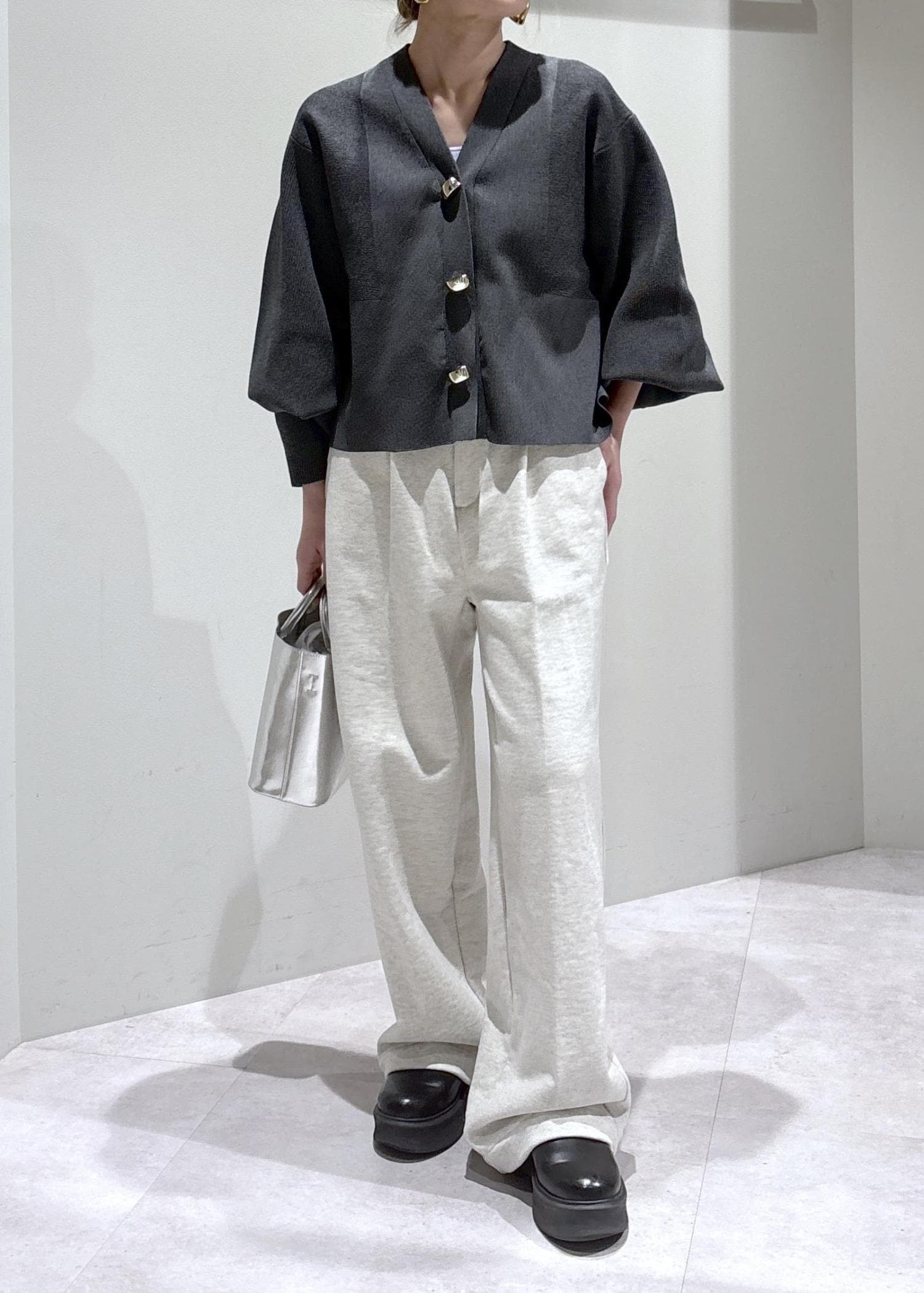 やや甘さのあるデザインなので、今回はスウェット素材のスラックスパンツでカジュアルダウンしたスタイルにしてみました。