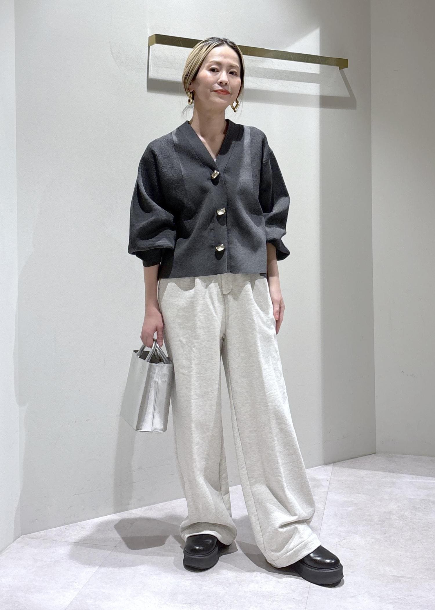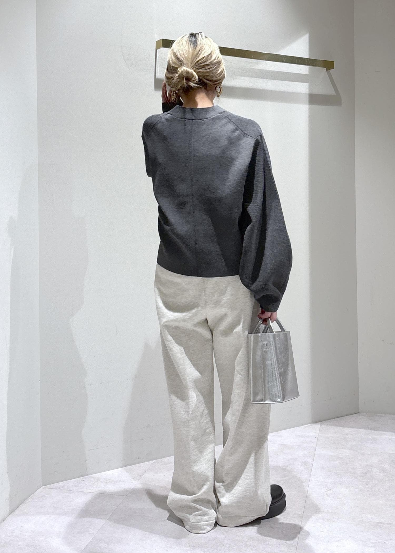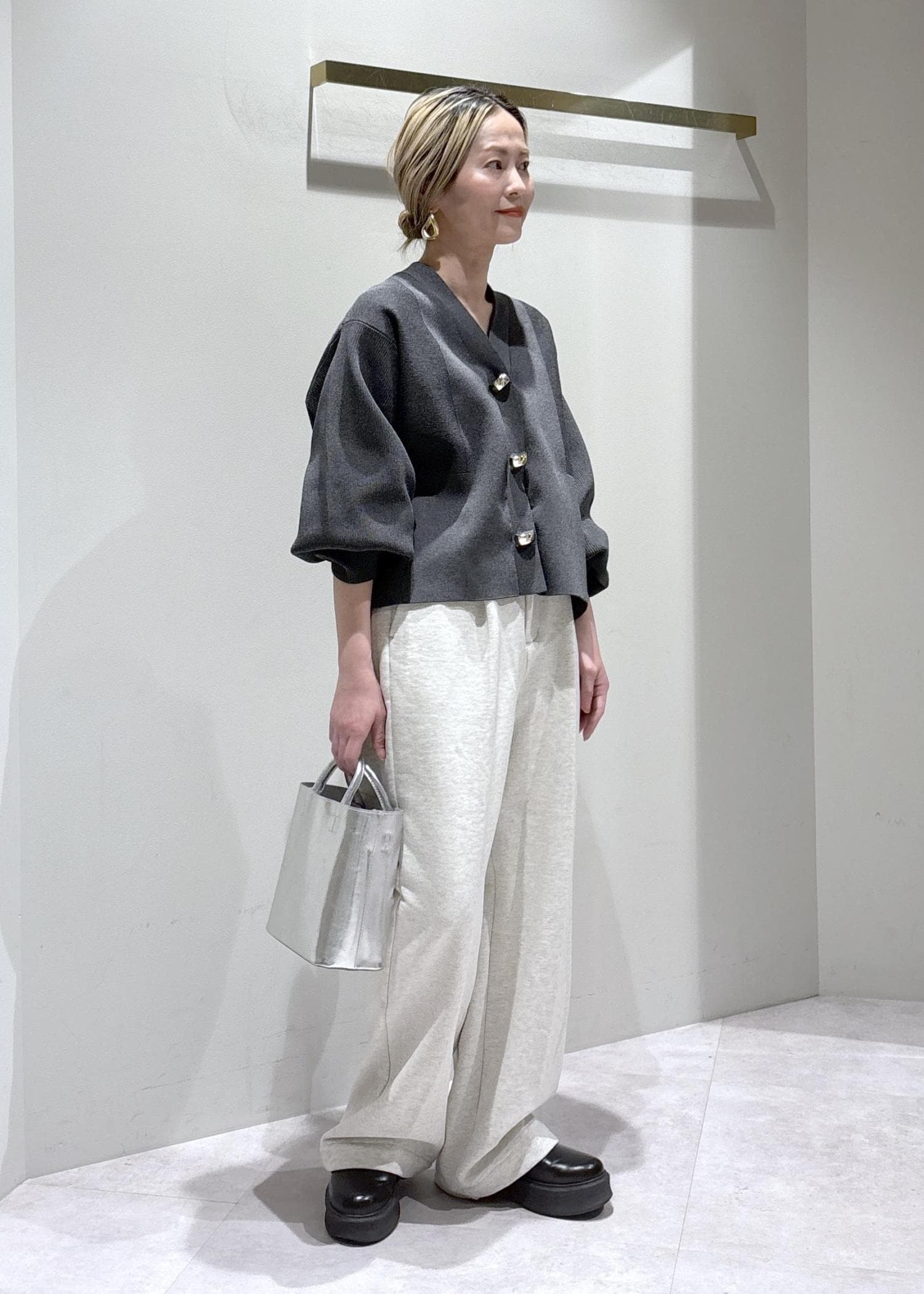 やや甘さのあるデザインなので、今回はスウェット素材のスラックスパンツでカジュアルダウンしたスタイルにしてみました。