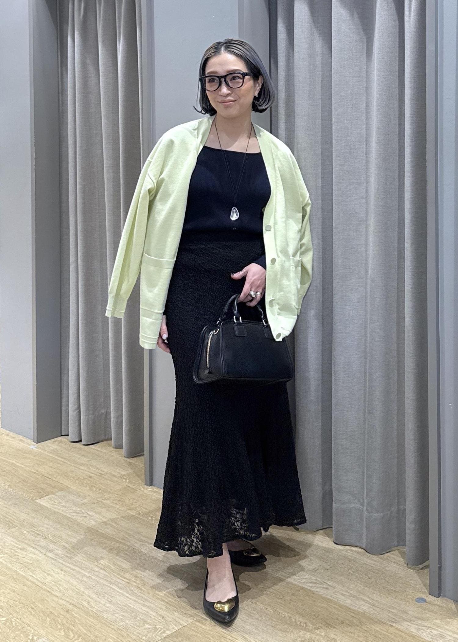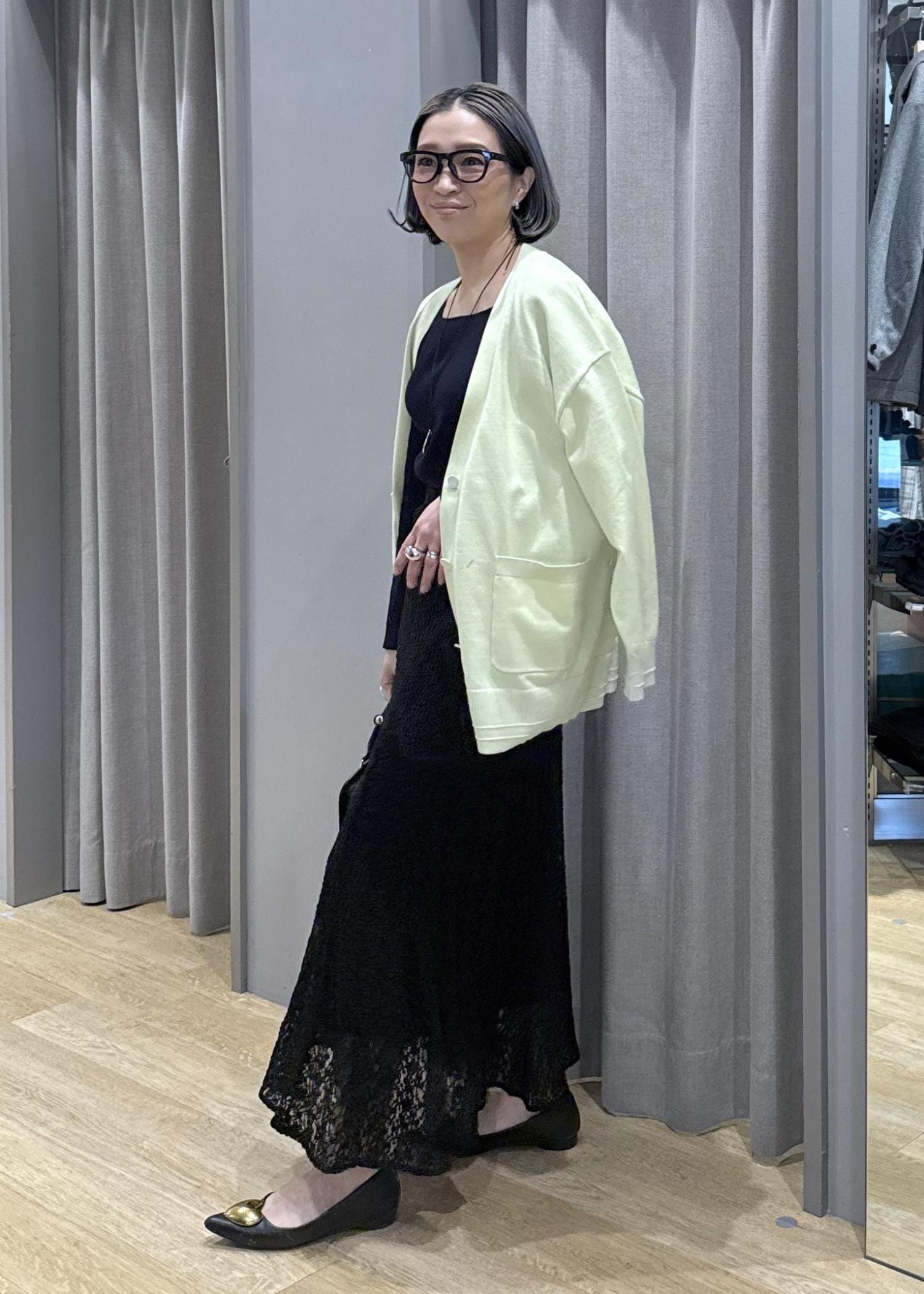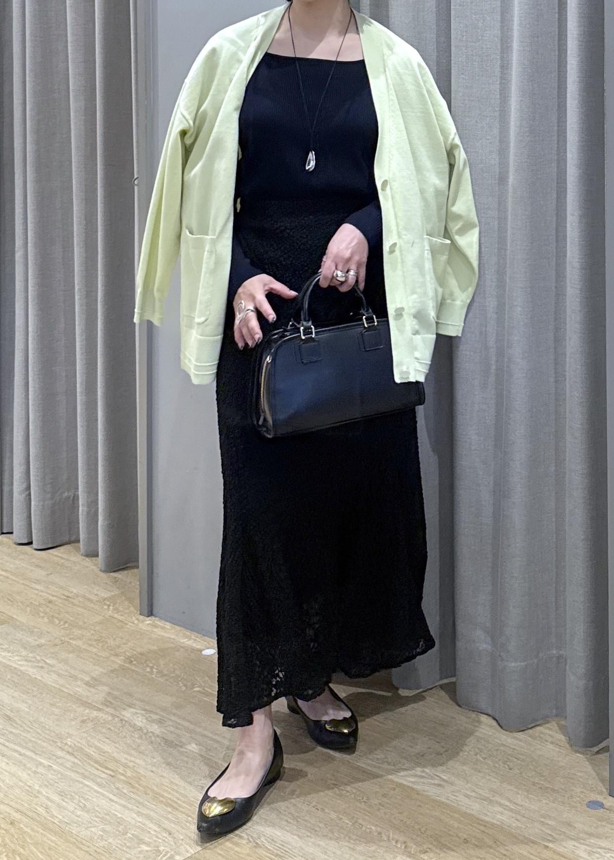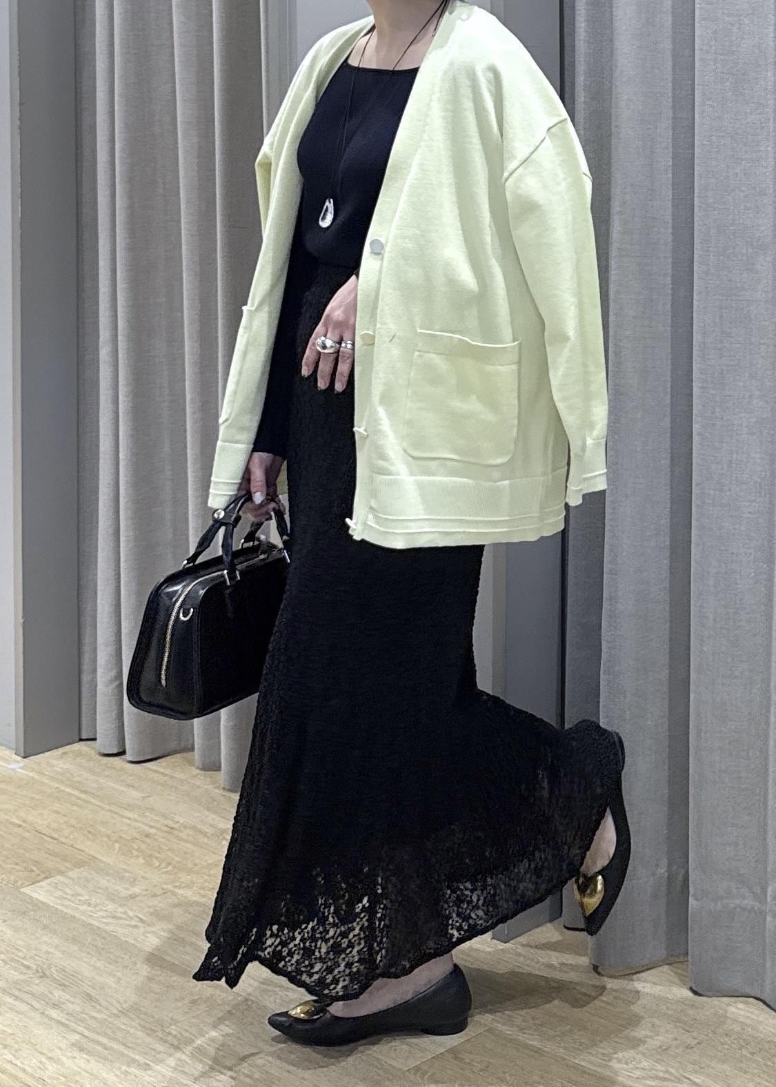 カーディガンのカラーをより引き立てたモードなスタイリングにしました♪