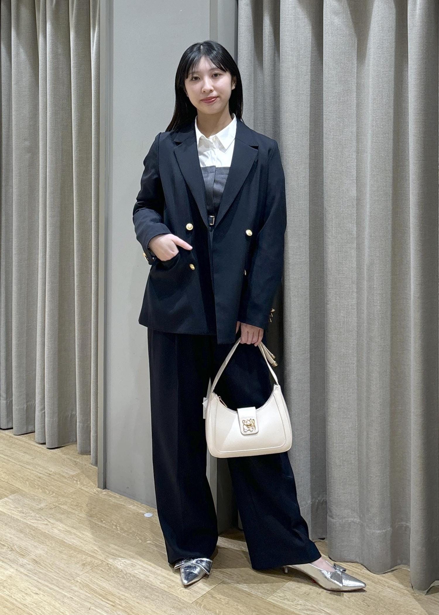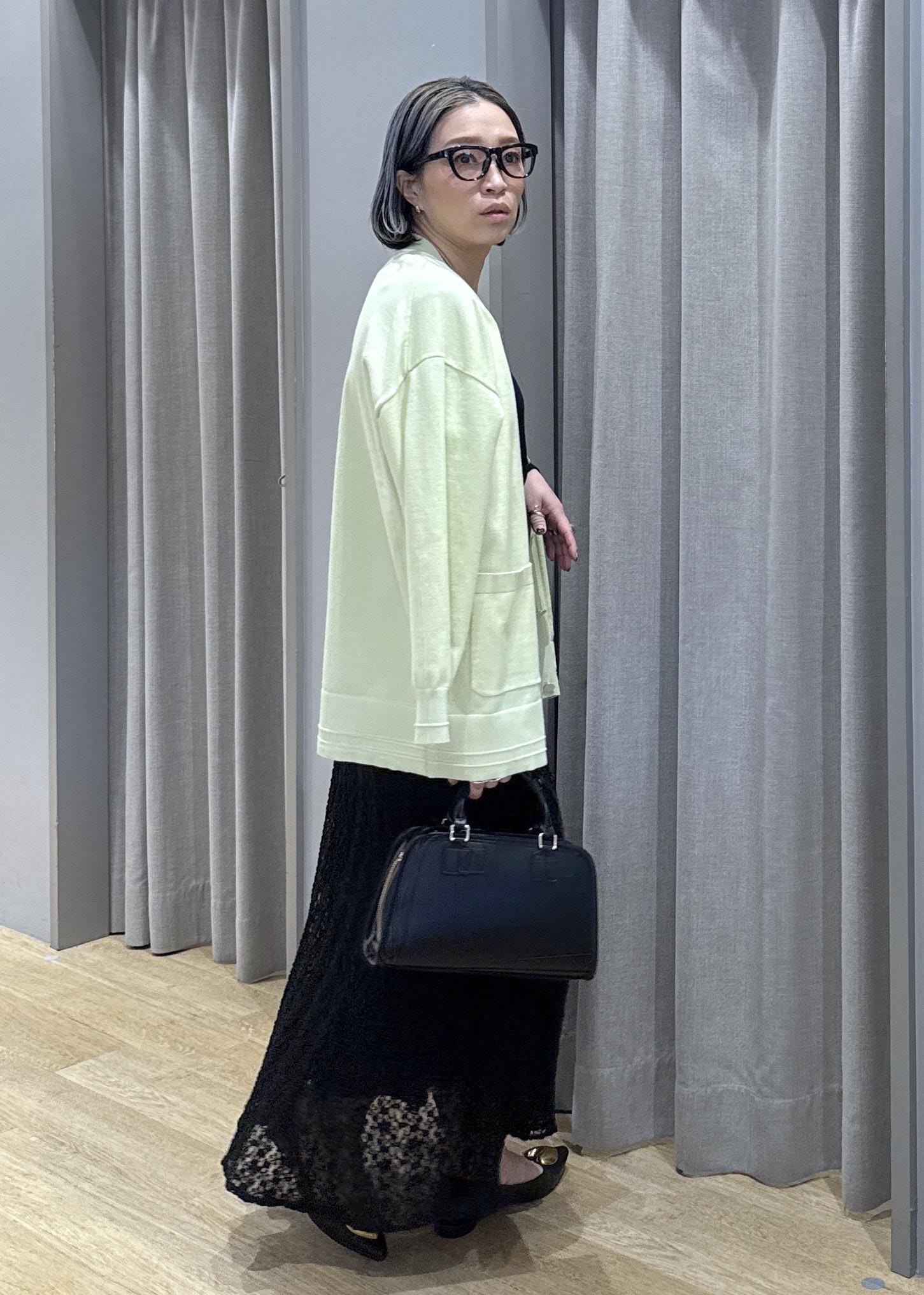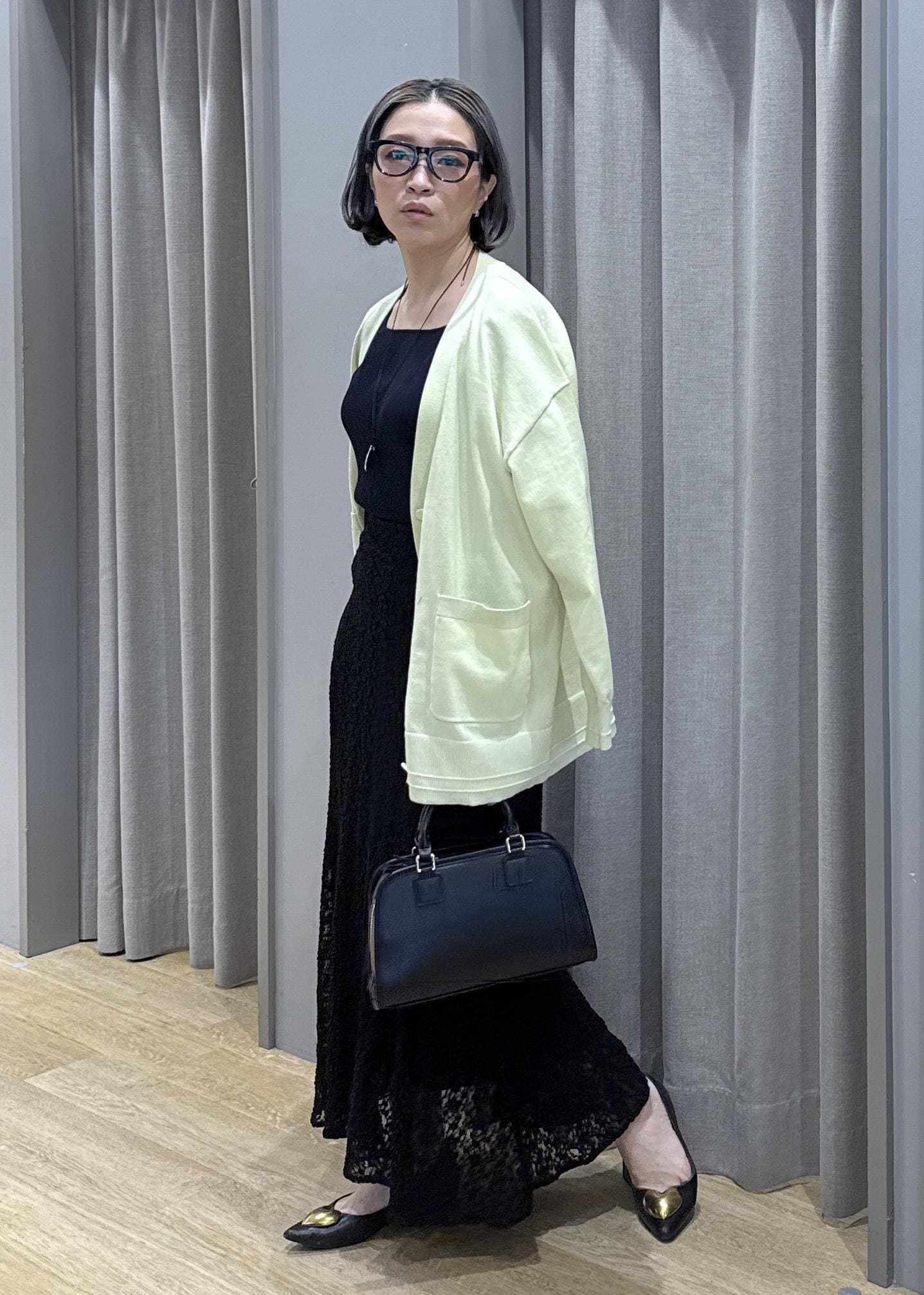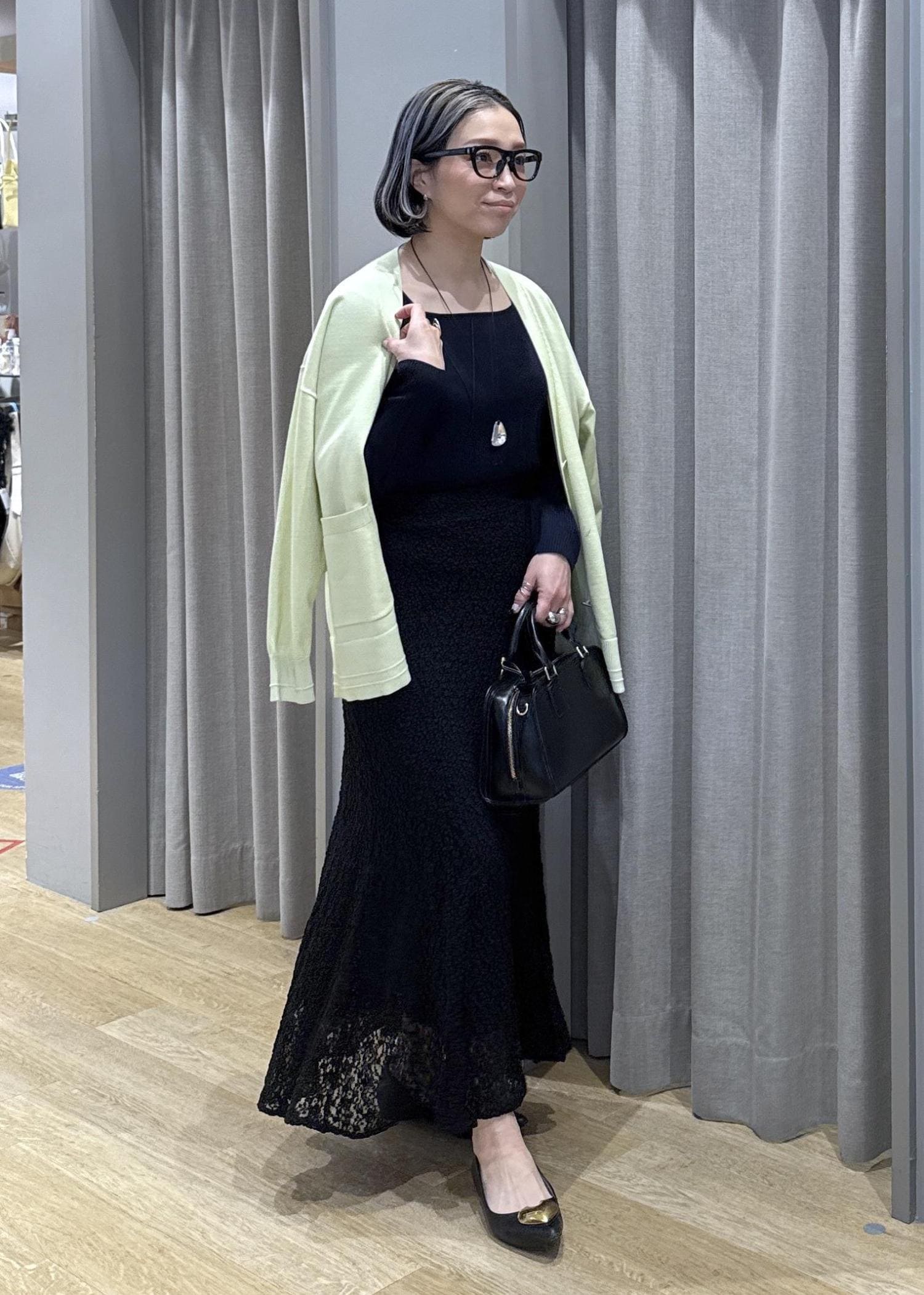 カーディガンのカラーをより引き立てたモードなスタイリングにしました♪