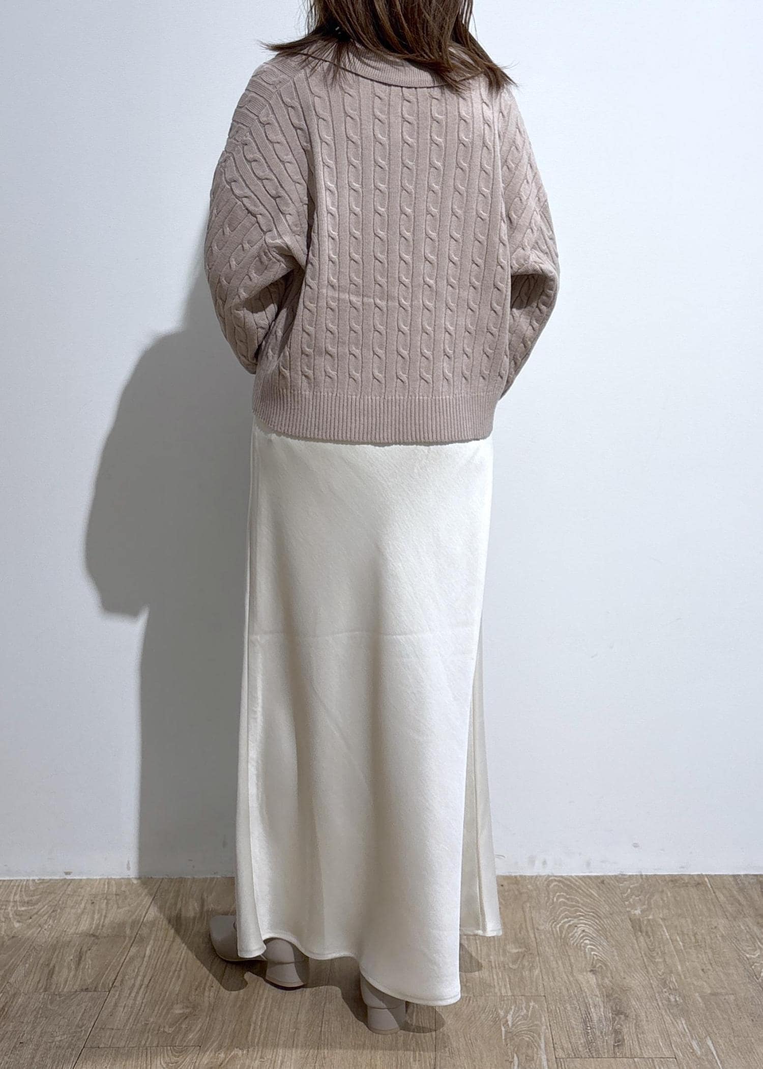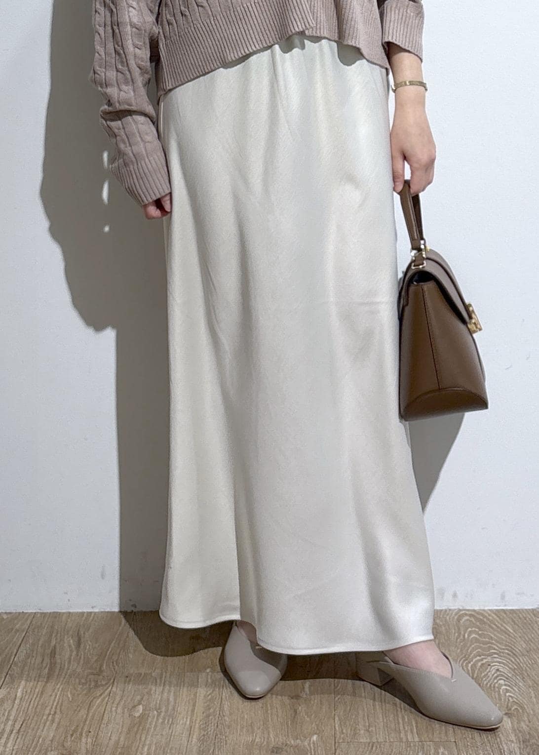サテンスカートは程よい光沢感で、やや肉厚素材のすとんと落ちるシルエットなので大人っぽく着用できます。