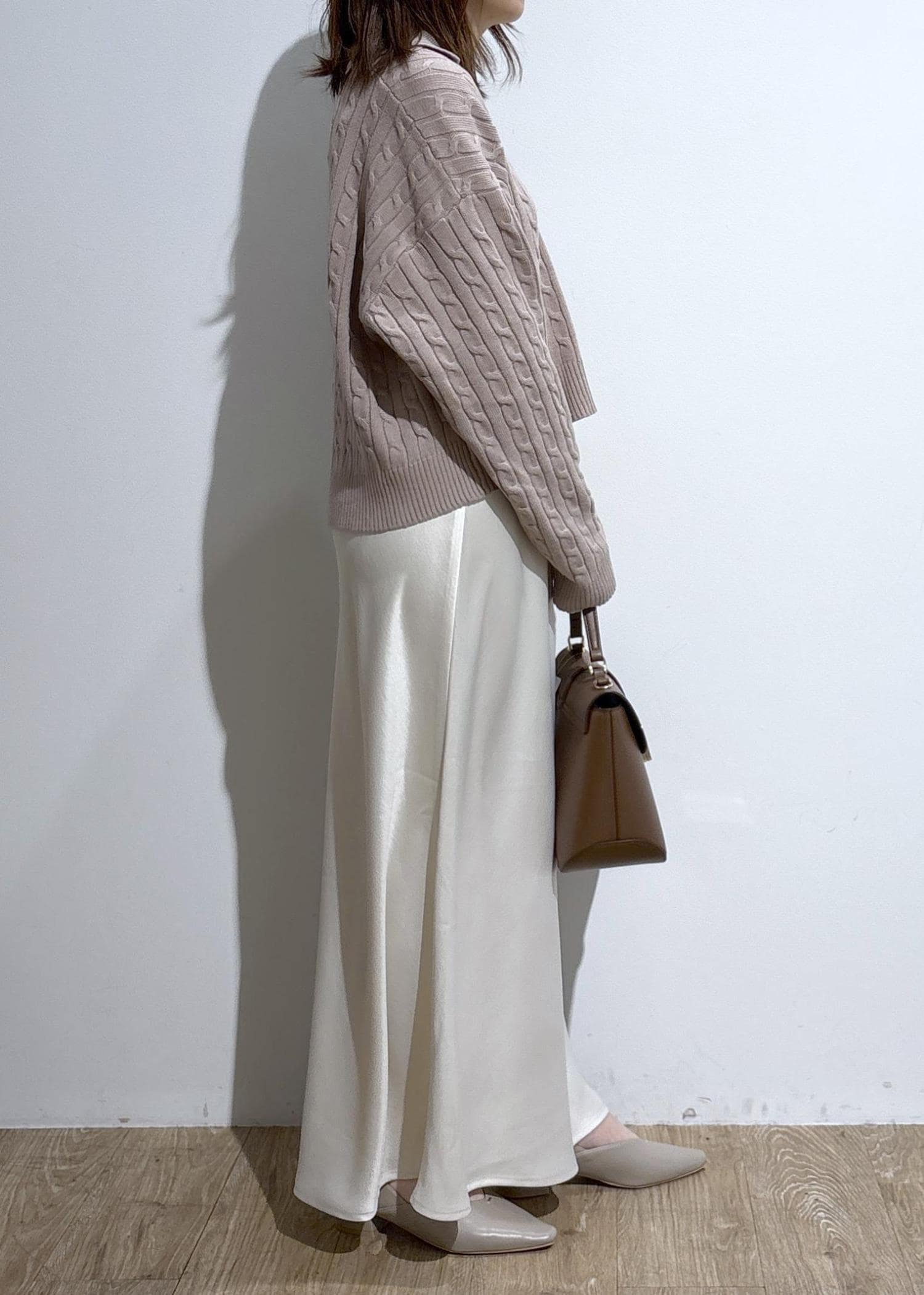 クロップド丈なのでワイドパンツや、程良く広がりのあるスカートにもバランス良く着用できます。 -