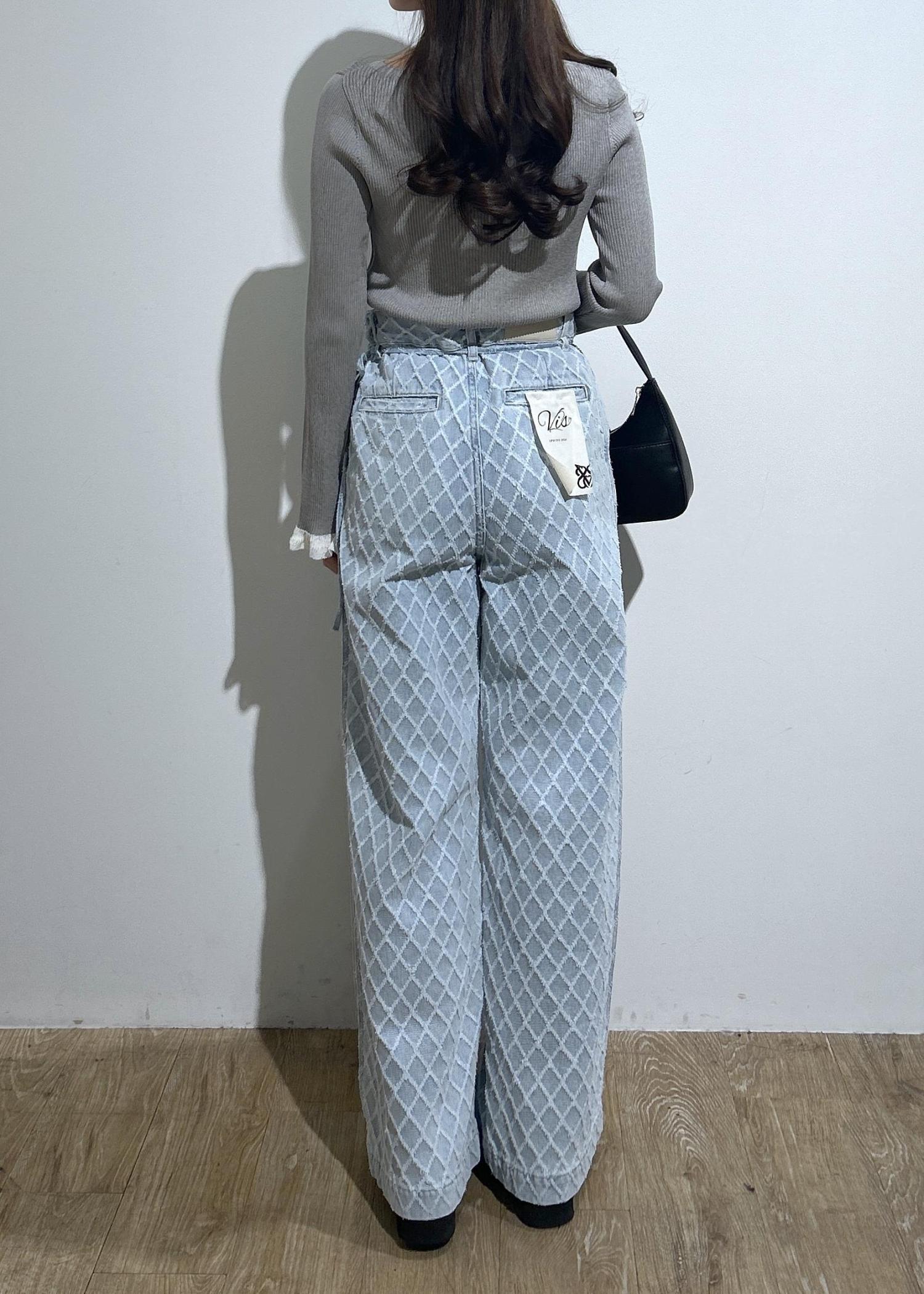 VISベルト付きワイドシルエットデニムパンツブルー系 / M¥8,899レビュー身長158㎝でMサイズを着用しています。ウエストは大きいのですが丈を重視したい為、Mを着用しました。同じ生地の細リボンでウエストを絞っています。キルティング風の柄で可愛いです◎