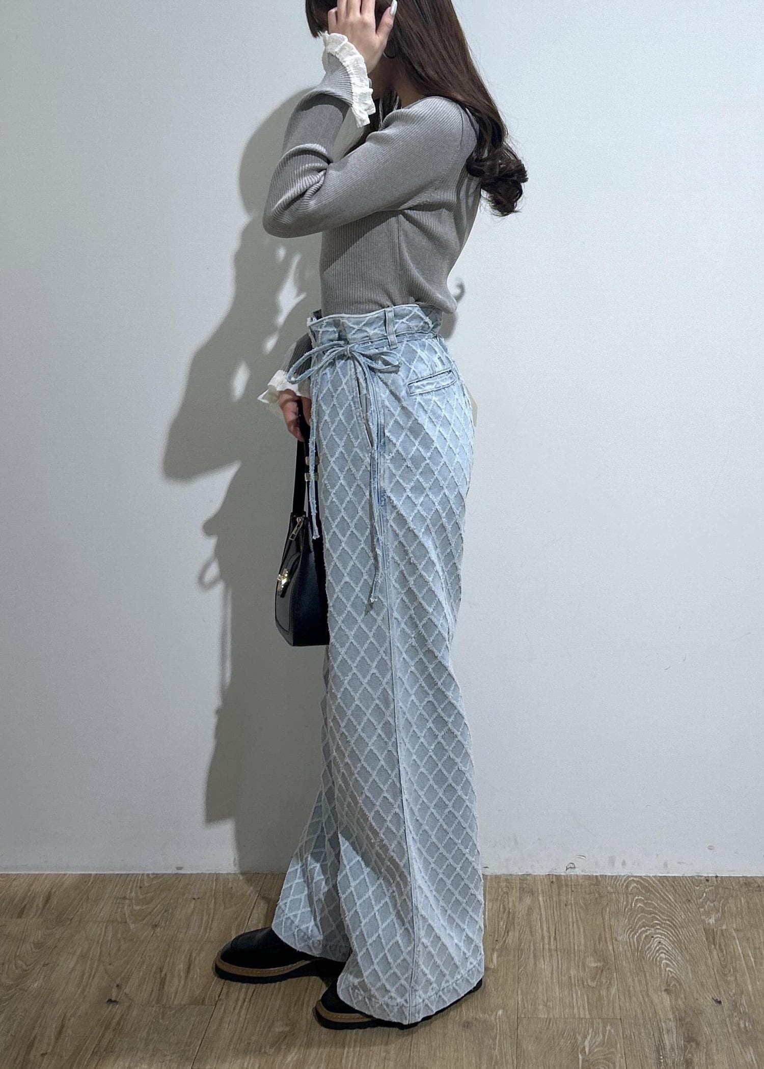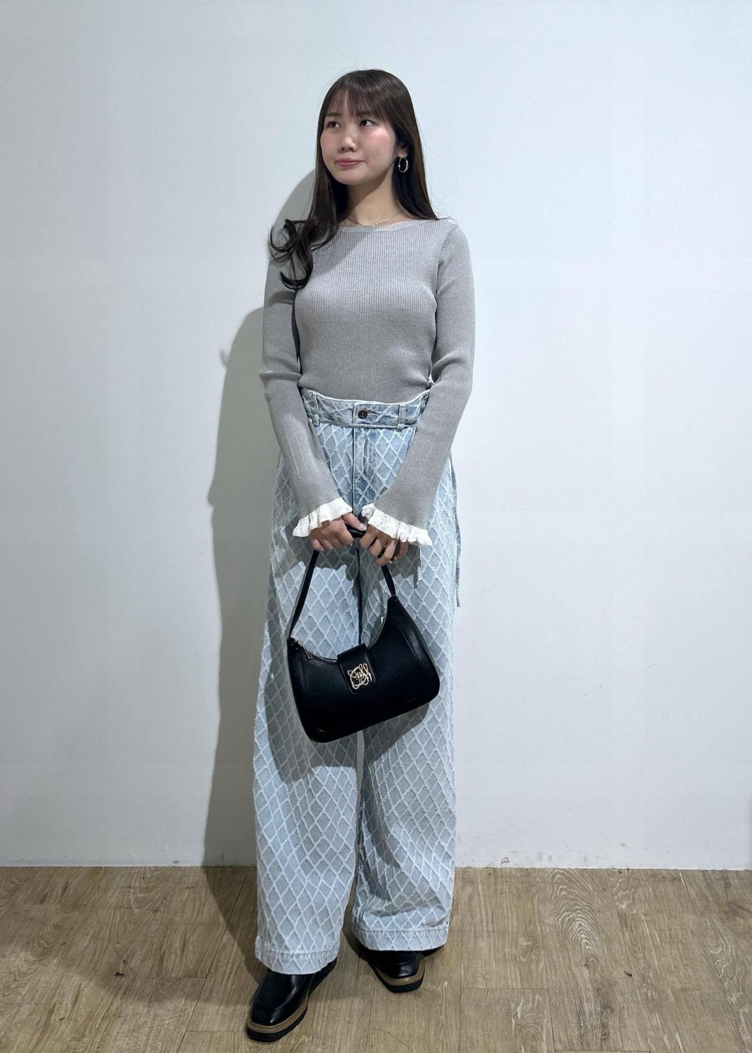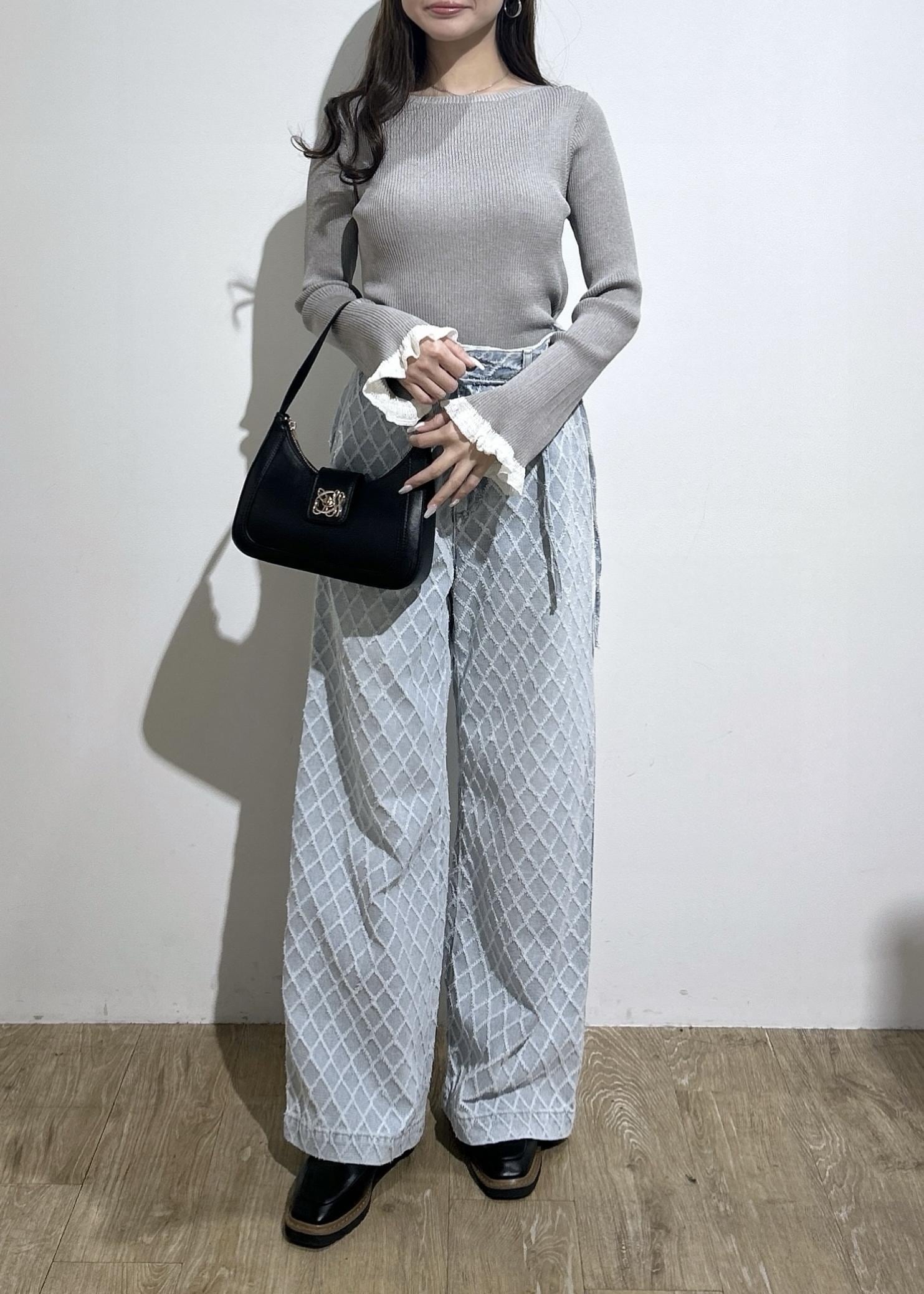 グレーのトップスの袖フリルのさりげない甘さと薄ブルーの細リボン付きワイドデニムパンツを合わせてフェミニンカジュアルコーデにしてみました◎バッグとローファーはブラックでまとめてみました。