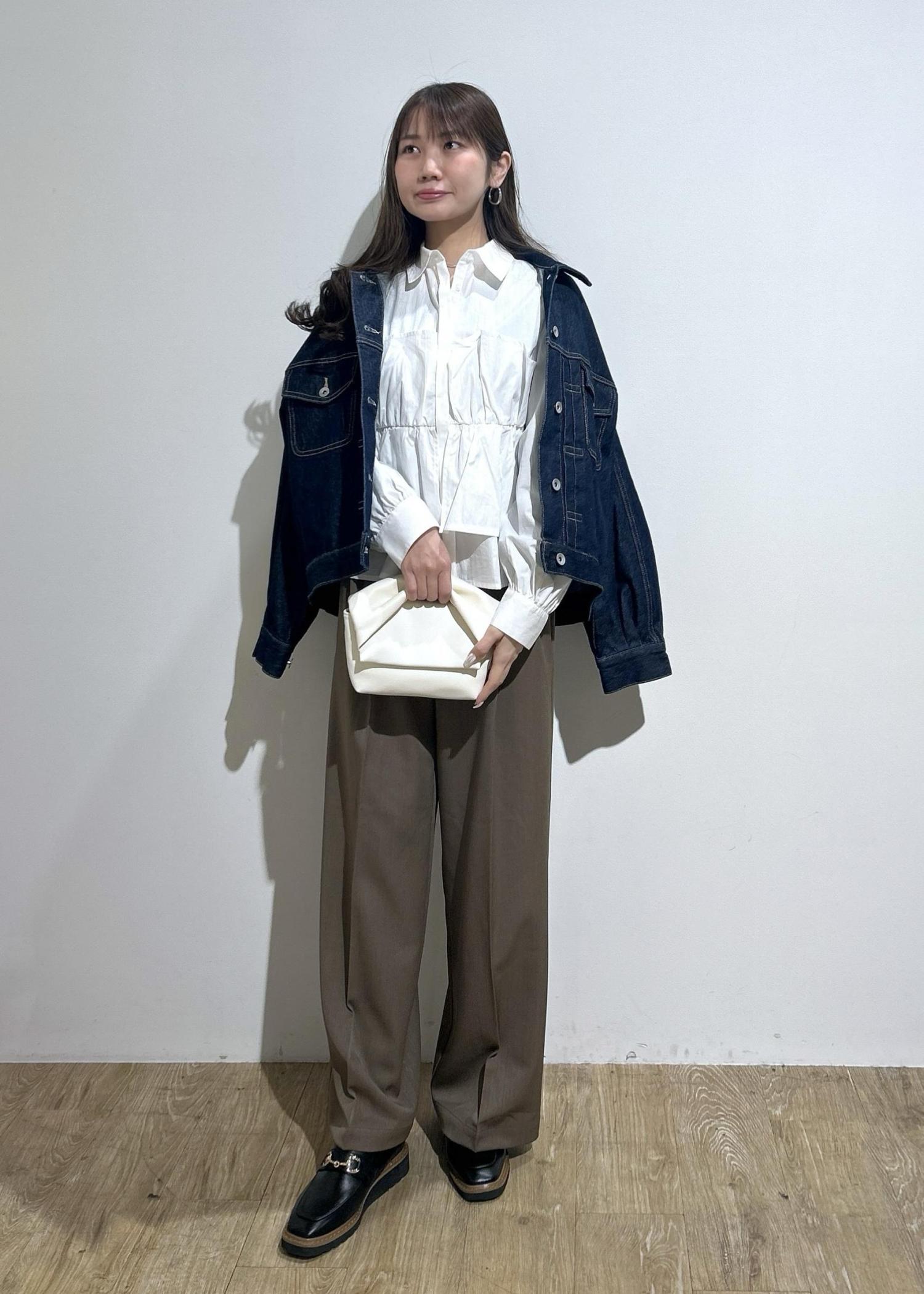 一枚で着映えするビスチェシャツにベルト付きスラックスを合わせてきれいめコーデに仕上げました。デニムジャケットを羽織るとカジュアル感をプラスできます◎