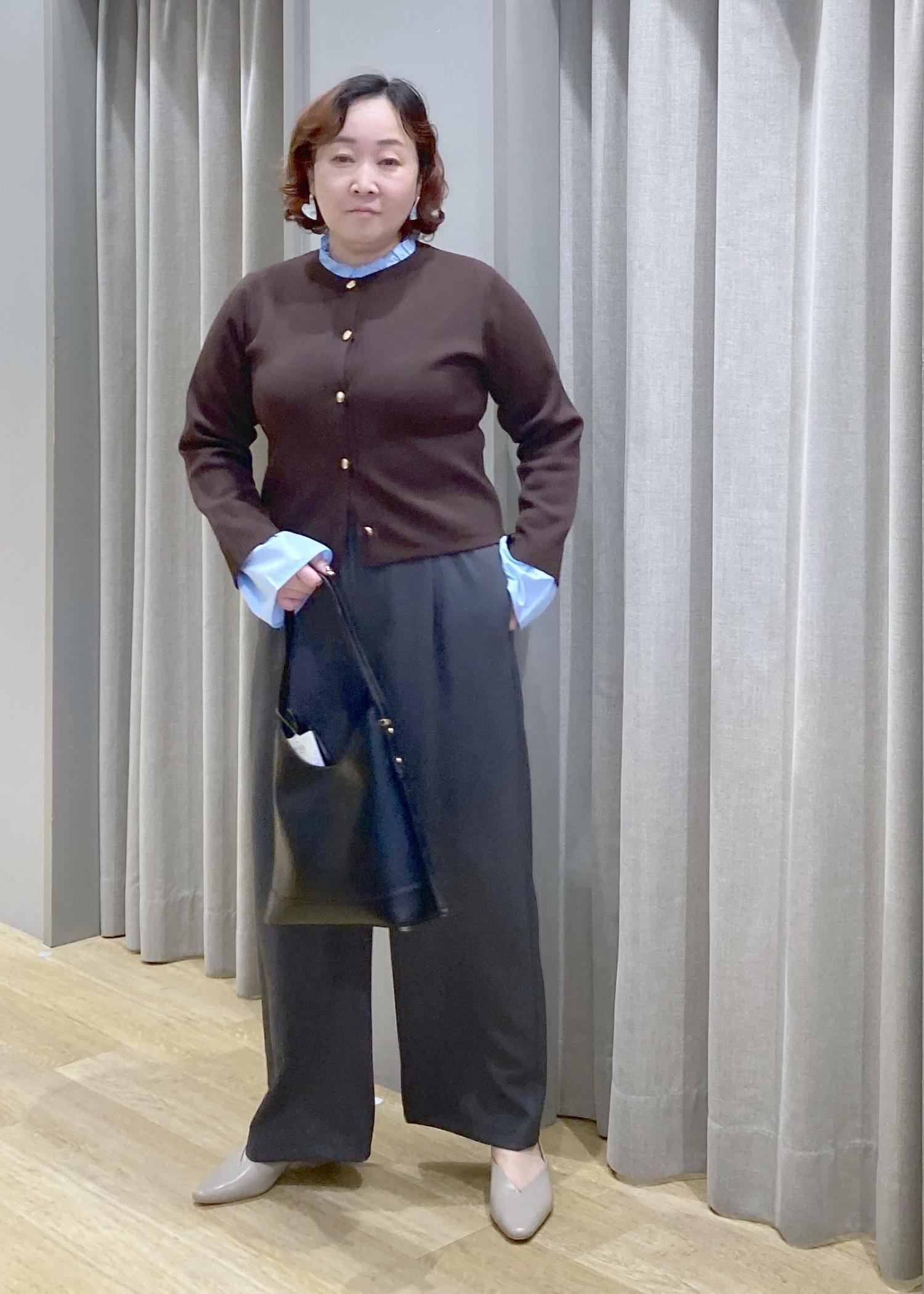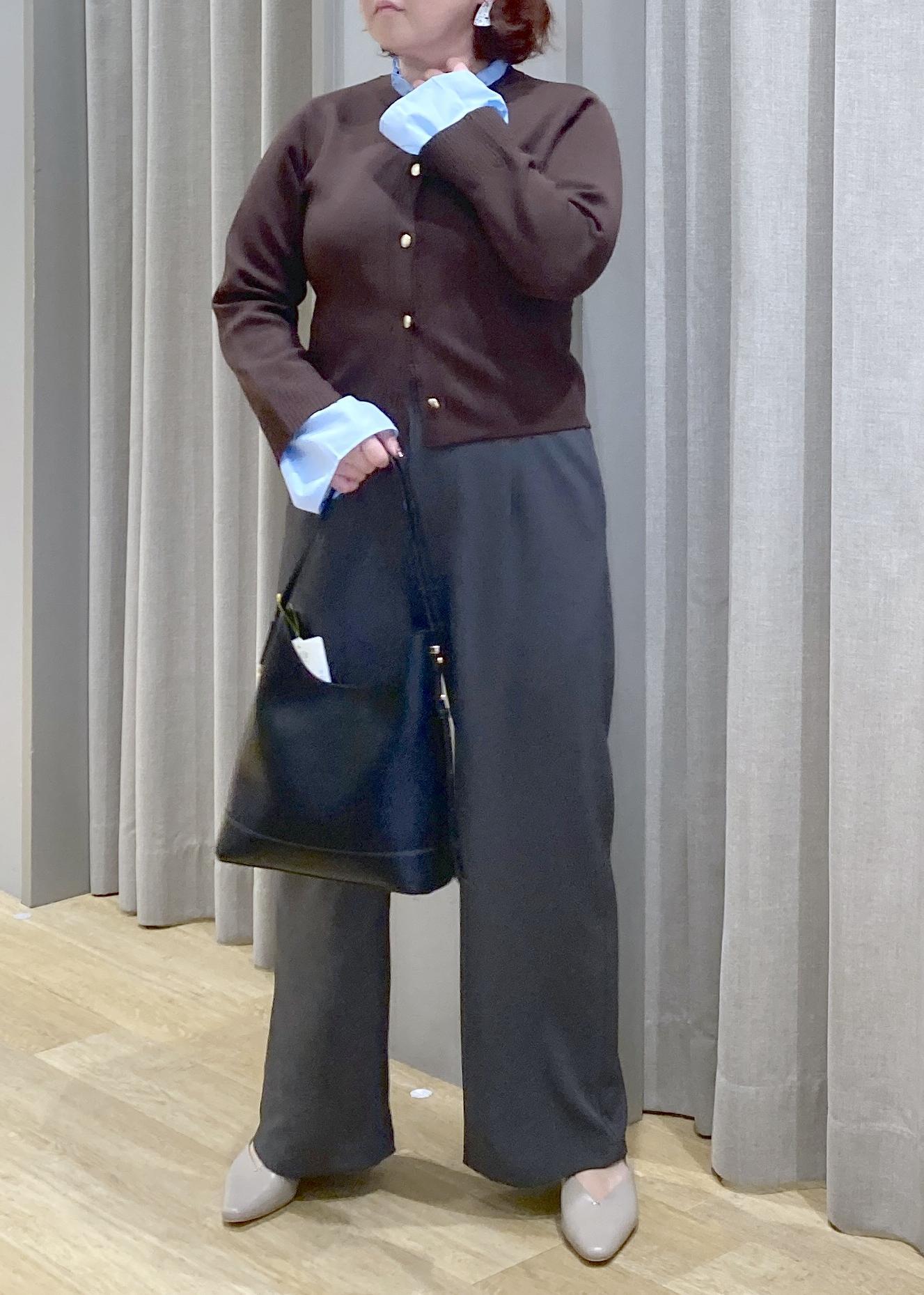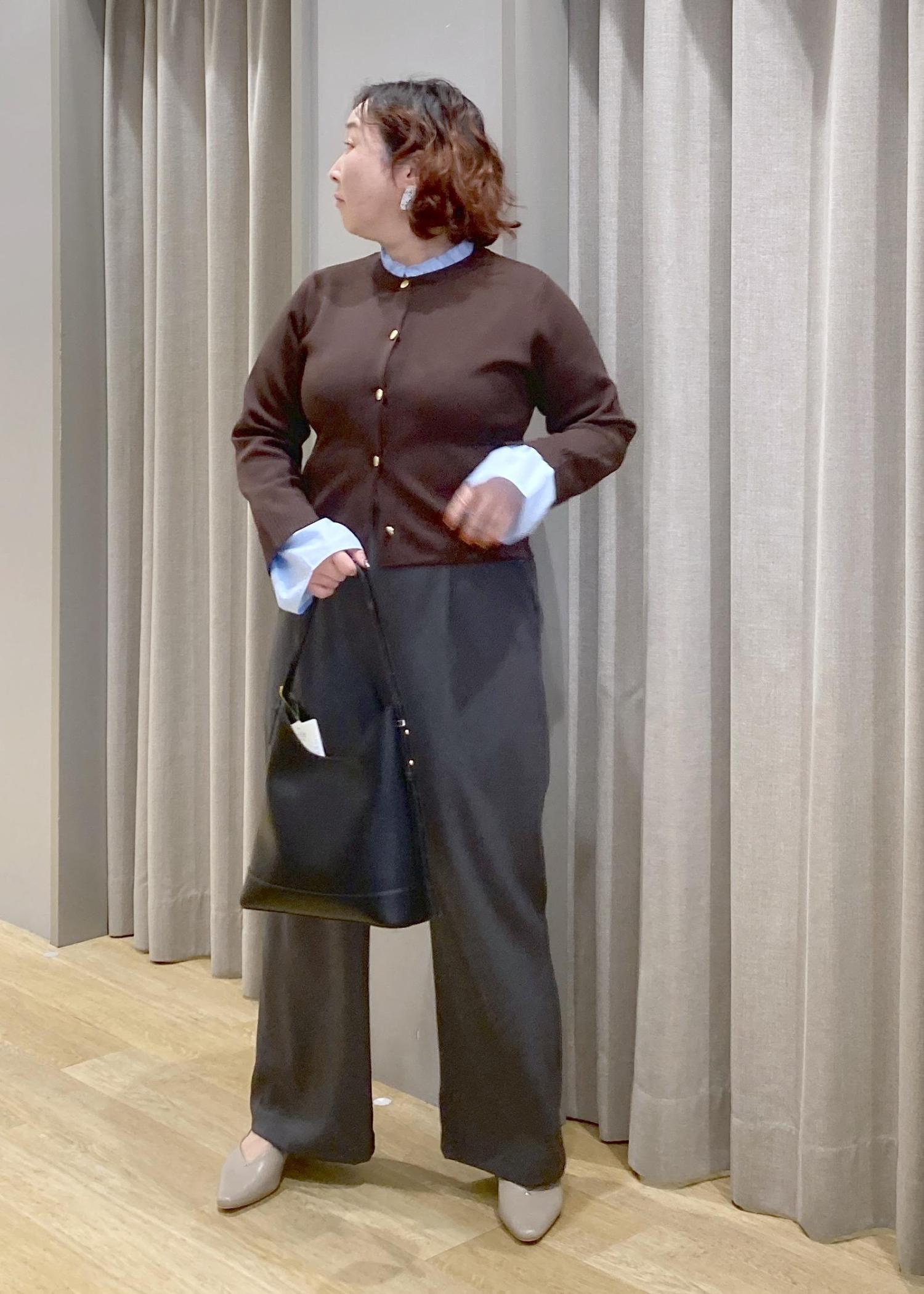 コンパクトなカーデにシャツをレイヤードしたようなデザインが、きちんと感もプラス◎