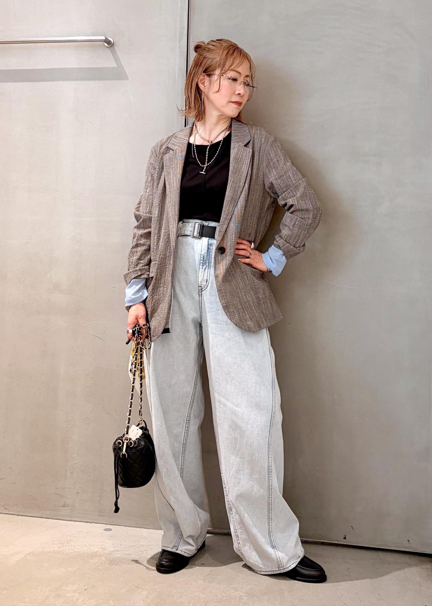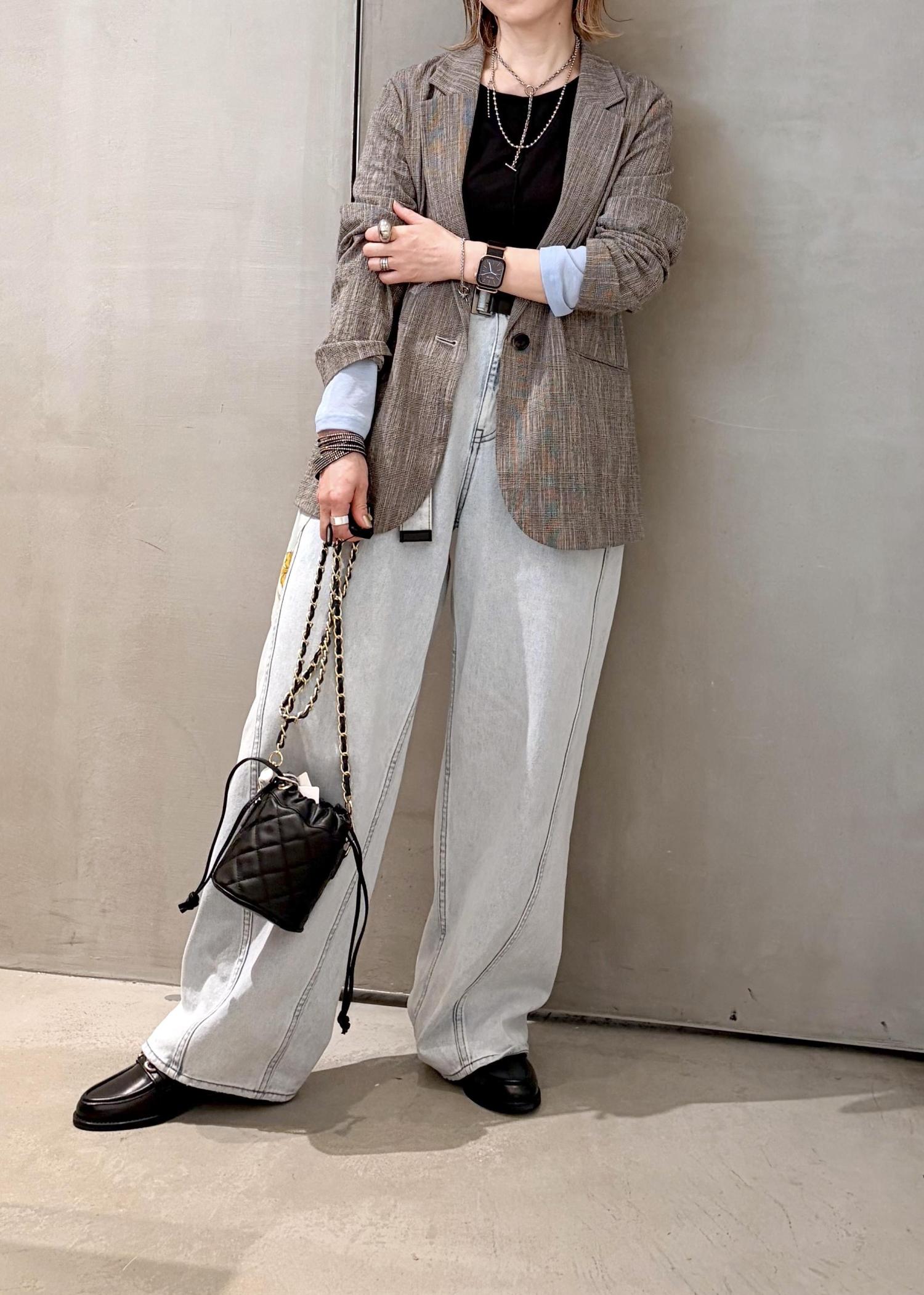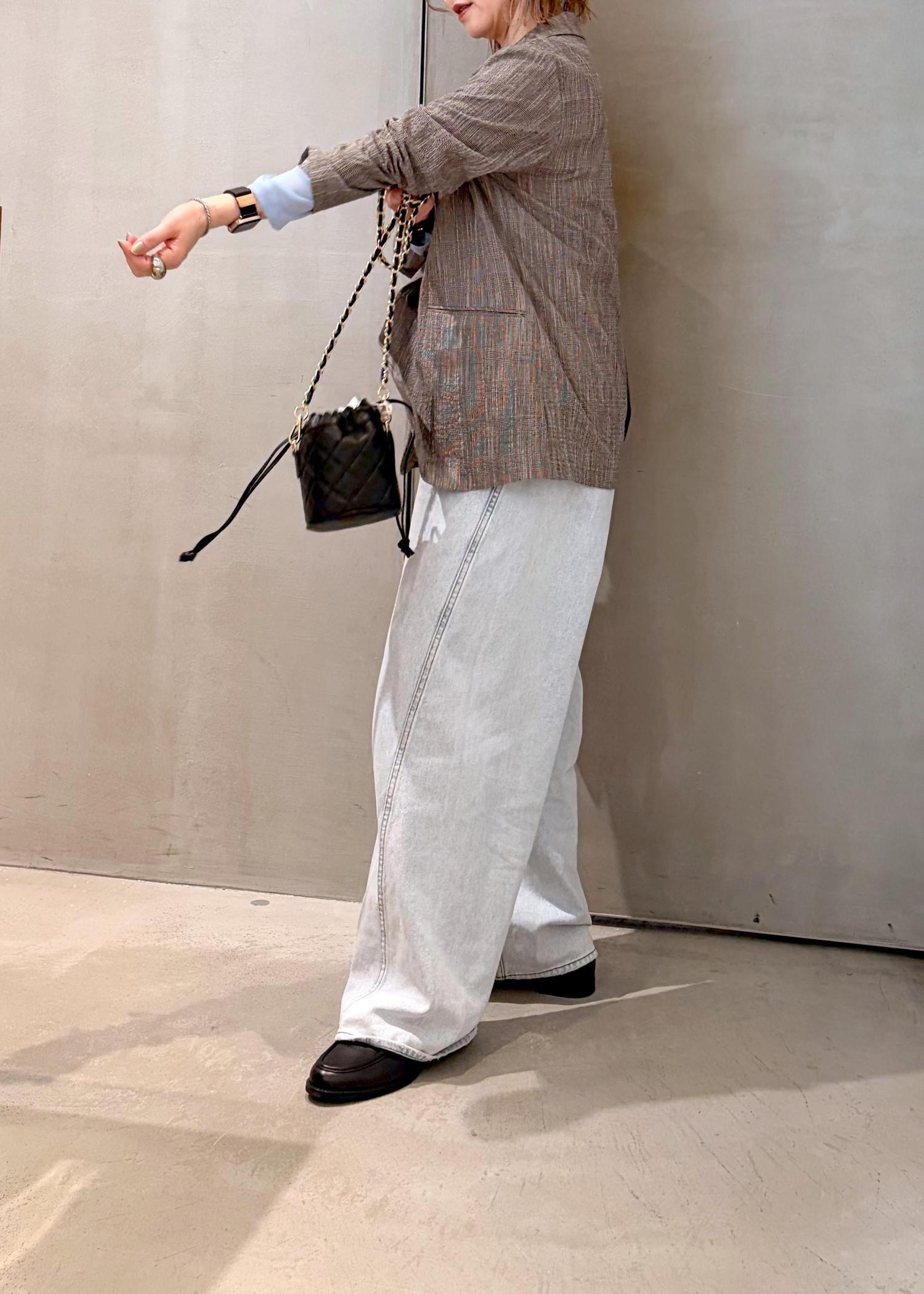 肌触りの軽いジャケットをデニムに合わせて、差し色にライトブルーを取り入れ、春のジャケットコーデにしました。