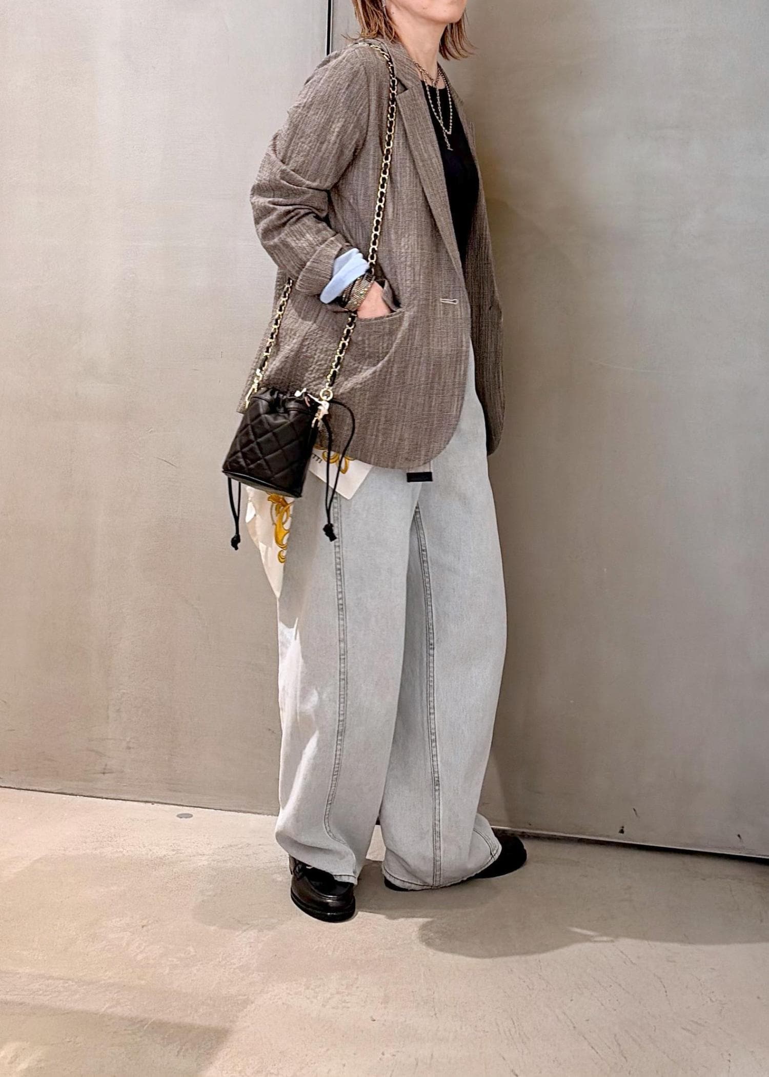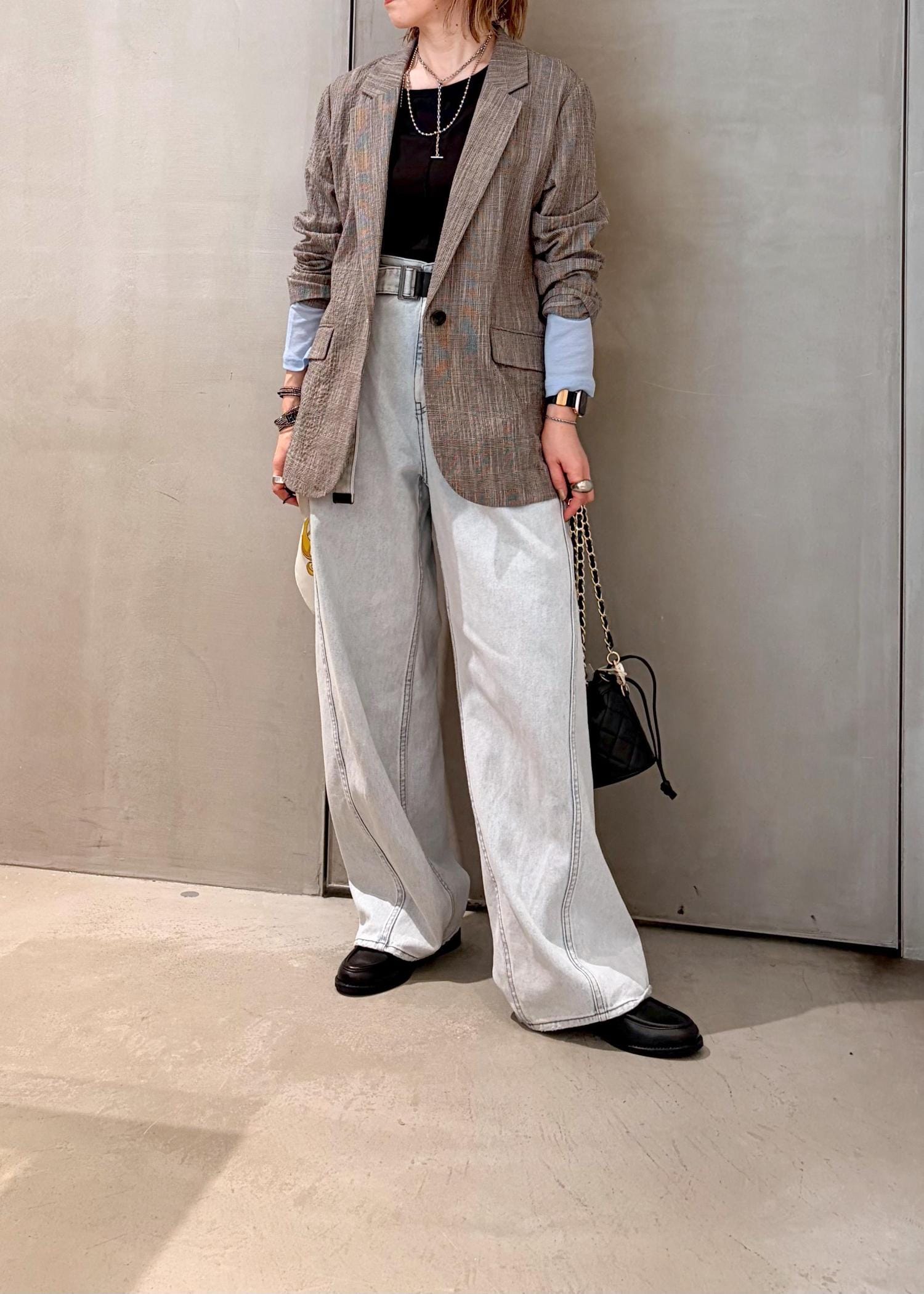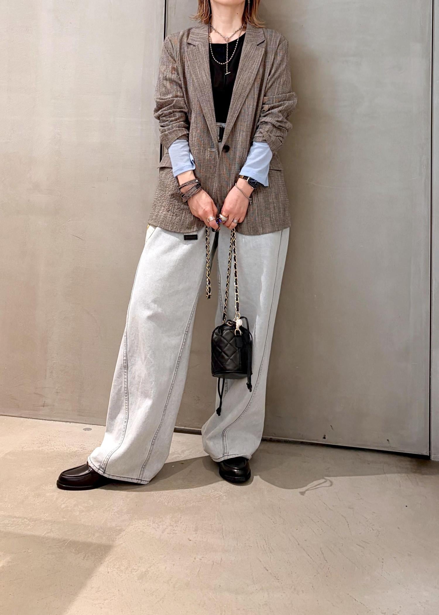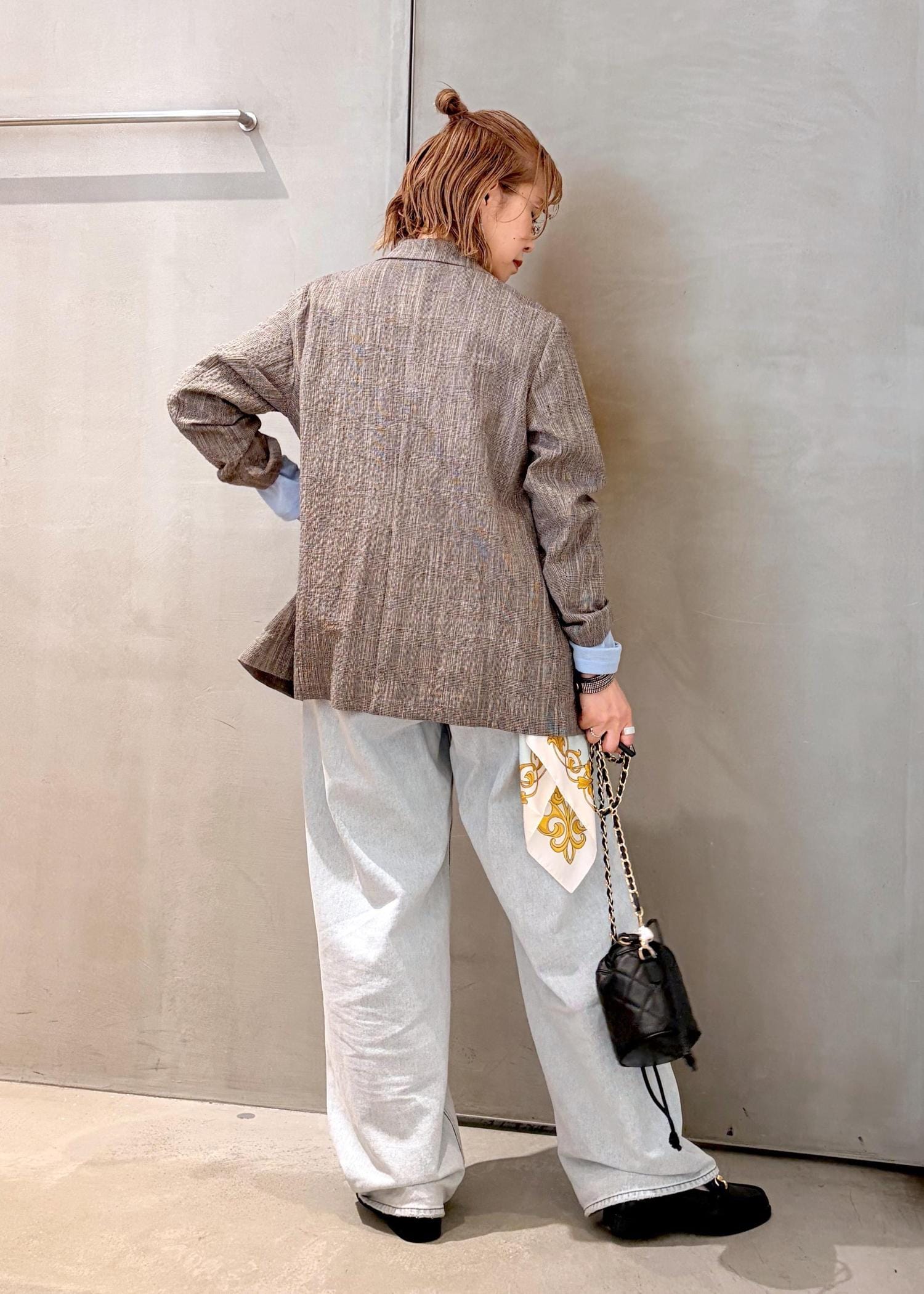 肌触りの軽いジャケットをデニムに合わせて、差し色にライトブルーを取り入れ、春のジャケットコーデにしました。