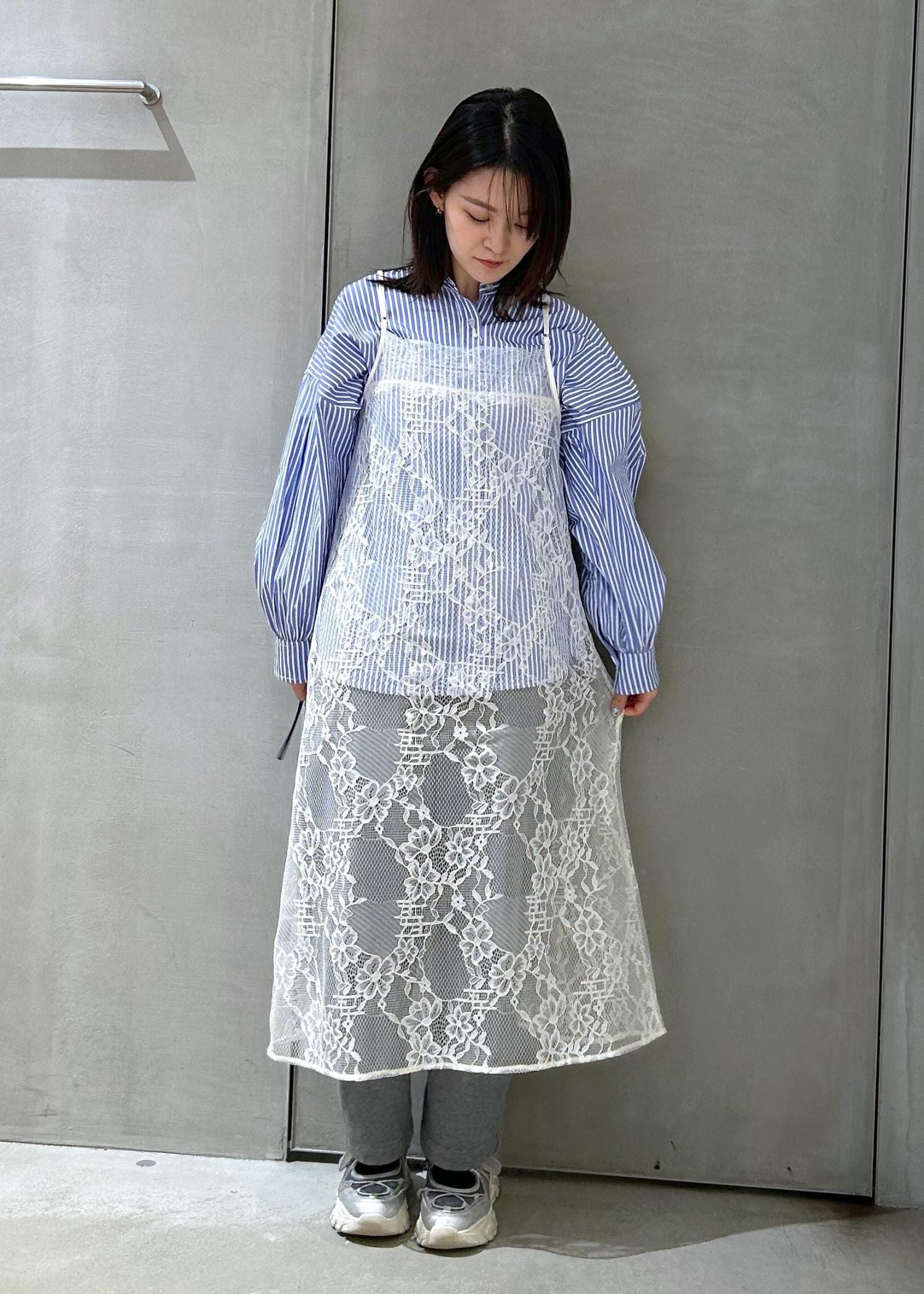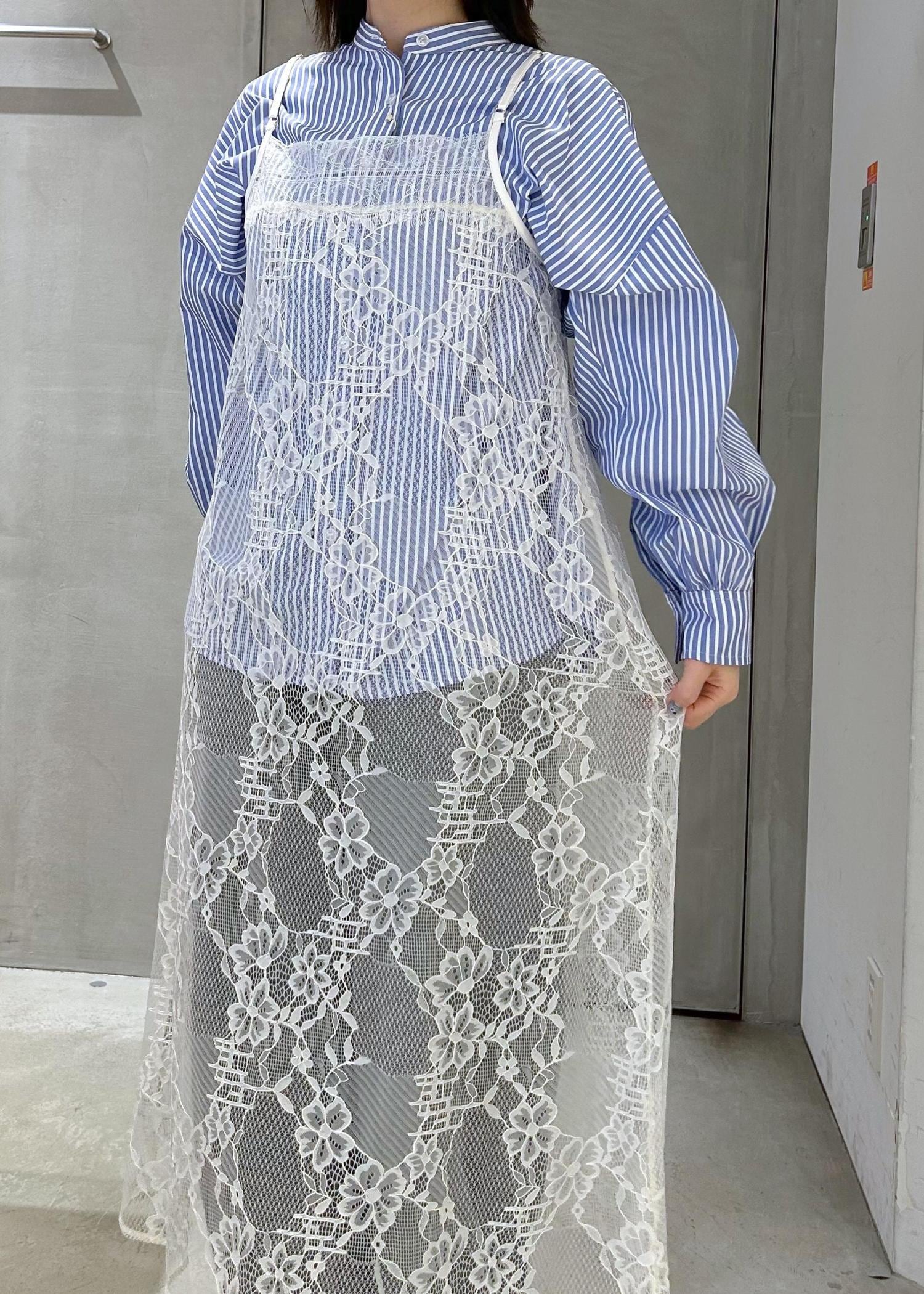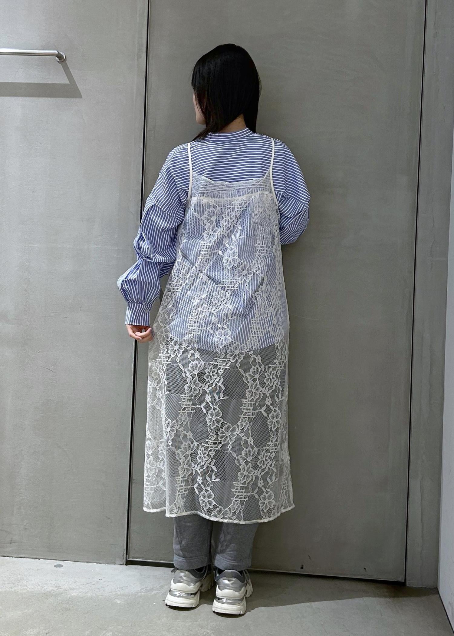 シャツに春らしくレースキャミワンピースを