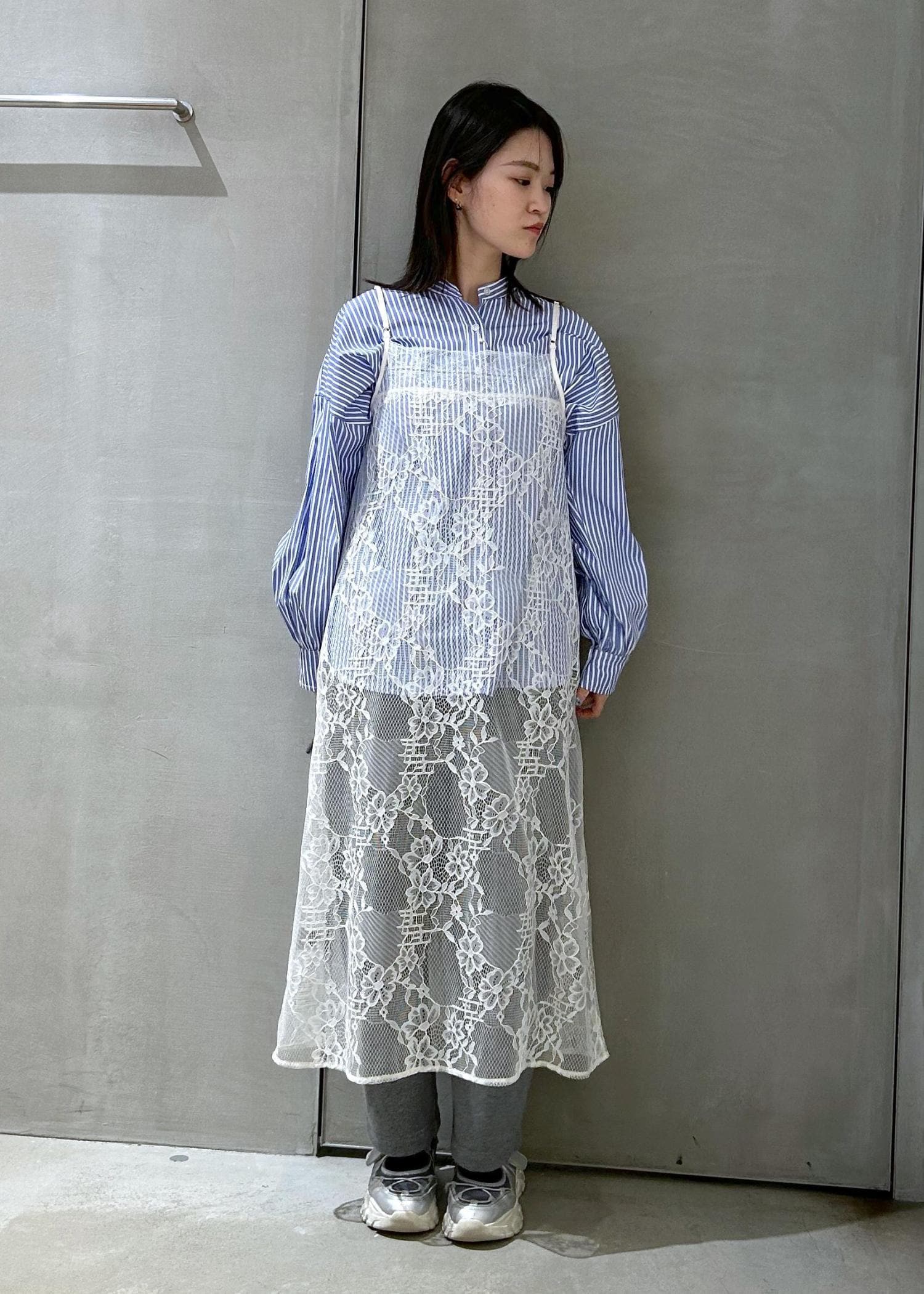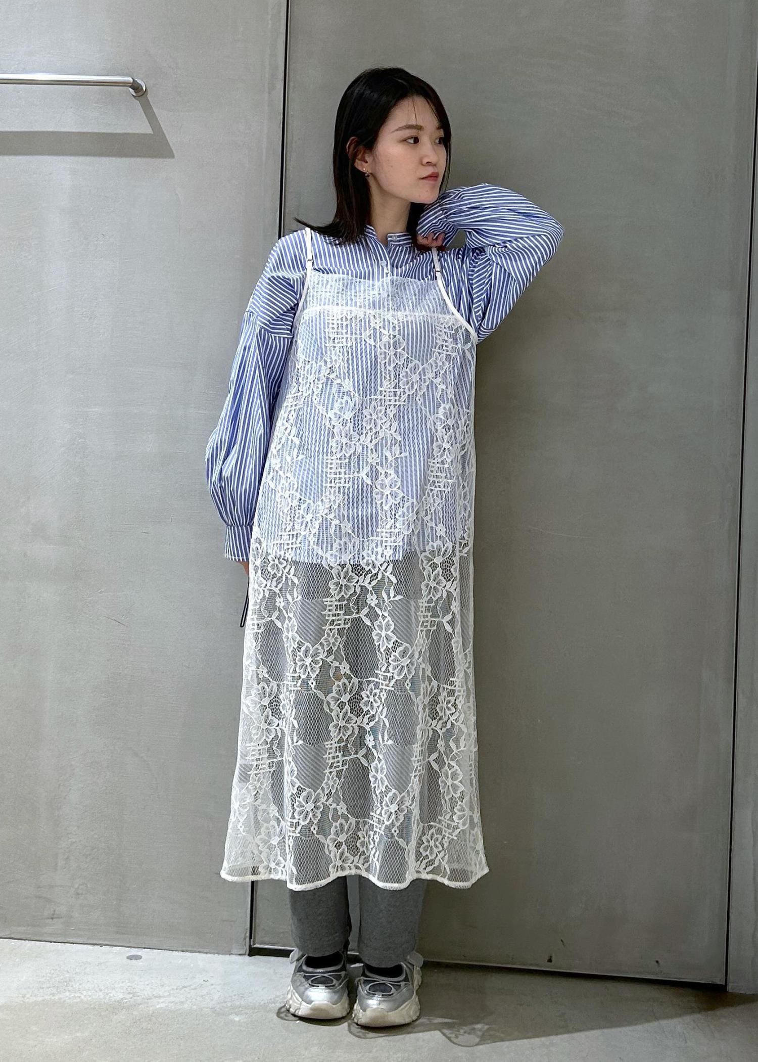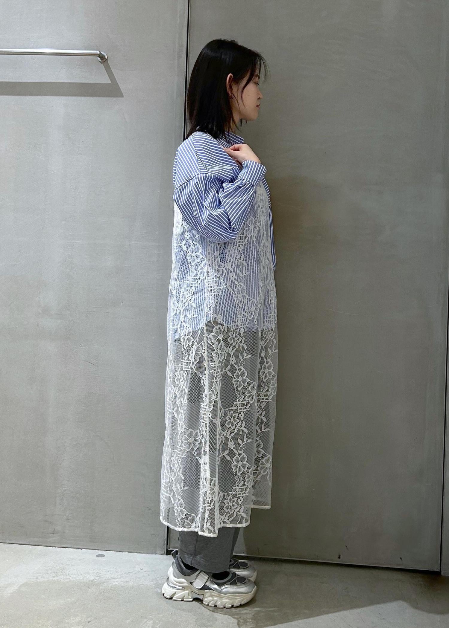 シャツに春らしくレースキャミワンピースを