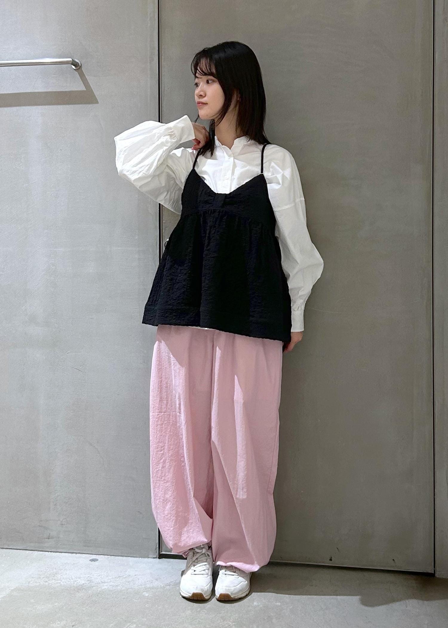 黒とピンクでトップスは少しガーリーめに、