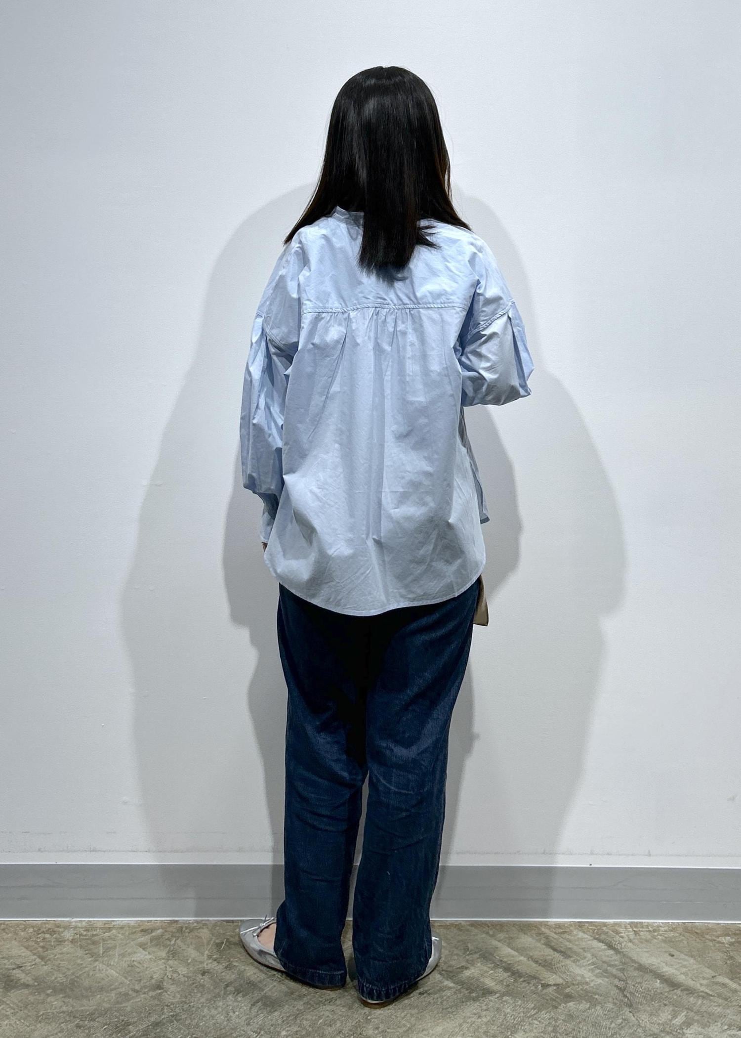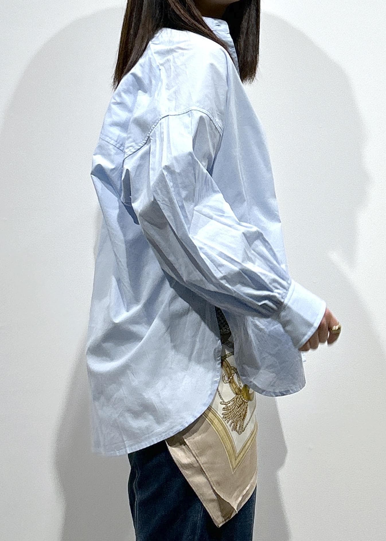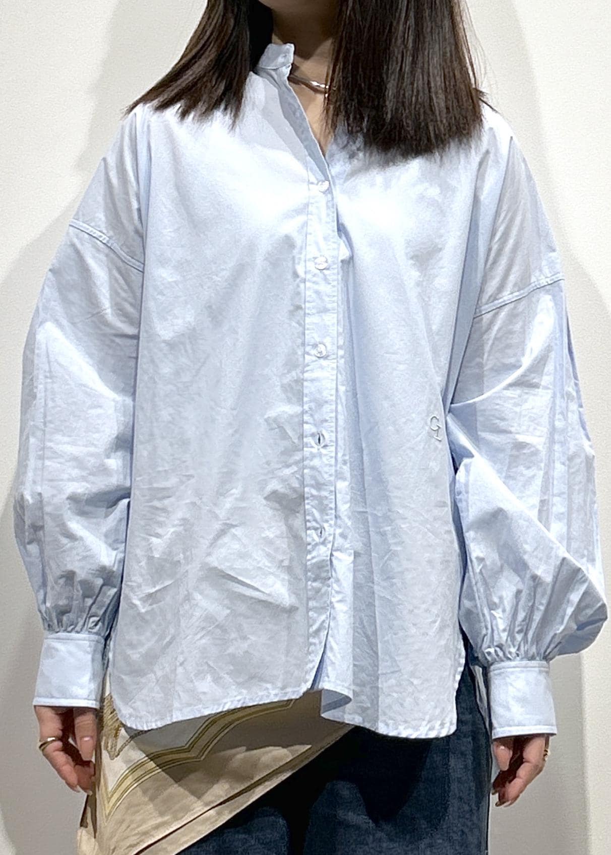 LE CERCLE par ropéロゴ刺繍バンドカラーシャツサックス / F¥6,600レビュー身幅、着丈もワイドなシルエットでヒップがすっぽり隠れる長さです!