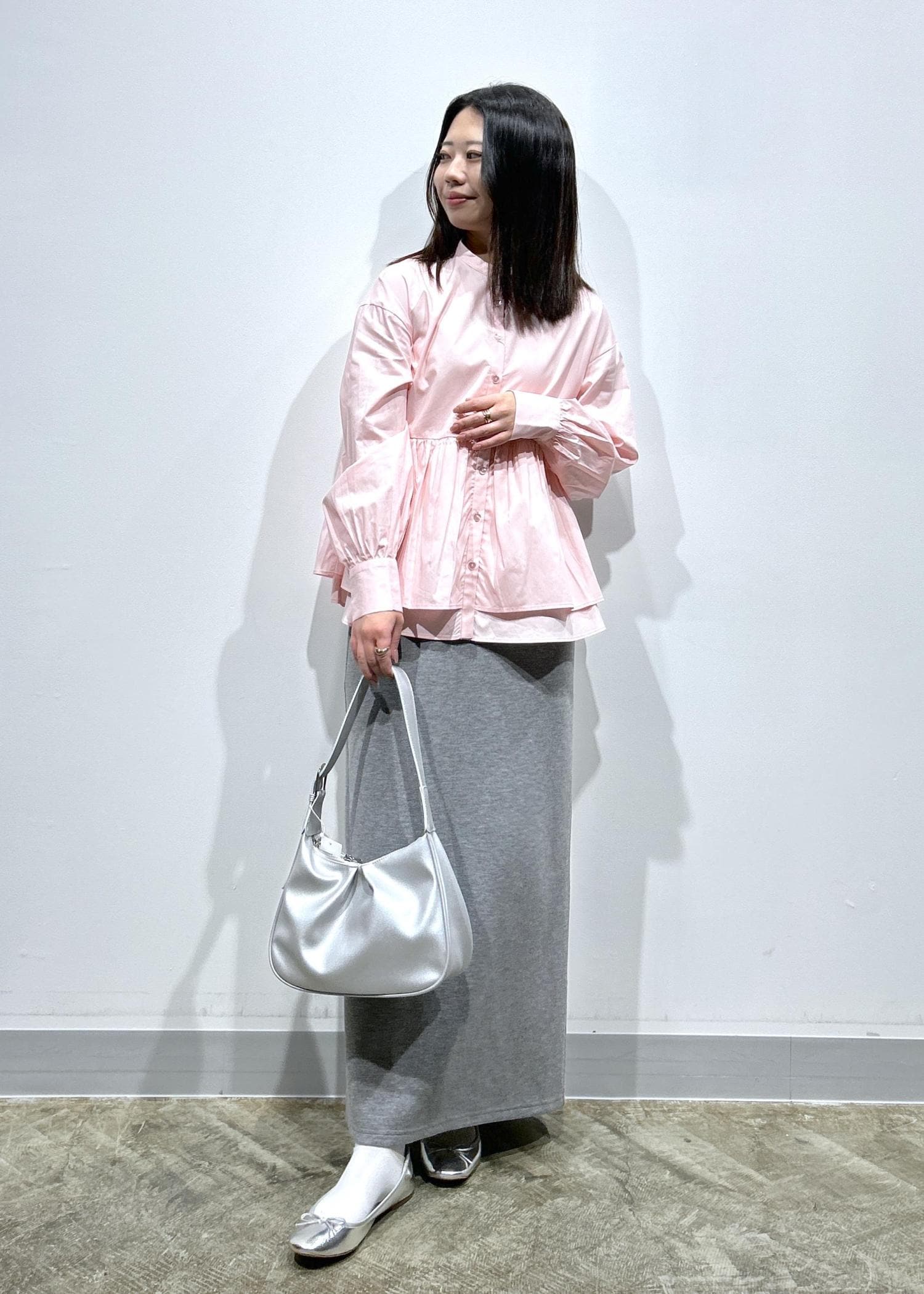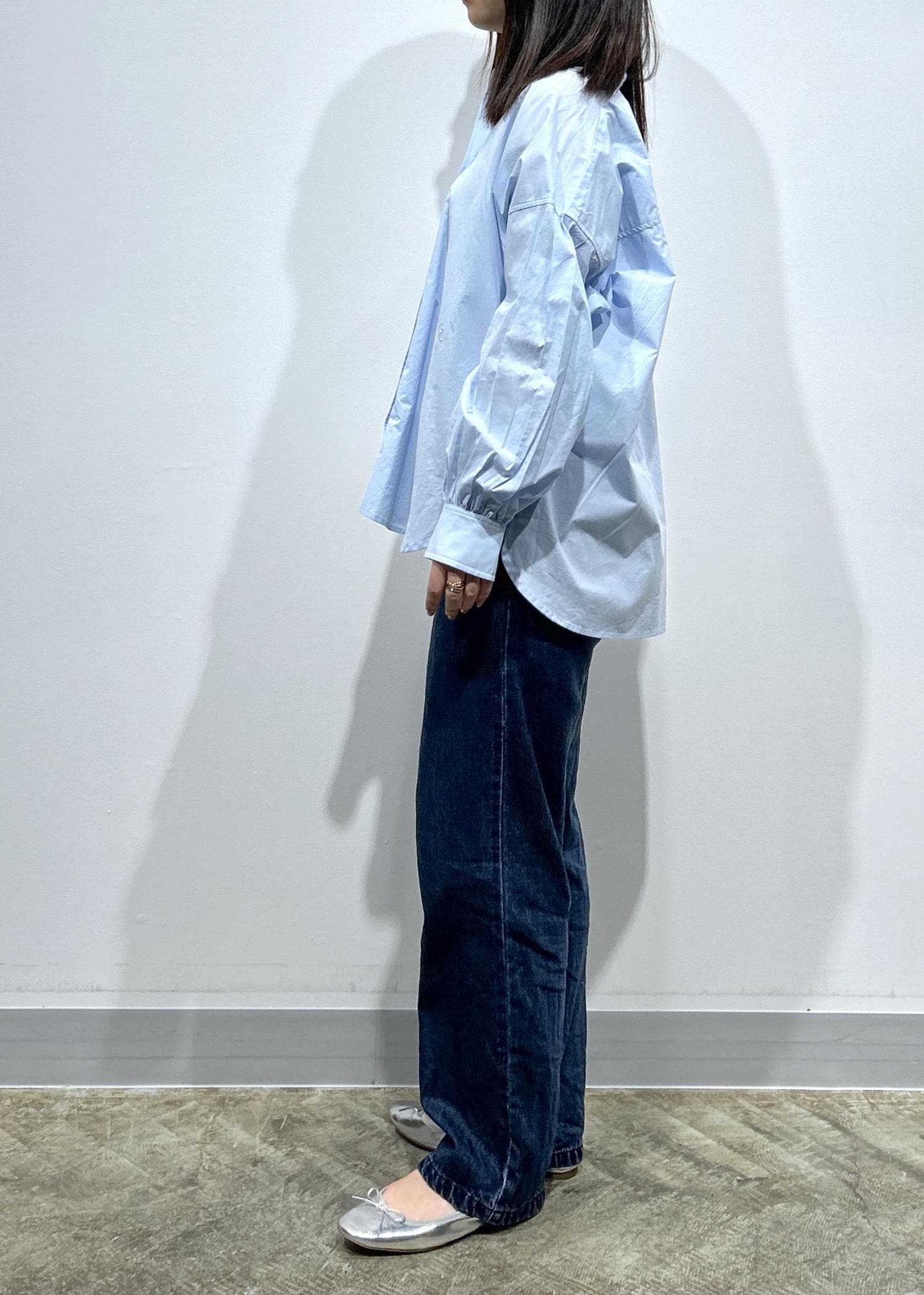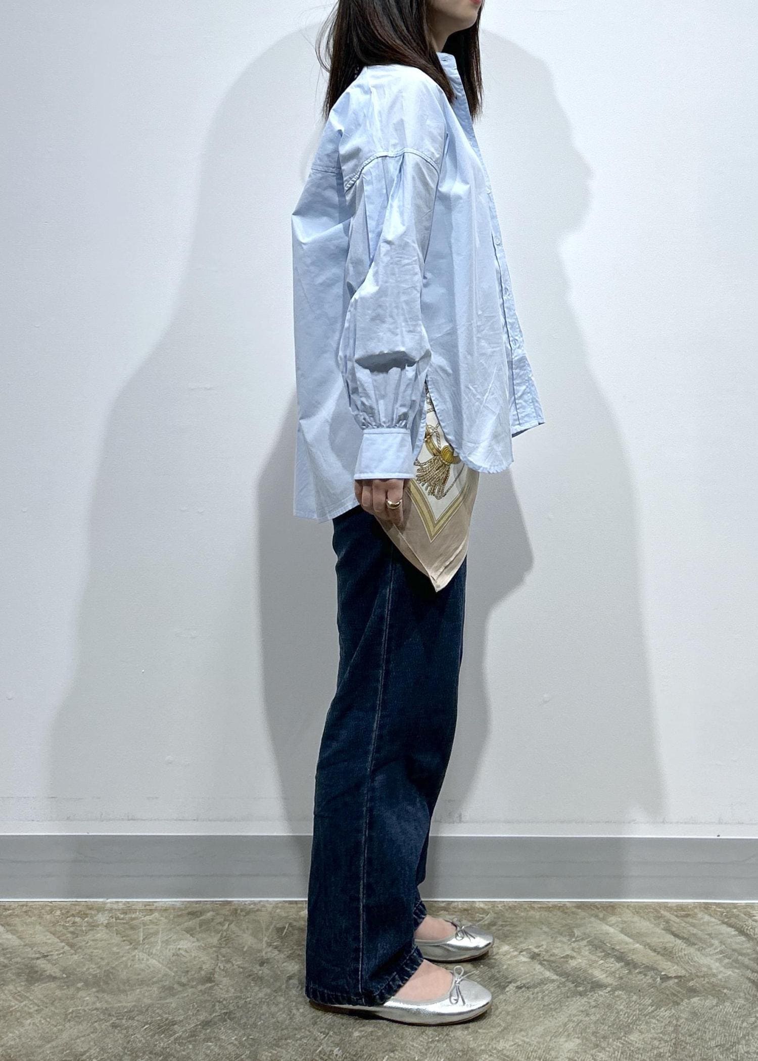 LE CERCLE par ropéロゴ刺繍バンドカラーシャツサックス / F¥6,600レビュー身幅、着丈もワイドなシルエットでヒップがすっぽり隠れる長さです!