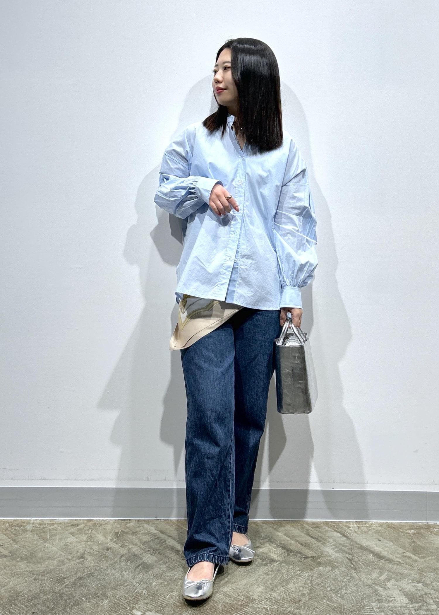 シャツとデニムのシンプルな組み合わせなので、