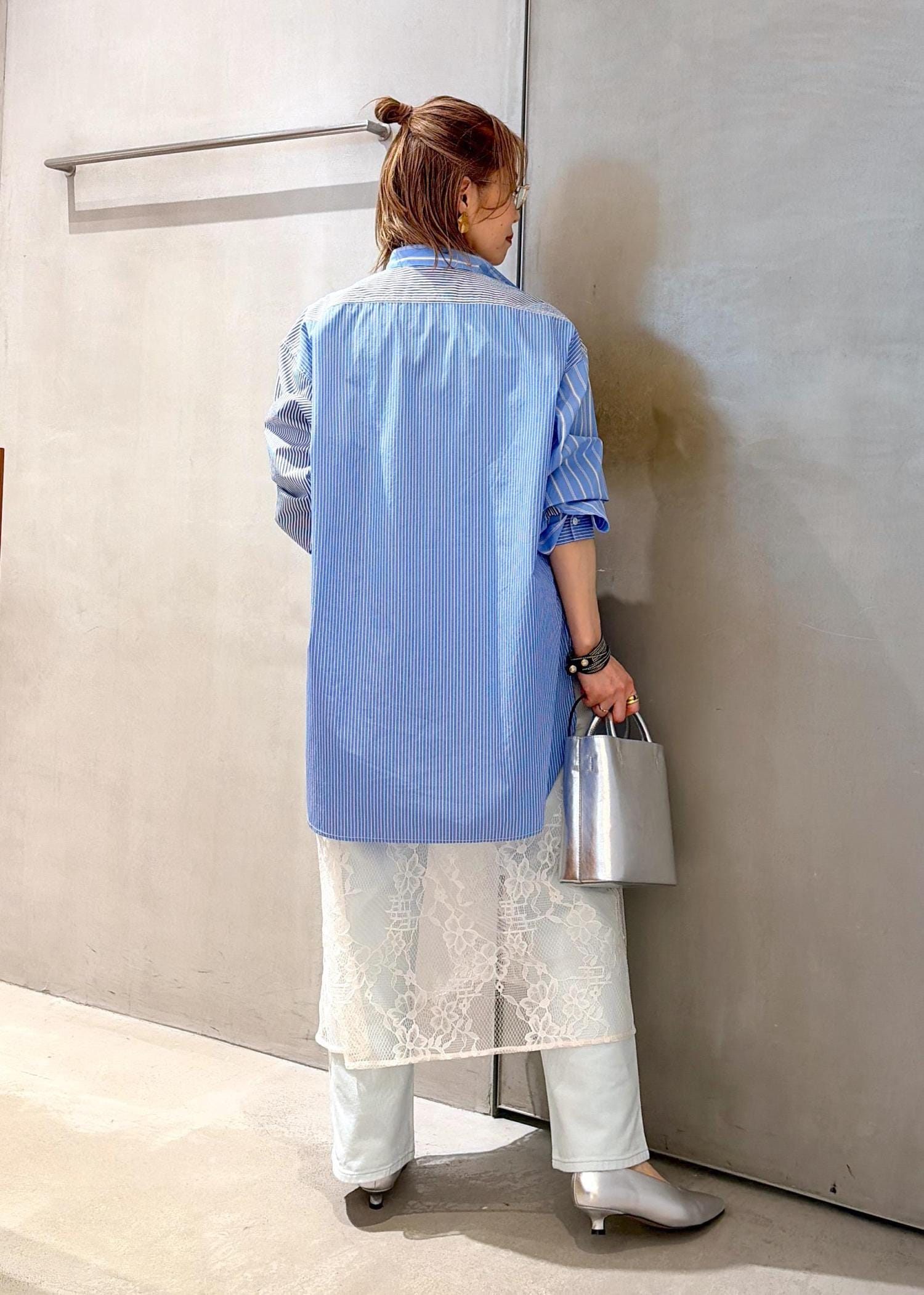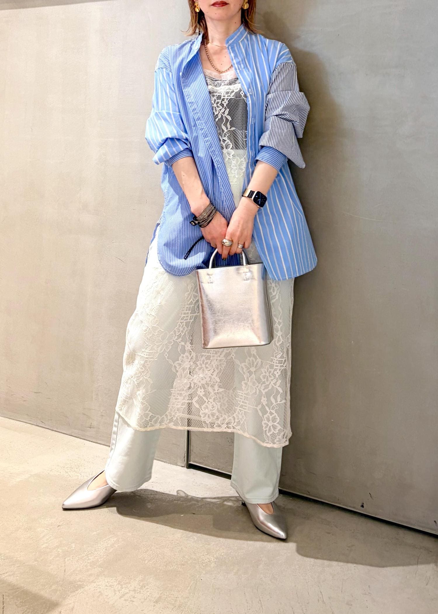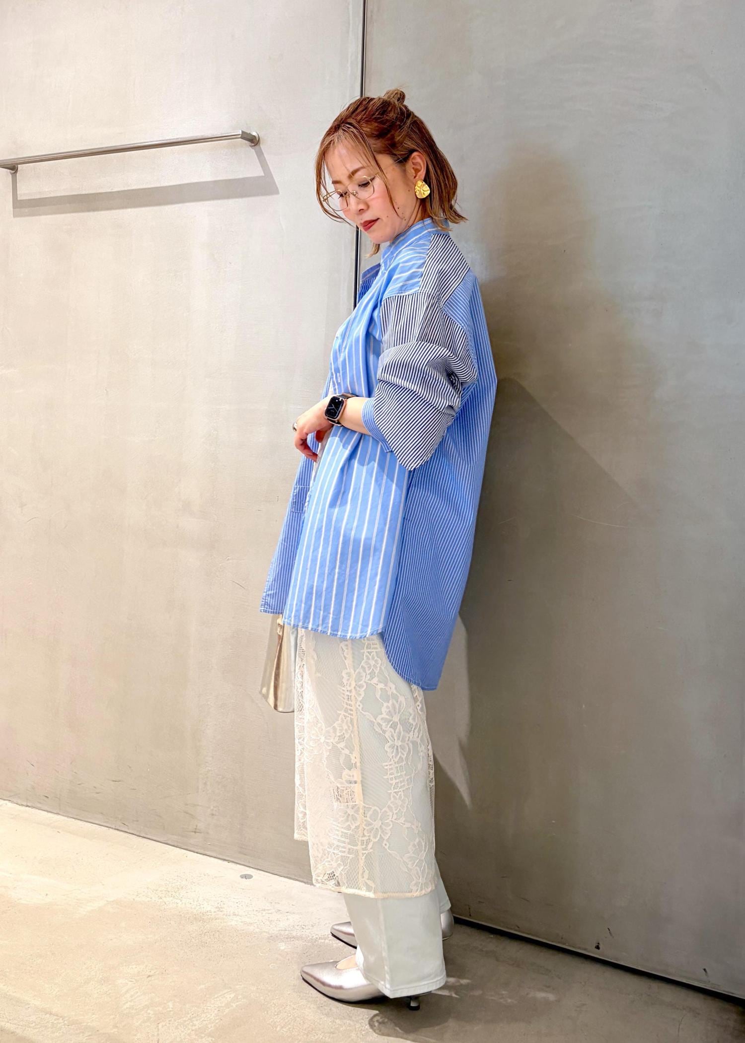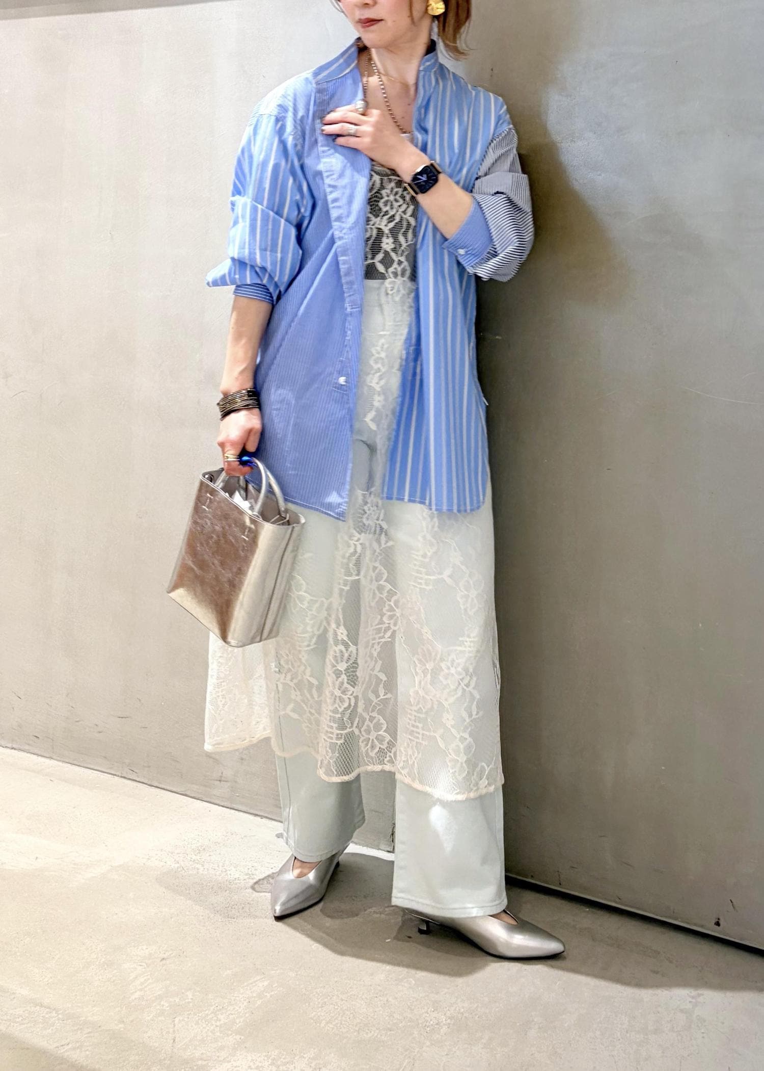 メンズライクなシャツには、あえてレースアイテムを入れいただくと、バランスがいいですよ。
