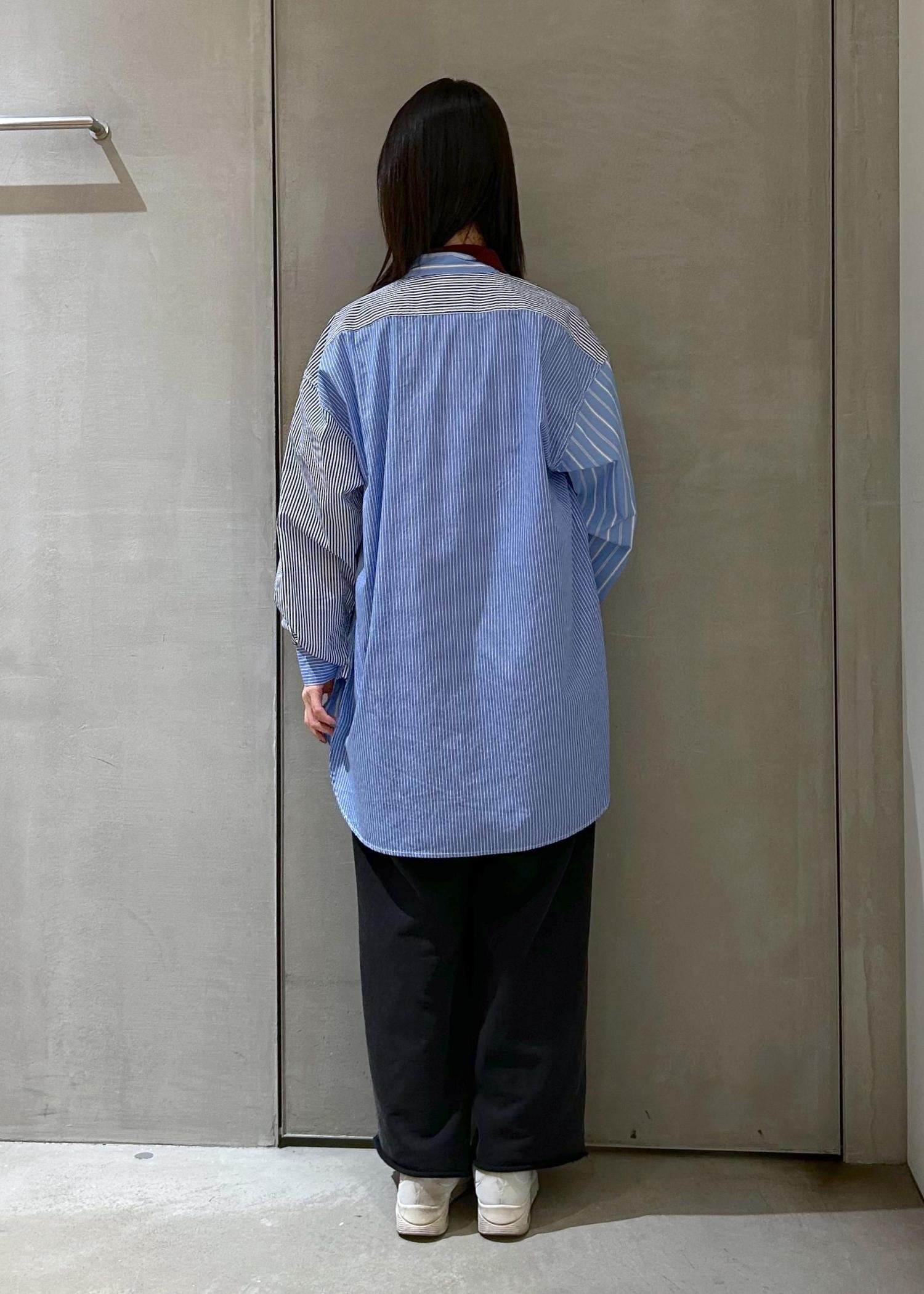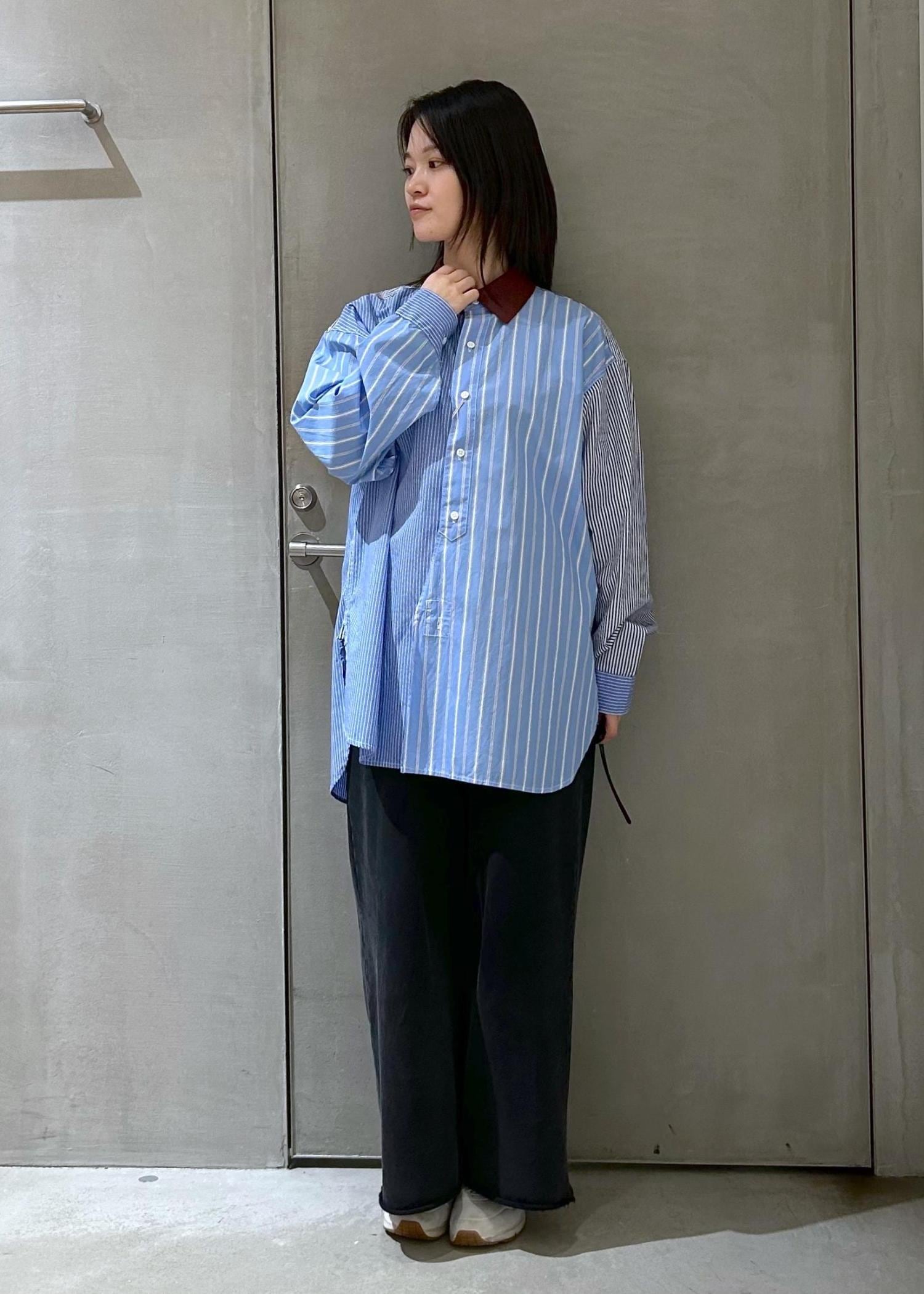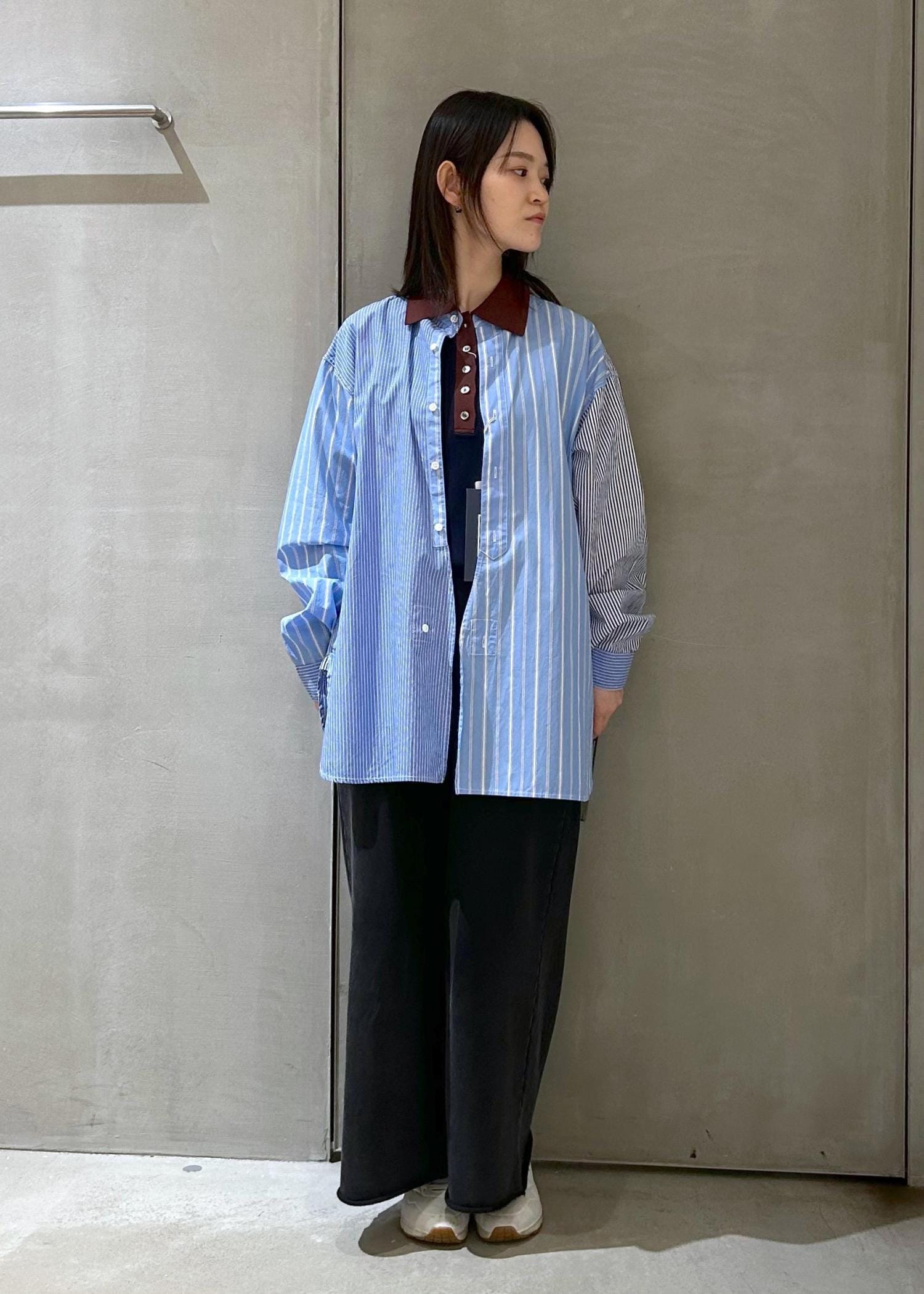 春らしいストライプのバンドカラーシャツに襟付きのトップスをレイヤードしてみました。デニムや、気温が上がってきたらハーフパンツなどと合わせても◎