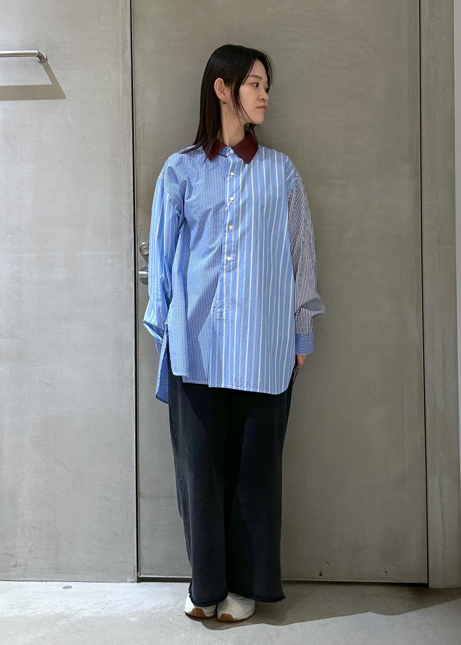 ストライプシャツレイヤードパンツスタイル
