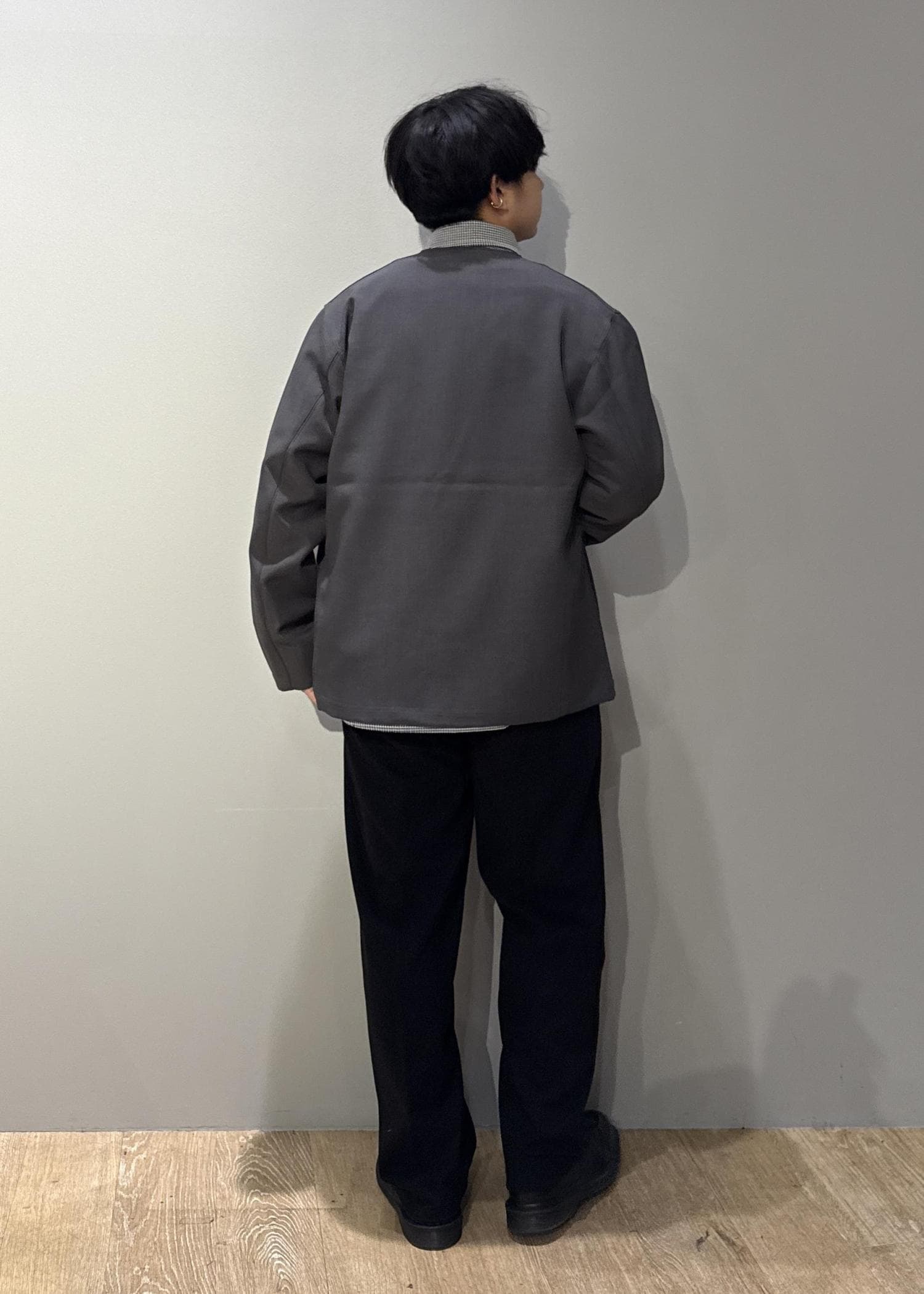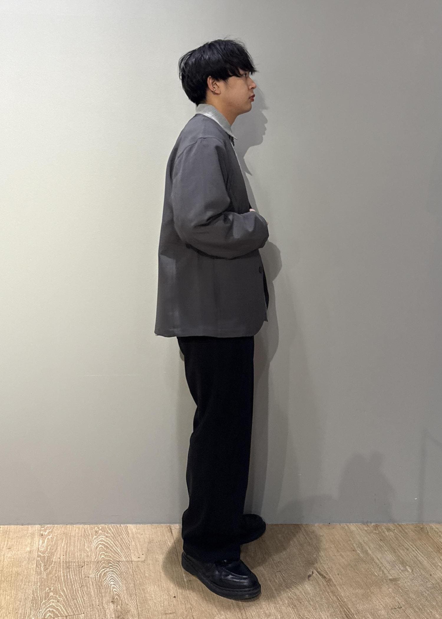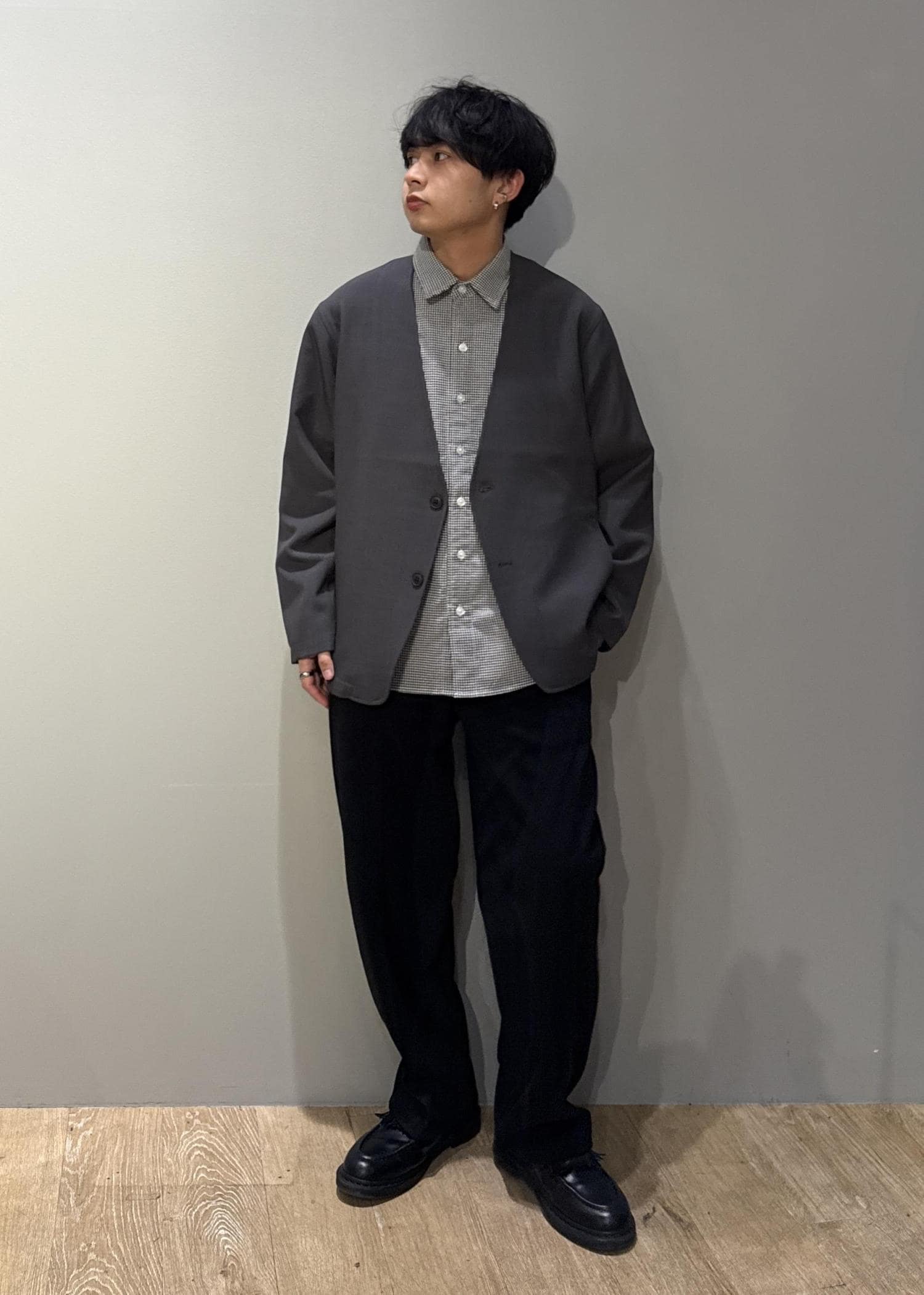 今回はメランジ配色ノーカラージャケットを使ったコーデです。セットアップ対応ですが、単体でも使いやすい1枚。ややルーズなシルエットなのでキレイめだけでなく着崩したカジュアルコーデもオススメです。