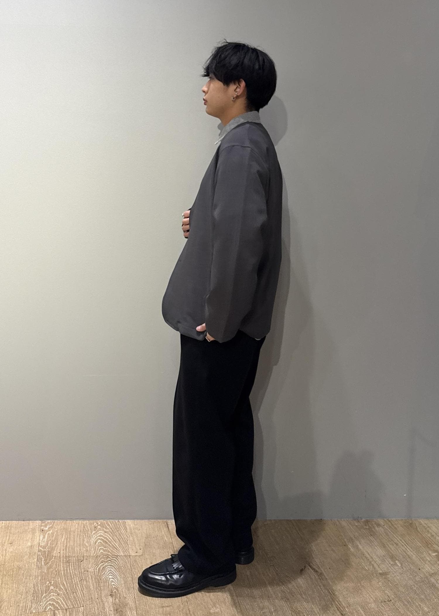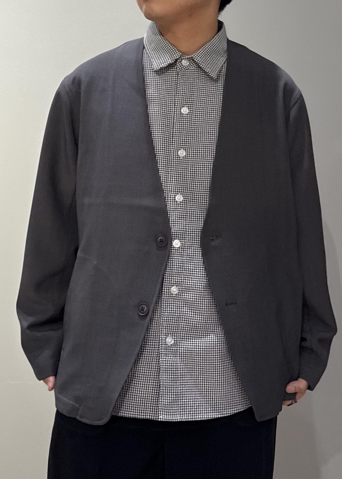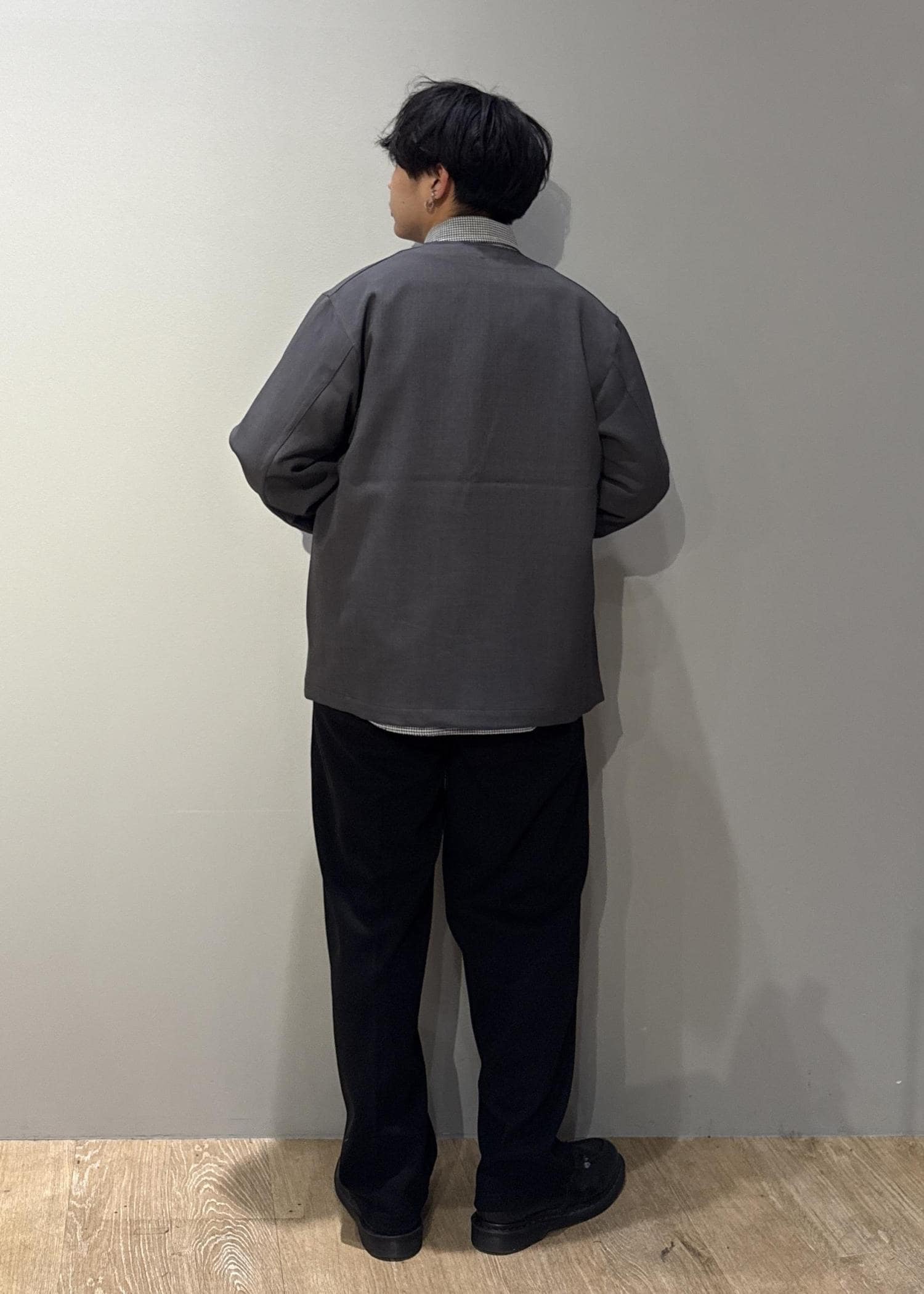 今回はメランジ配色ノーカラージャケットを使ったコーデです。セットアップ対応ですが、単体でも使いやすい1枚。ややルーズなシルエットなのでキレイめだけでなく着崩したカジュアルコーデもオススメです。