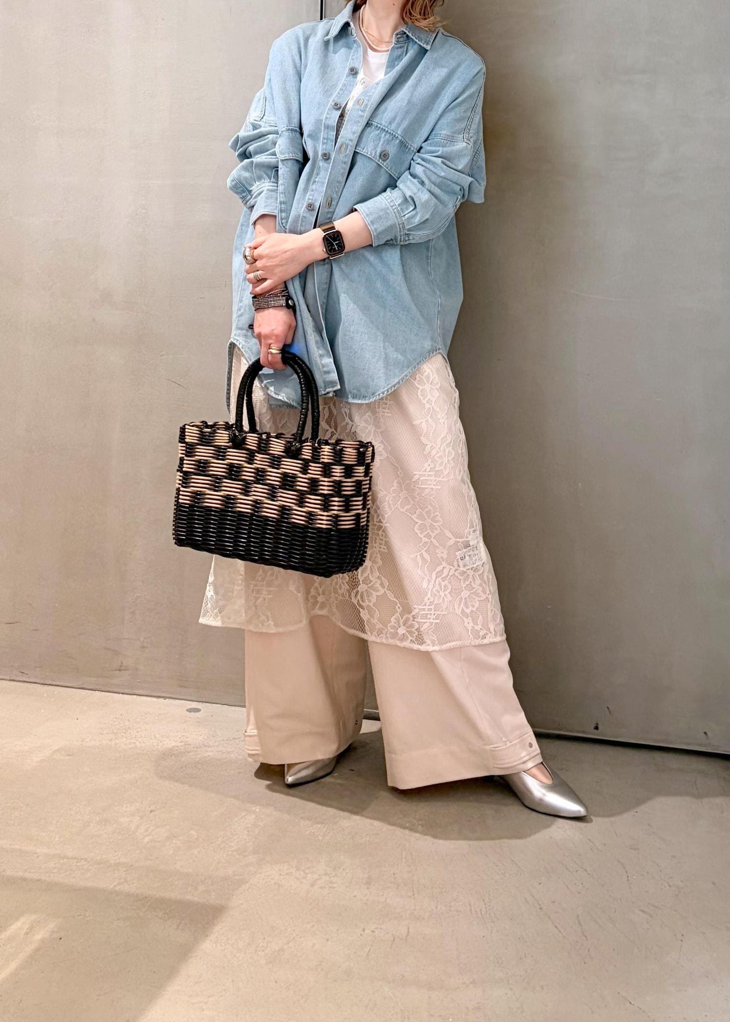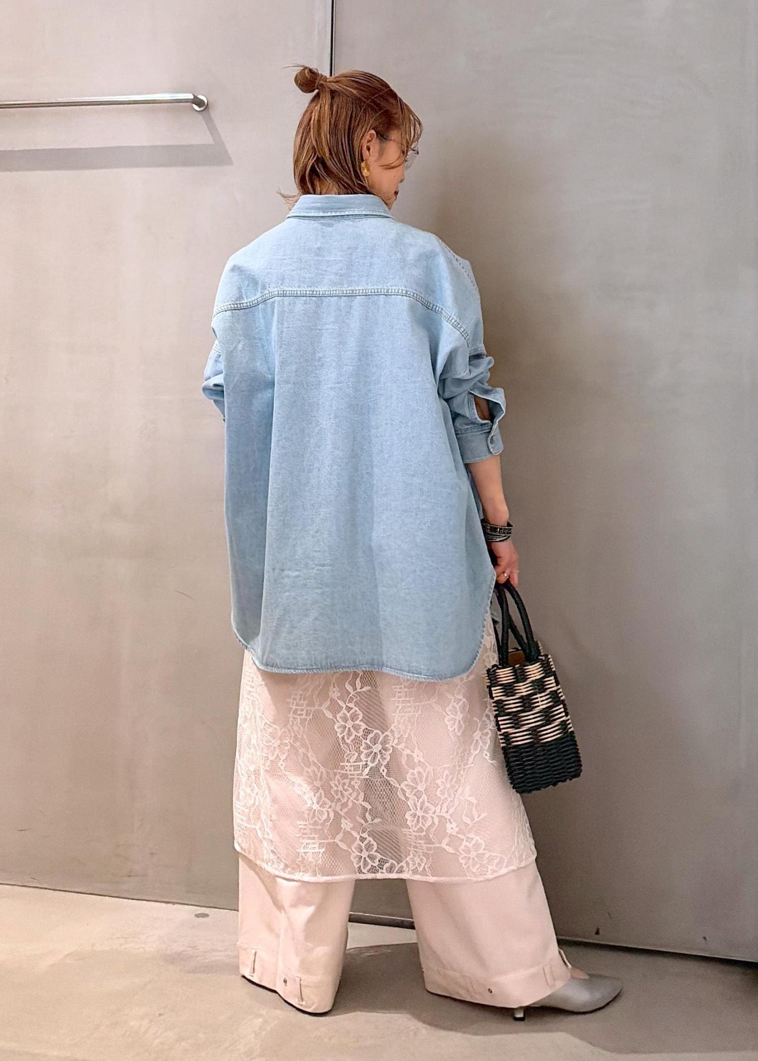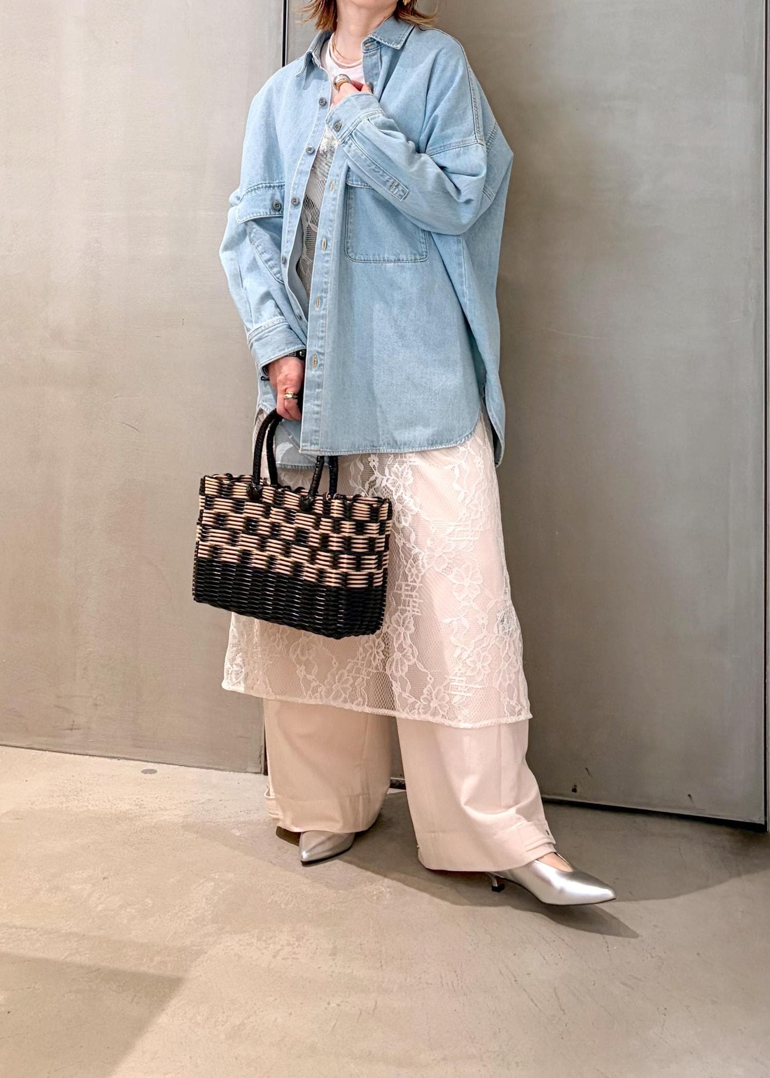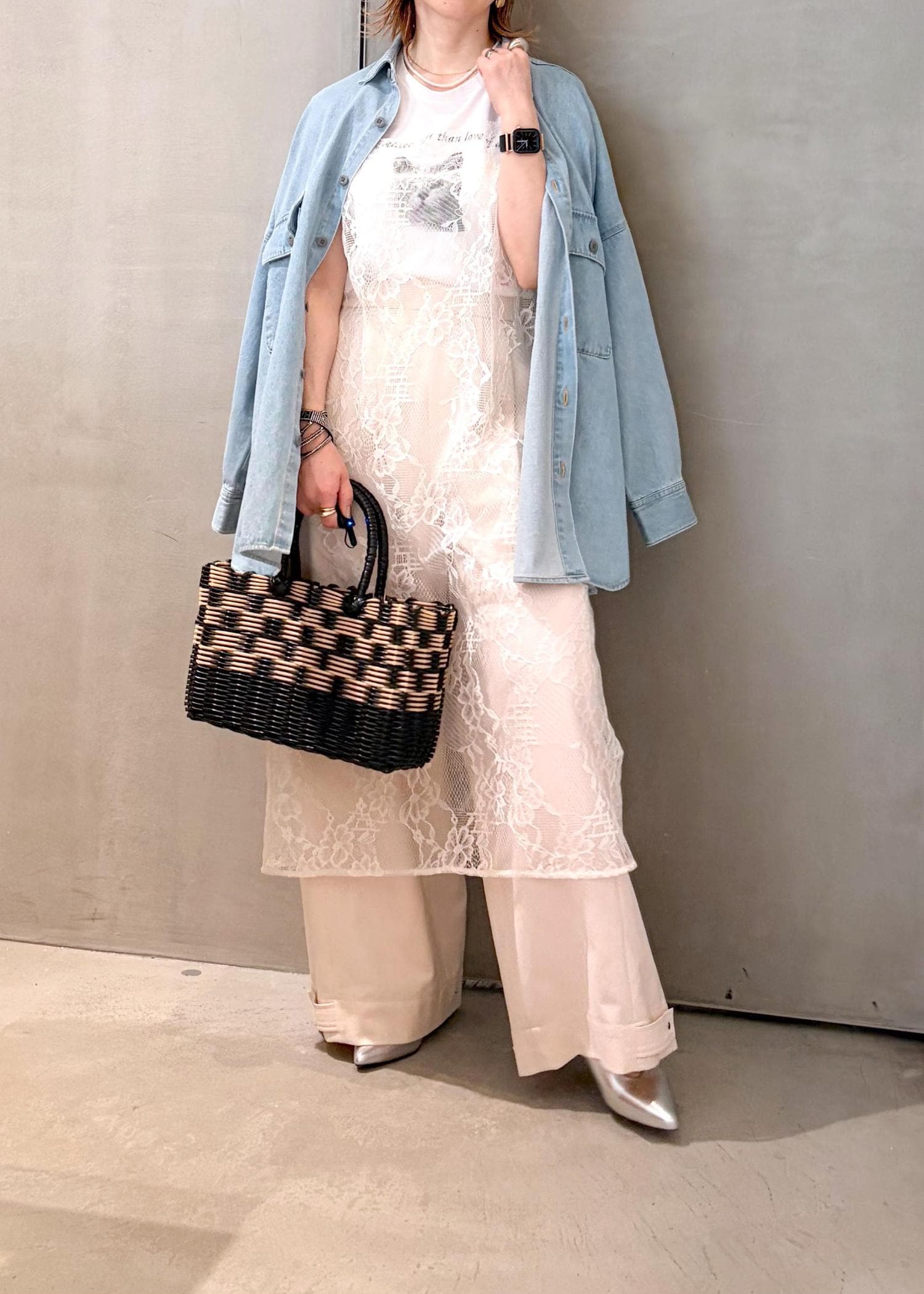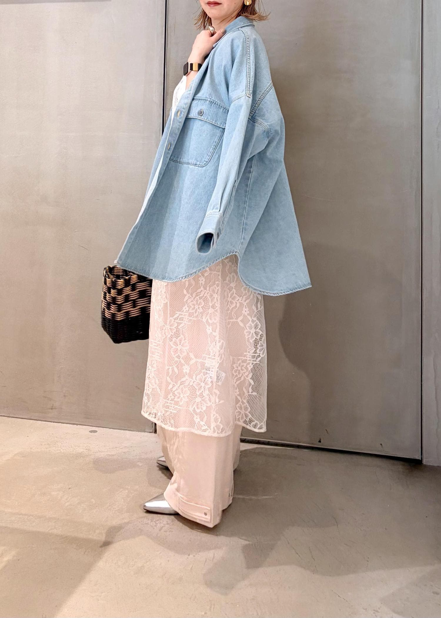 今回はメンズライクなシャツなので、レースワンピースをレイヤードして、レディ要素をプラスしてバランスをとりました。