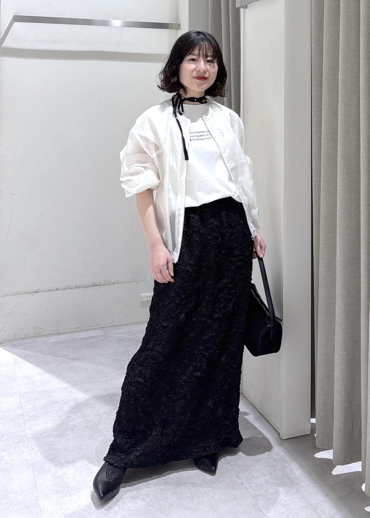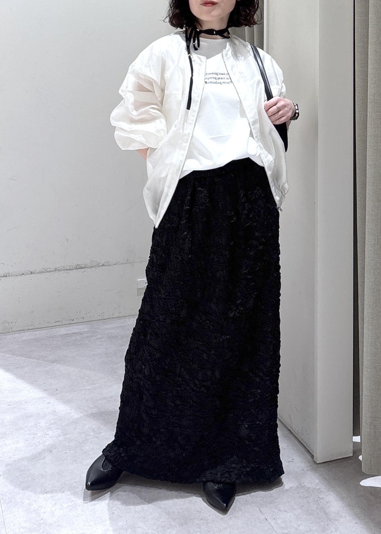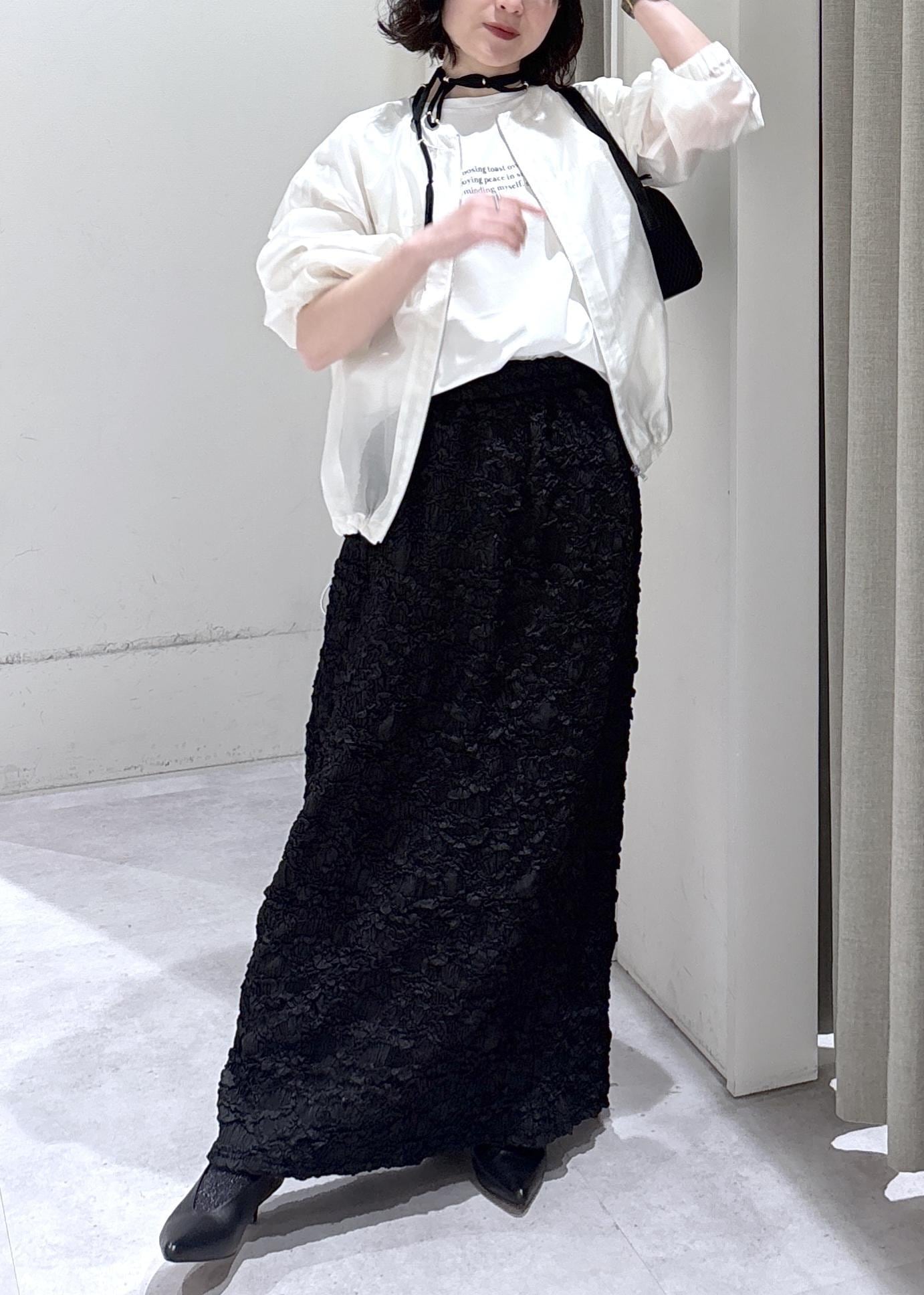 透け感のある羽織りと存在感のあるスカートで