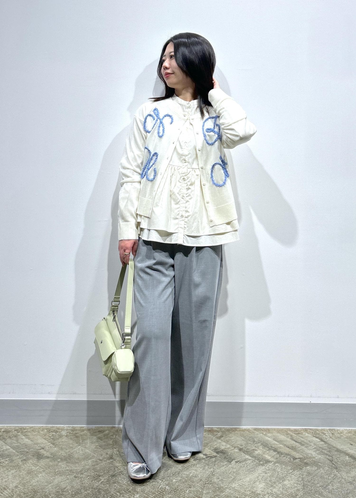 カーディガンはショート丈なので、