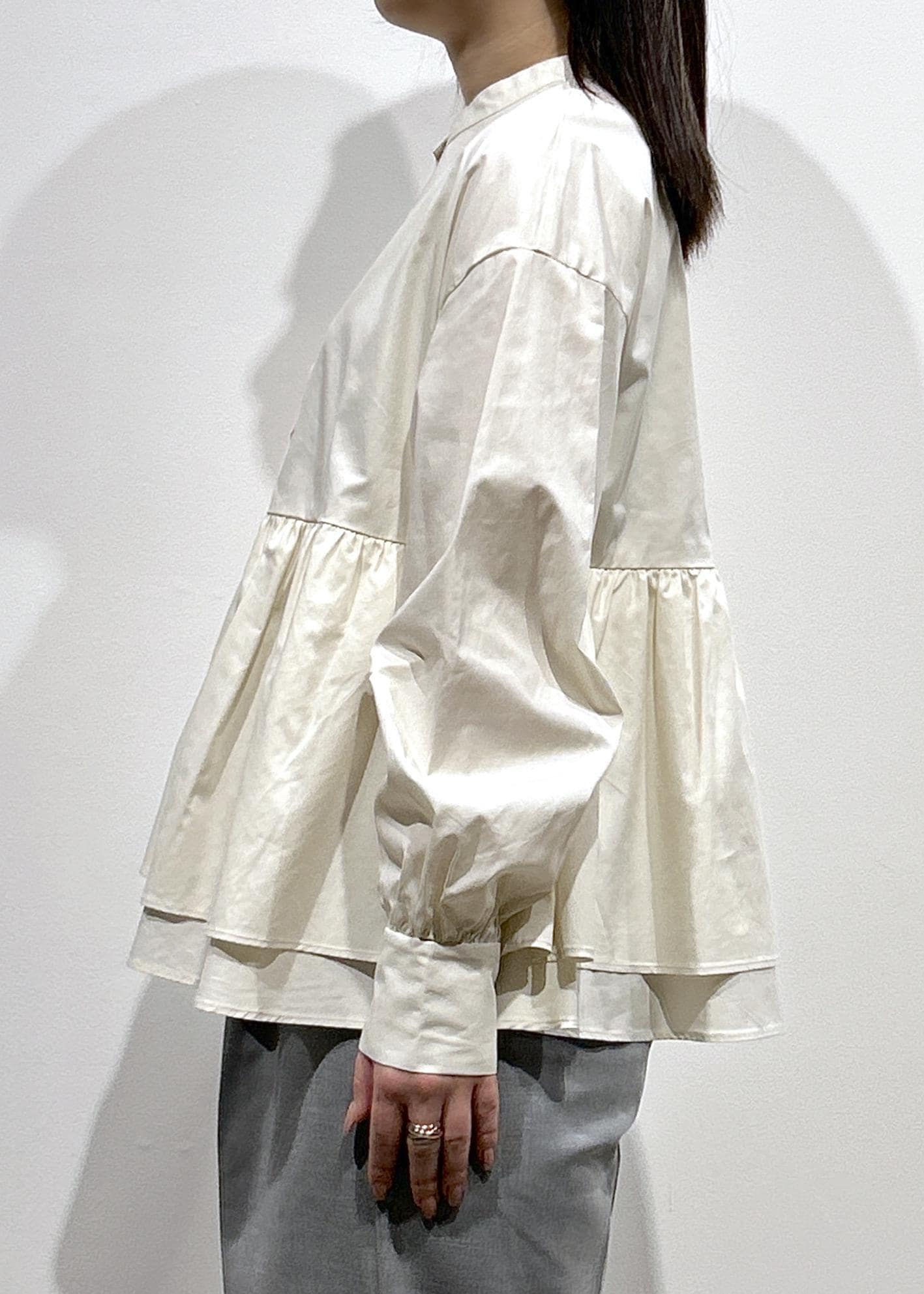 ボリューム感のあるギャザーですか、全体的なサイズ感がスッキリしているので、着膨れ感はありません! -