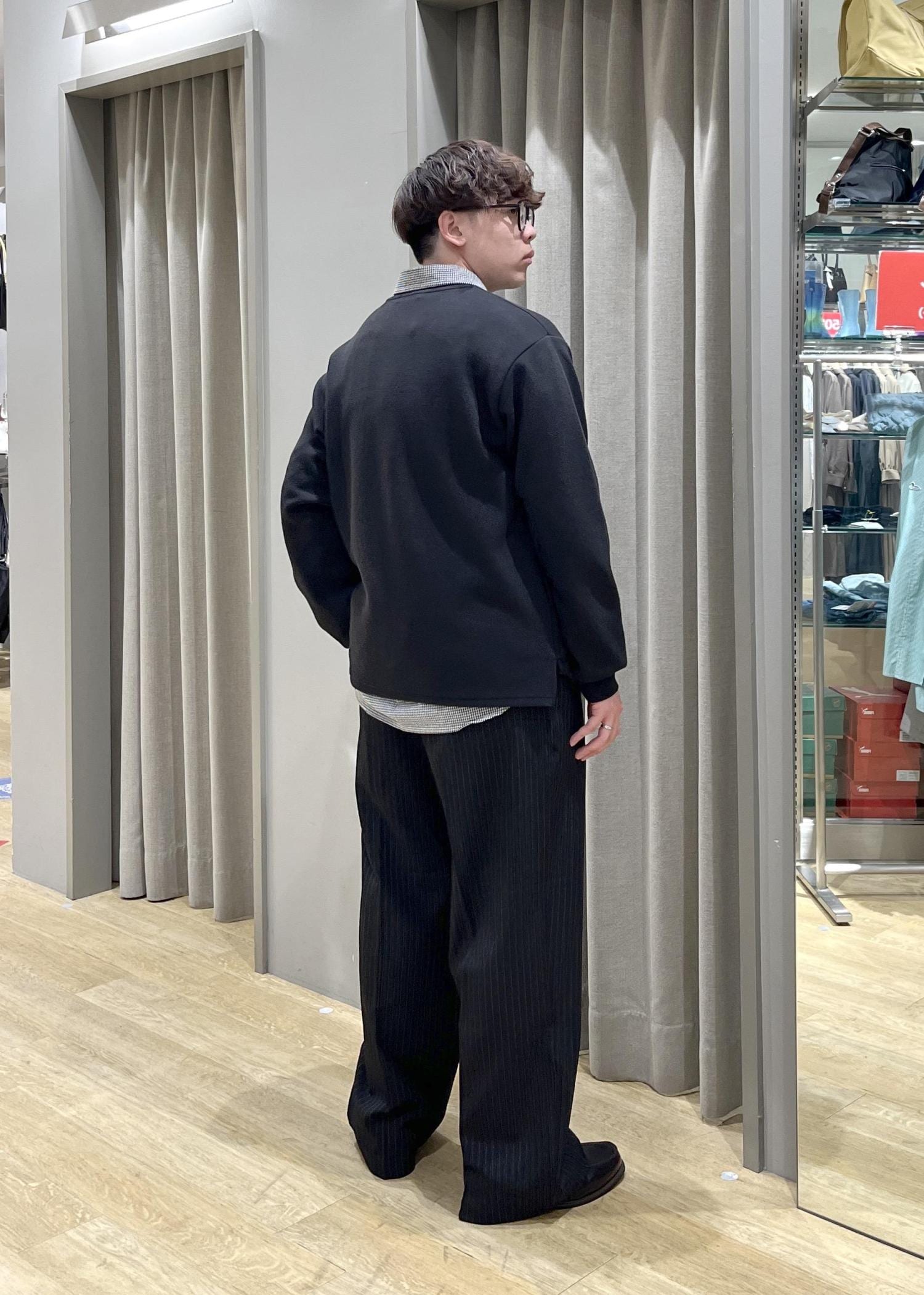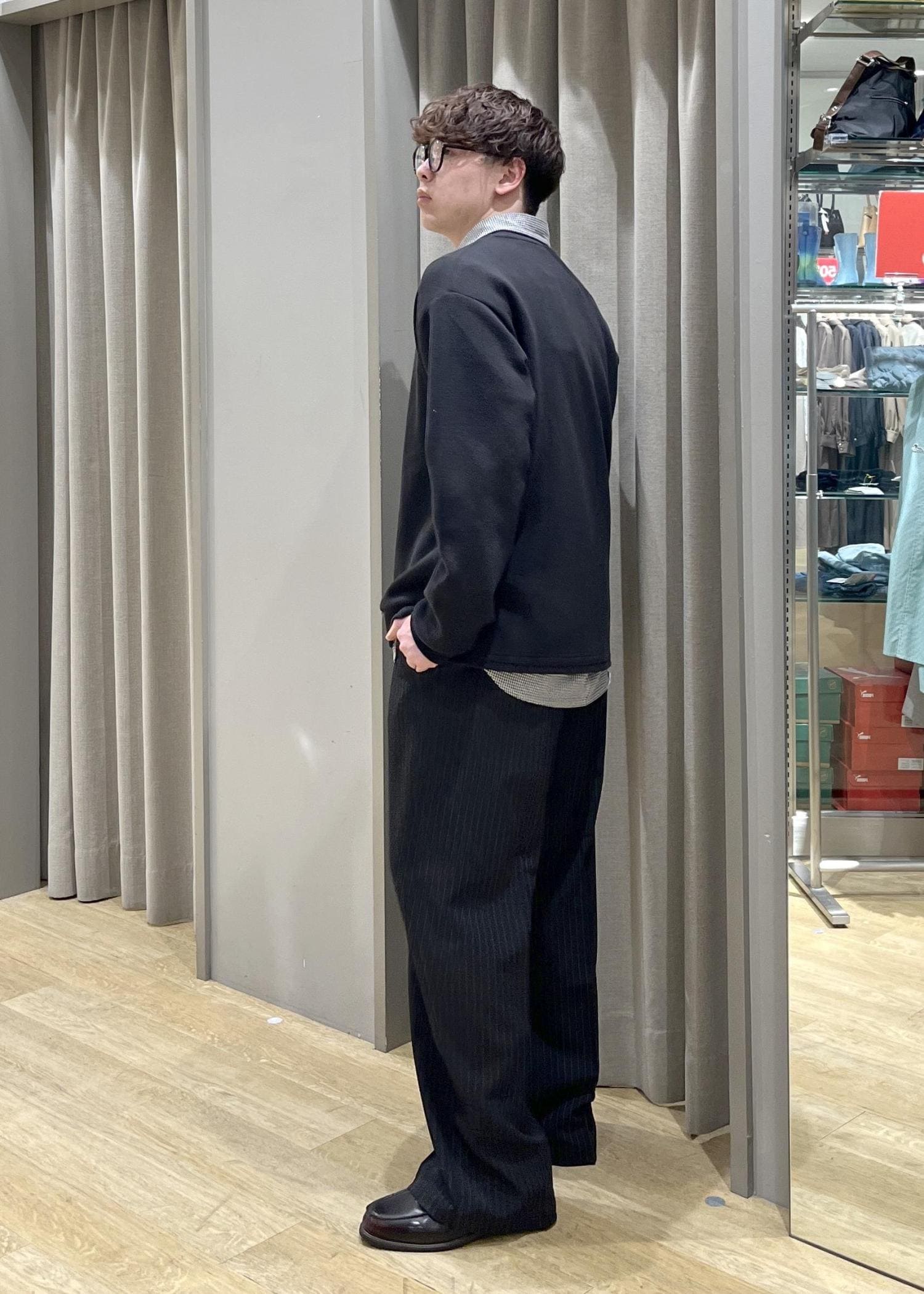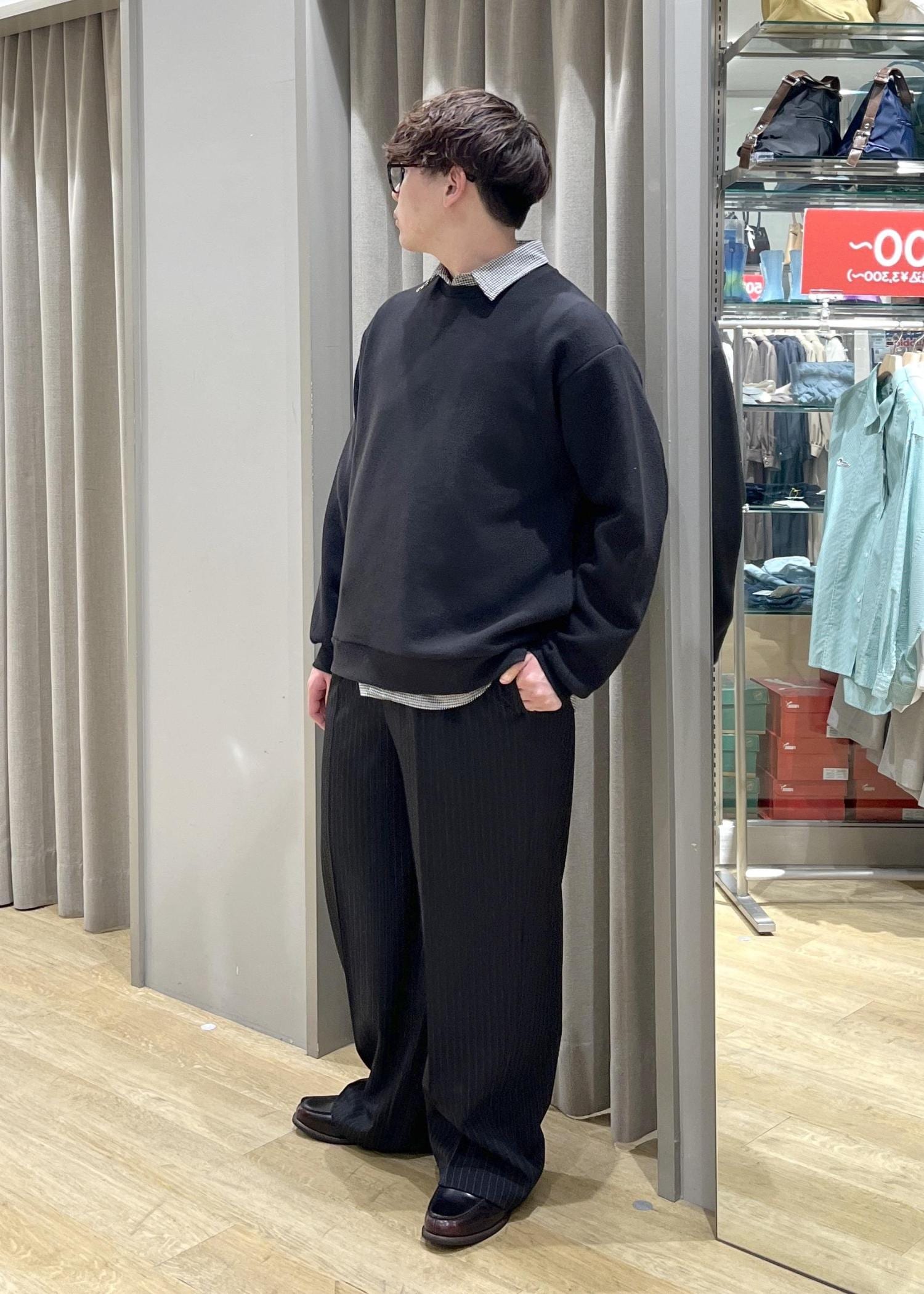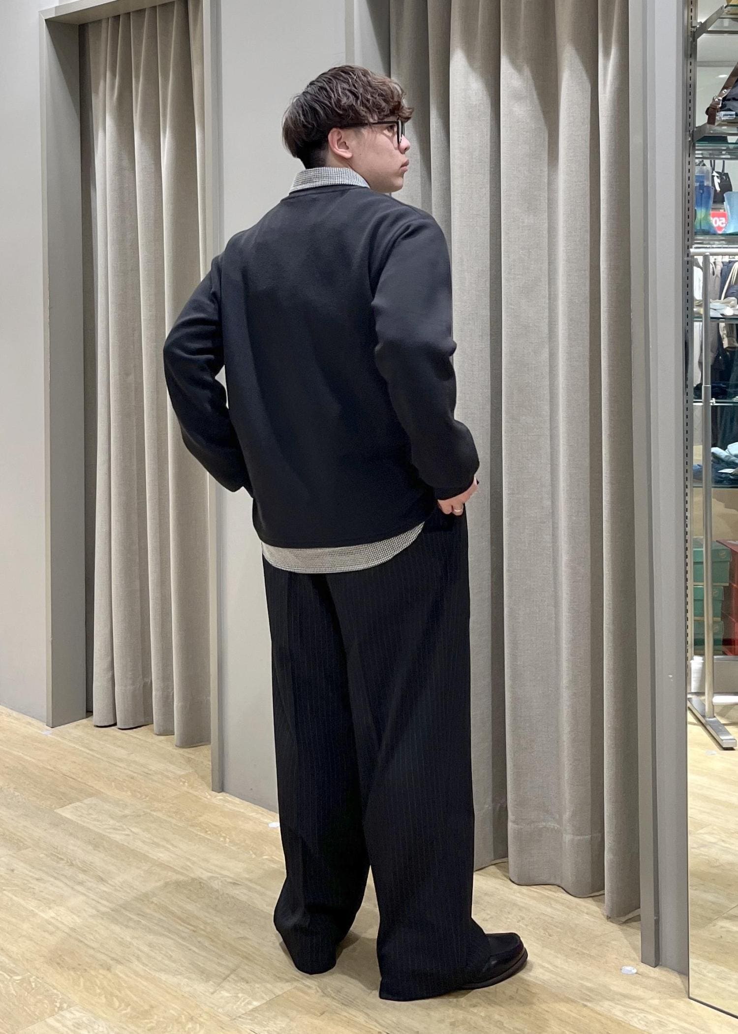 ストライプのワイドパンツでキレイ目な印象を持たせつつ、スウェットのようなトップスとチェック柄のシャツでカジュアルな印象にも。