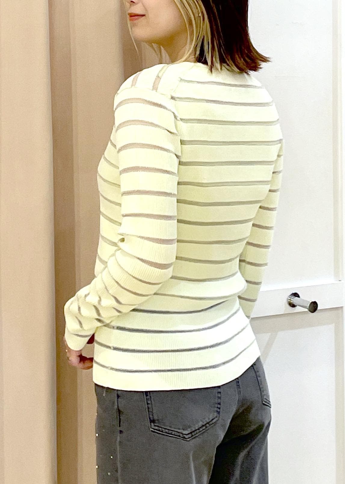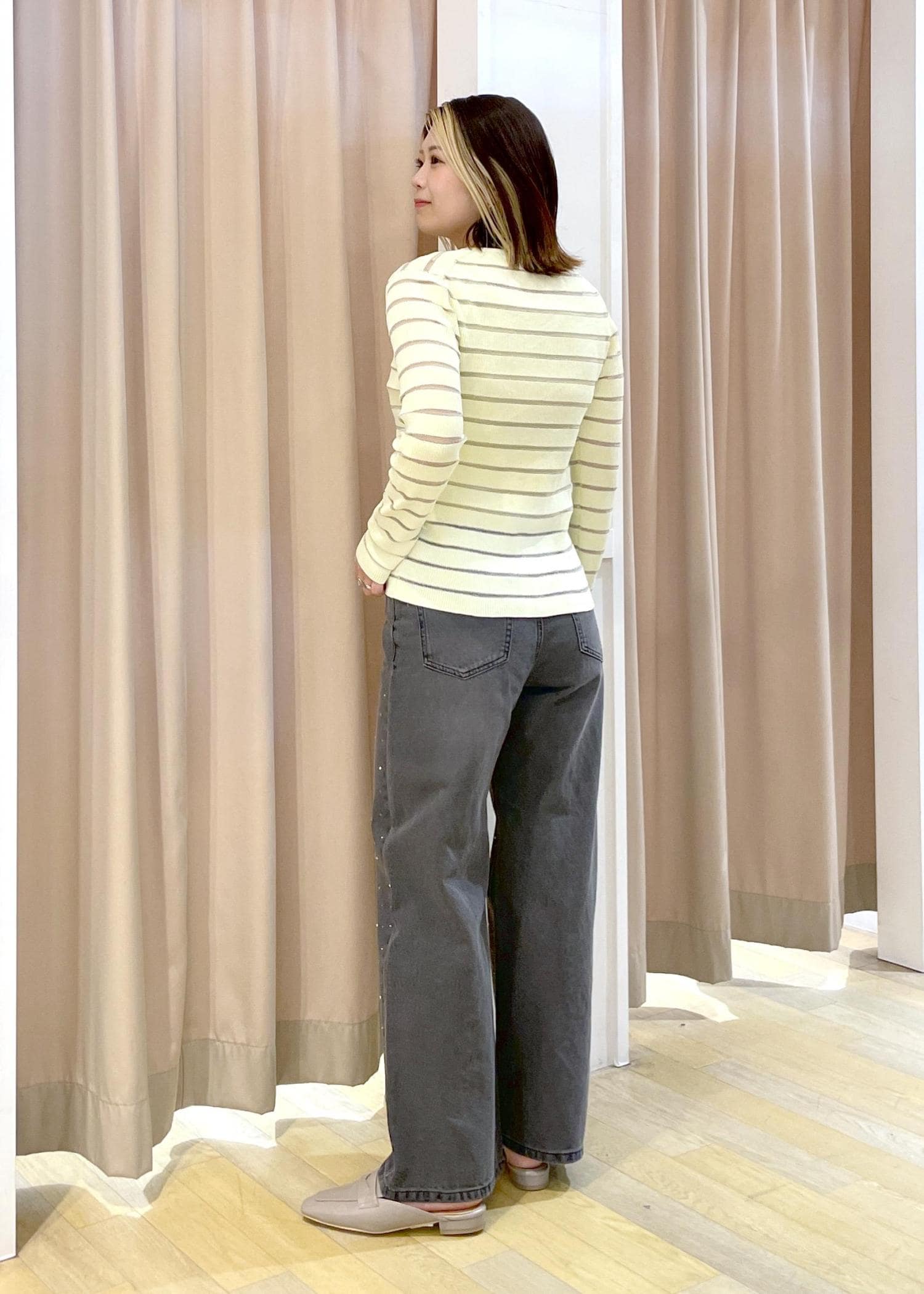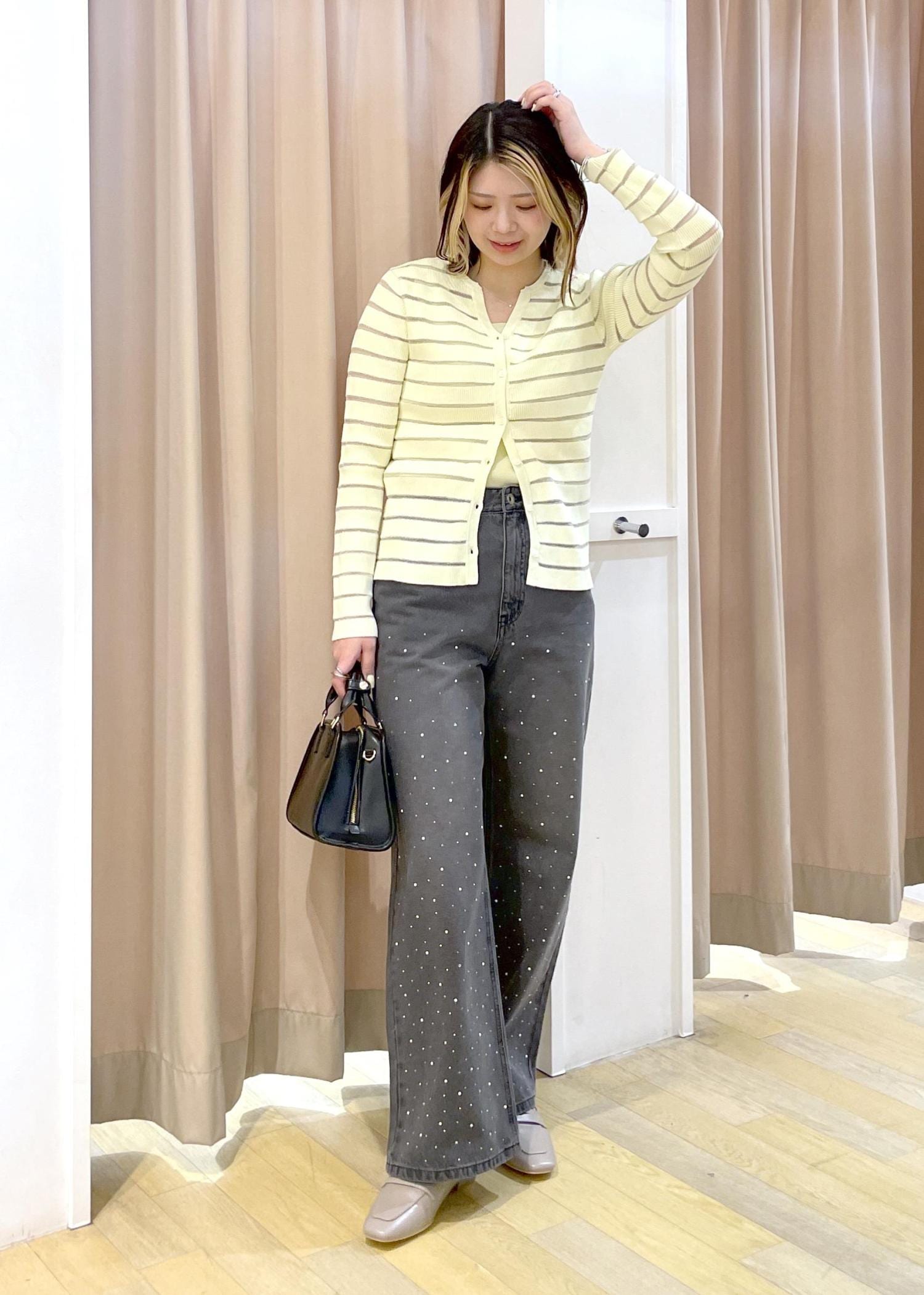 カーディガンはボーダー部分がシアーになっているので、タンクトップやキャミソールインナーの上に羽織ると透け感がわかりやすくてオススメです◎