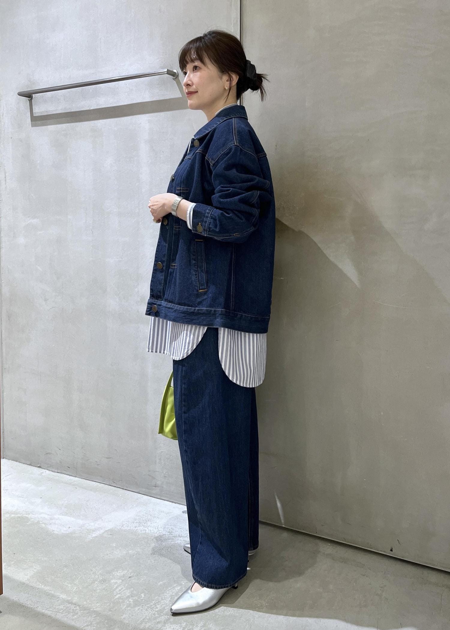 上下デニムだと野暮ったくなってしまいそうな場合は、小物でメリハリをつけたり、スカーフなどで色味を足していただいたりも○です。