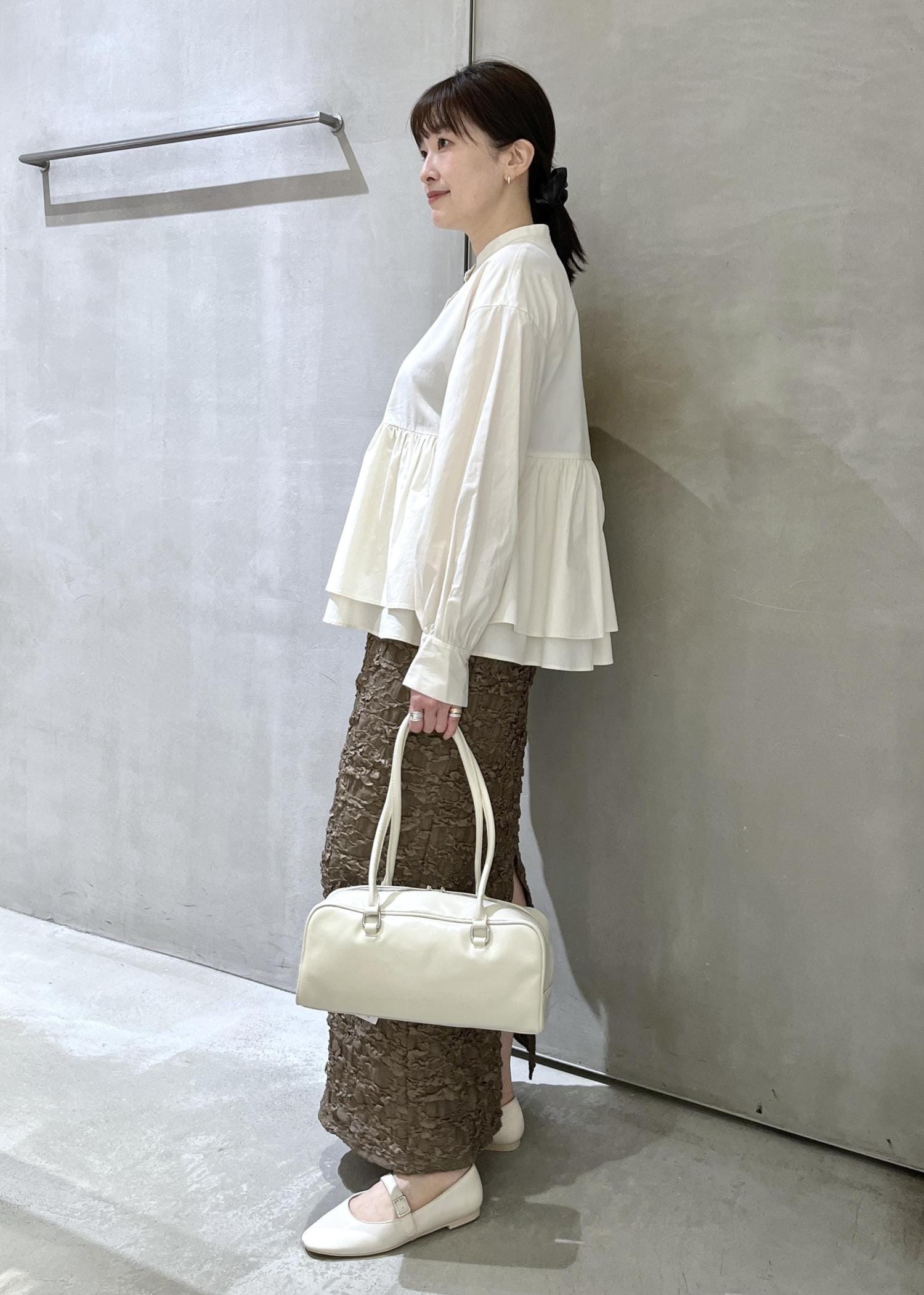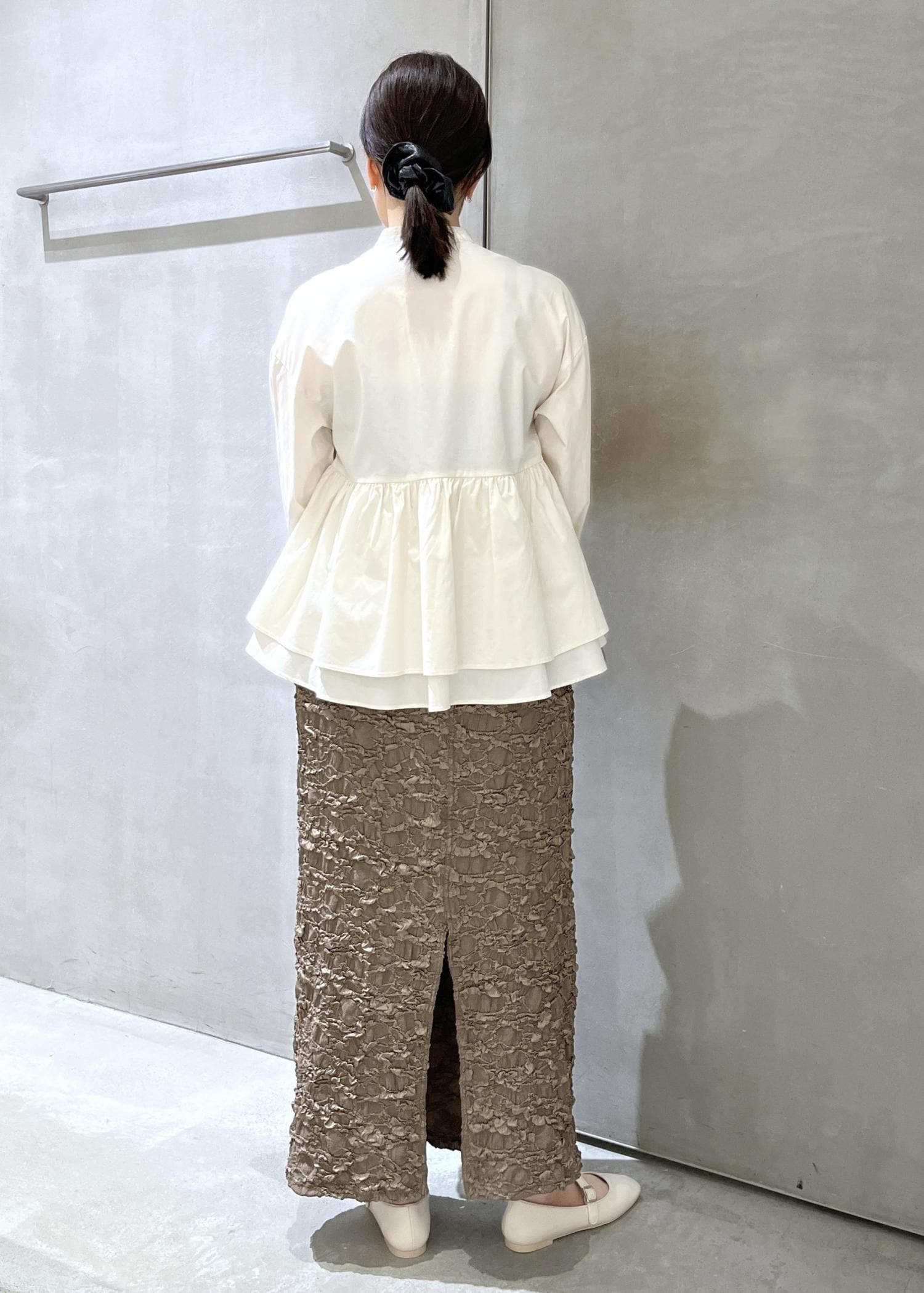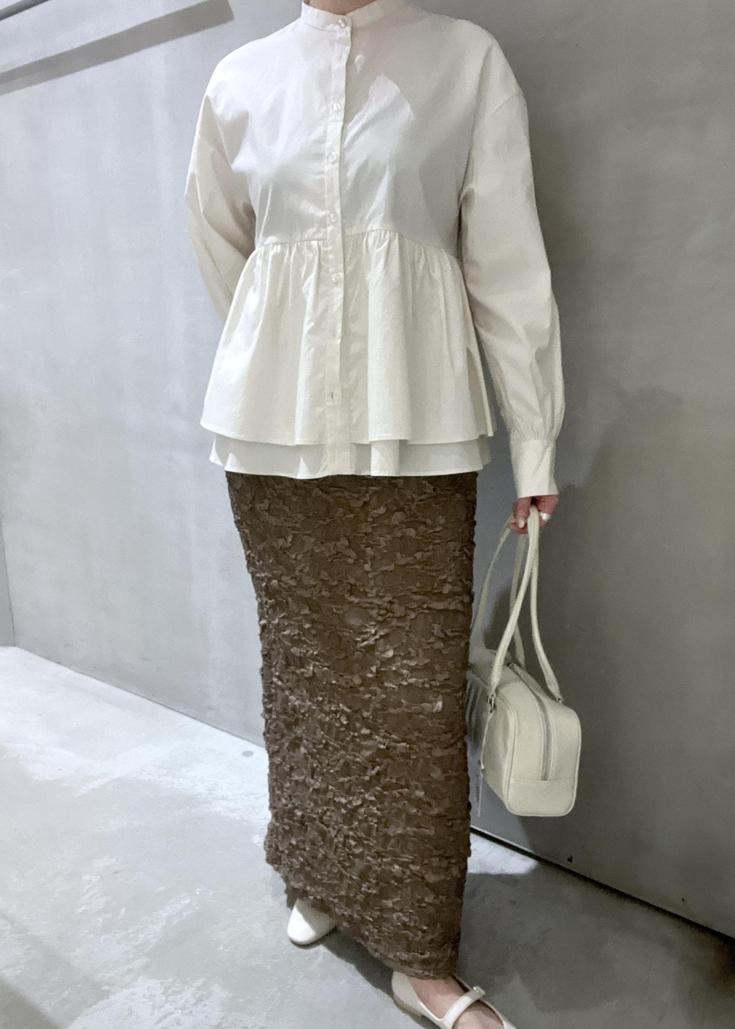 素材感が特徴的なスカートなのでそれは生かしつつ、シルエットが単調にならないように、ペプラムのシャツを合わせました。