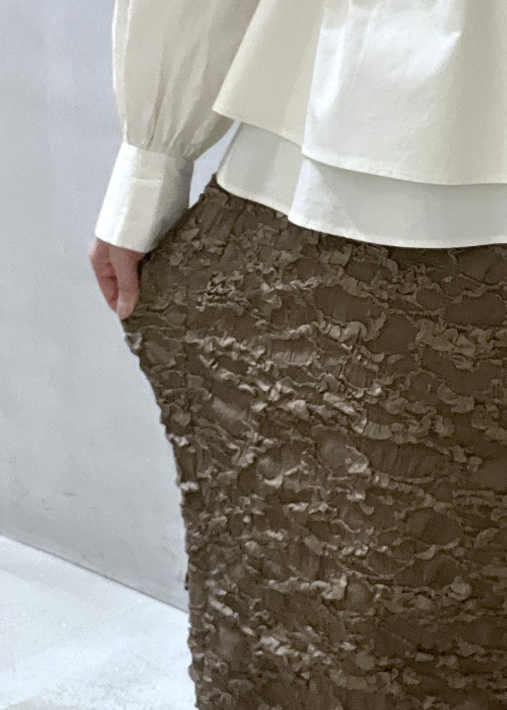 LE CERCLE par ropéポコポコIラインスカートダークブラウン系 / F¥8,800レビュー凸凹感が表情があるスカート。意外とタイト過ぎず、ストンと落ちるようなストレートシルエットです。伸縮性も抜群で、動きやすいです!