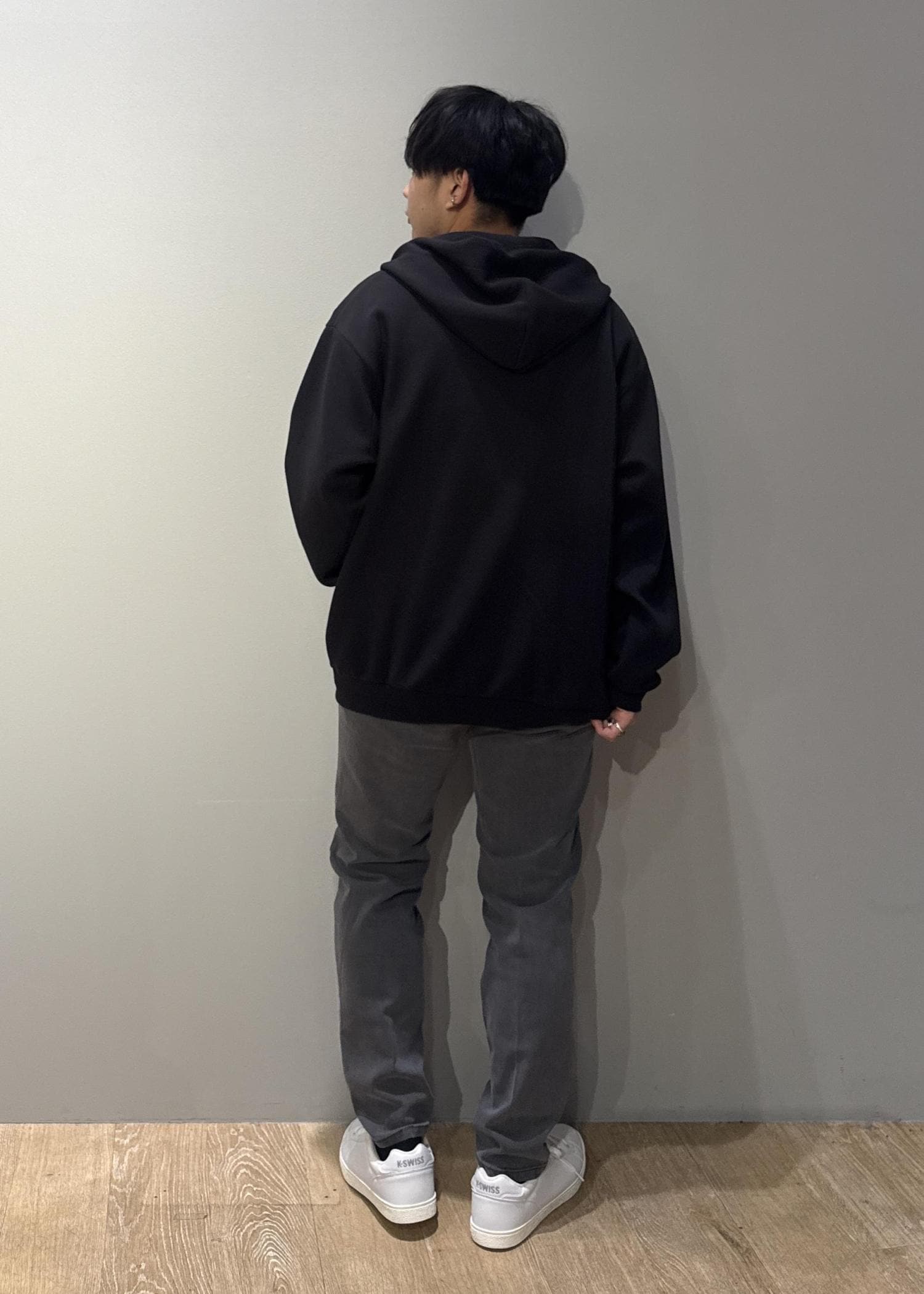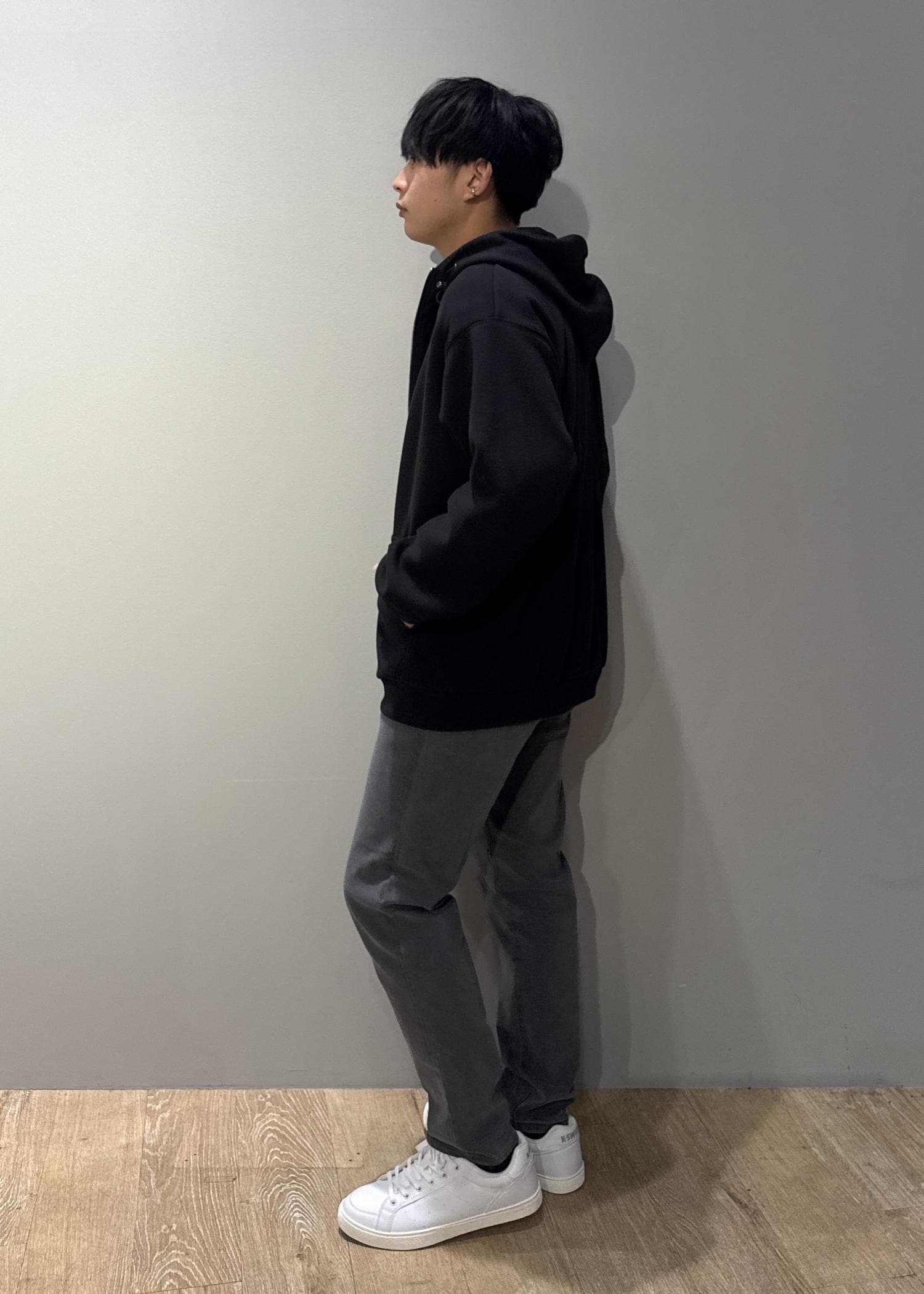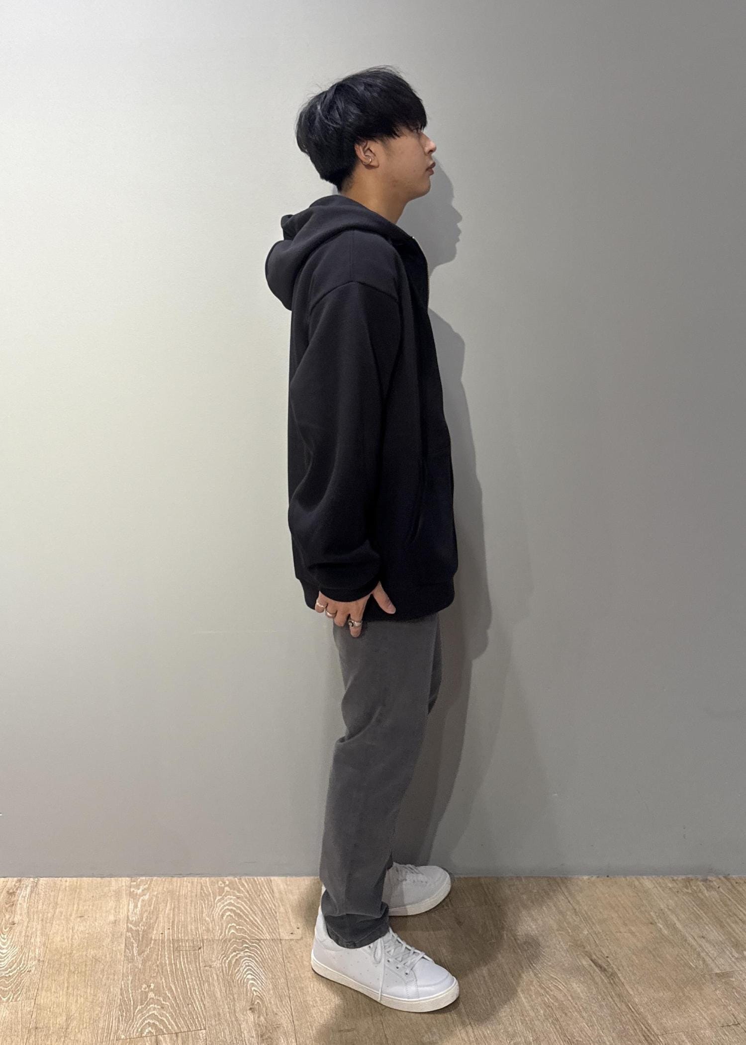今回はスポンディッシュカノコジップパーカーを使ったコーデです。カジュアルな合わせですが、モノトーンで落ち着いたコーデにしてみました。
