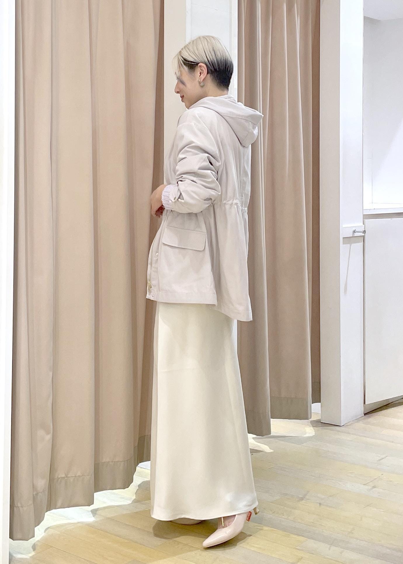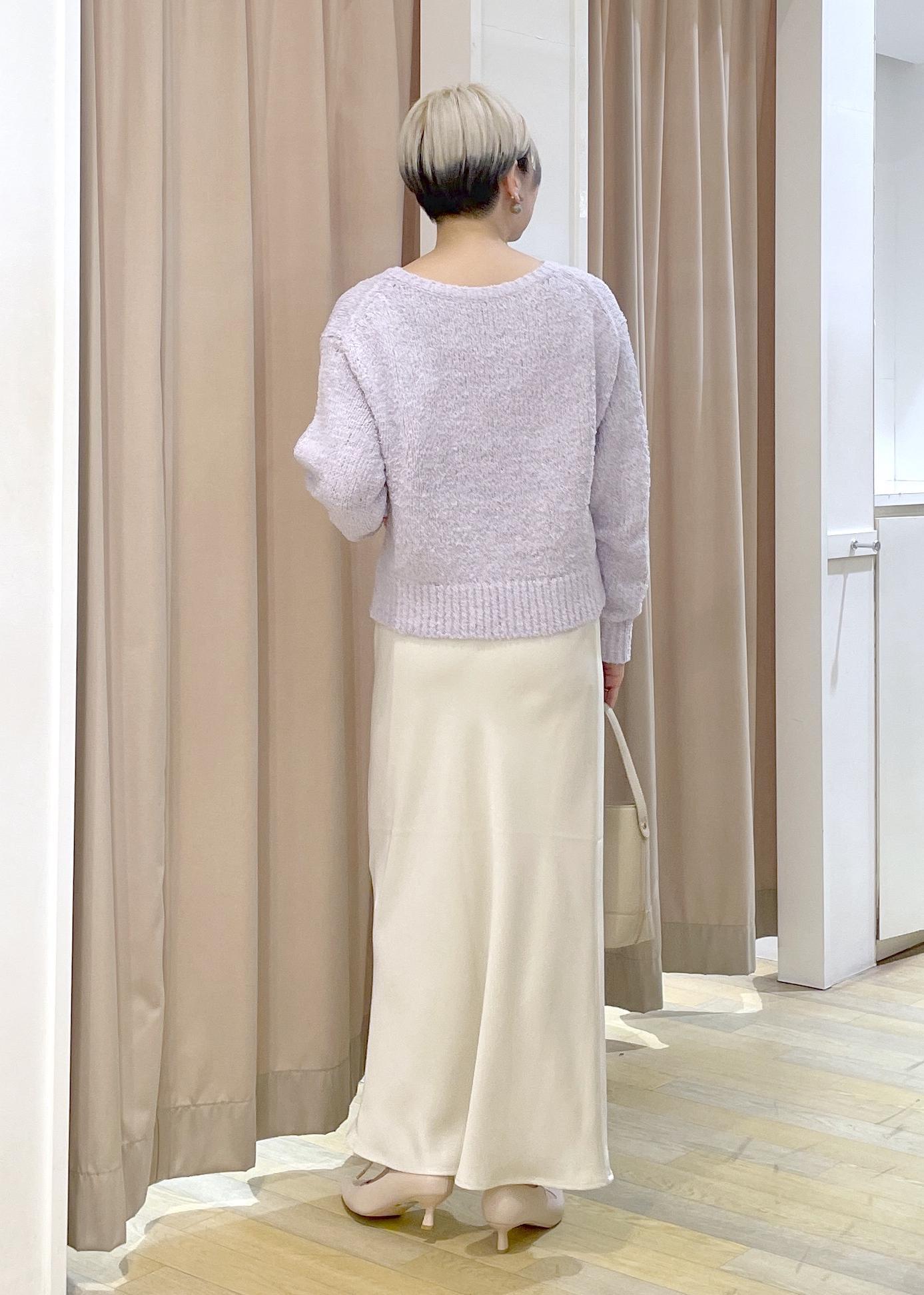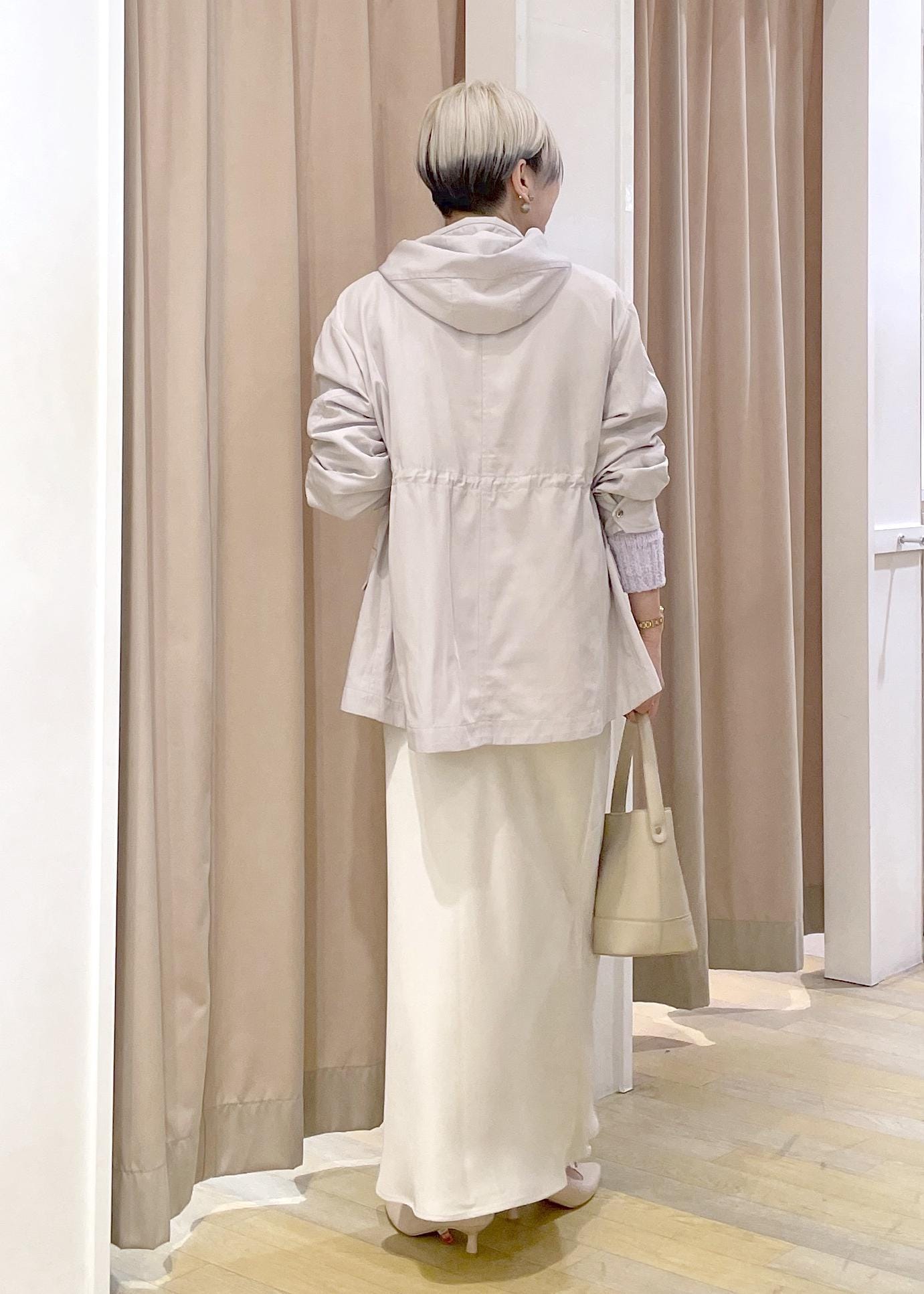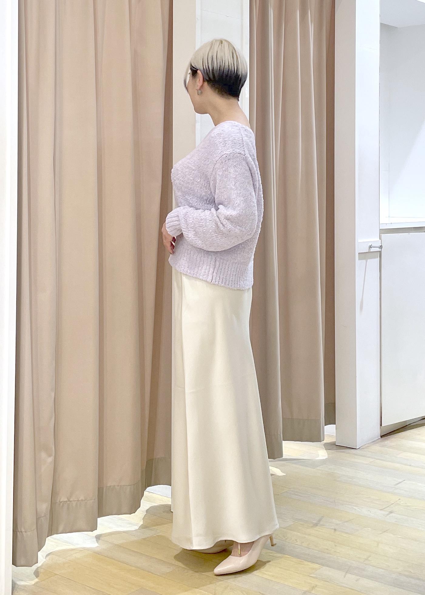 淡いトーンの柔らかい組み合わせですが、素材感の違いでメリハリをつけたコーデになります!