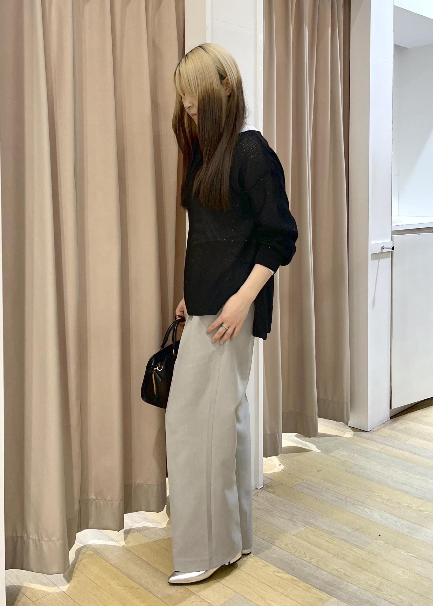 黒いトップスで重くならないようにインナーや足元に明るい色のアイテムを持ってきました!