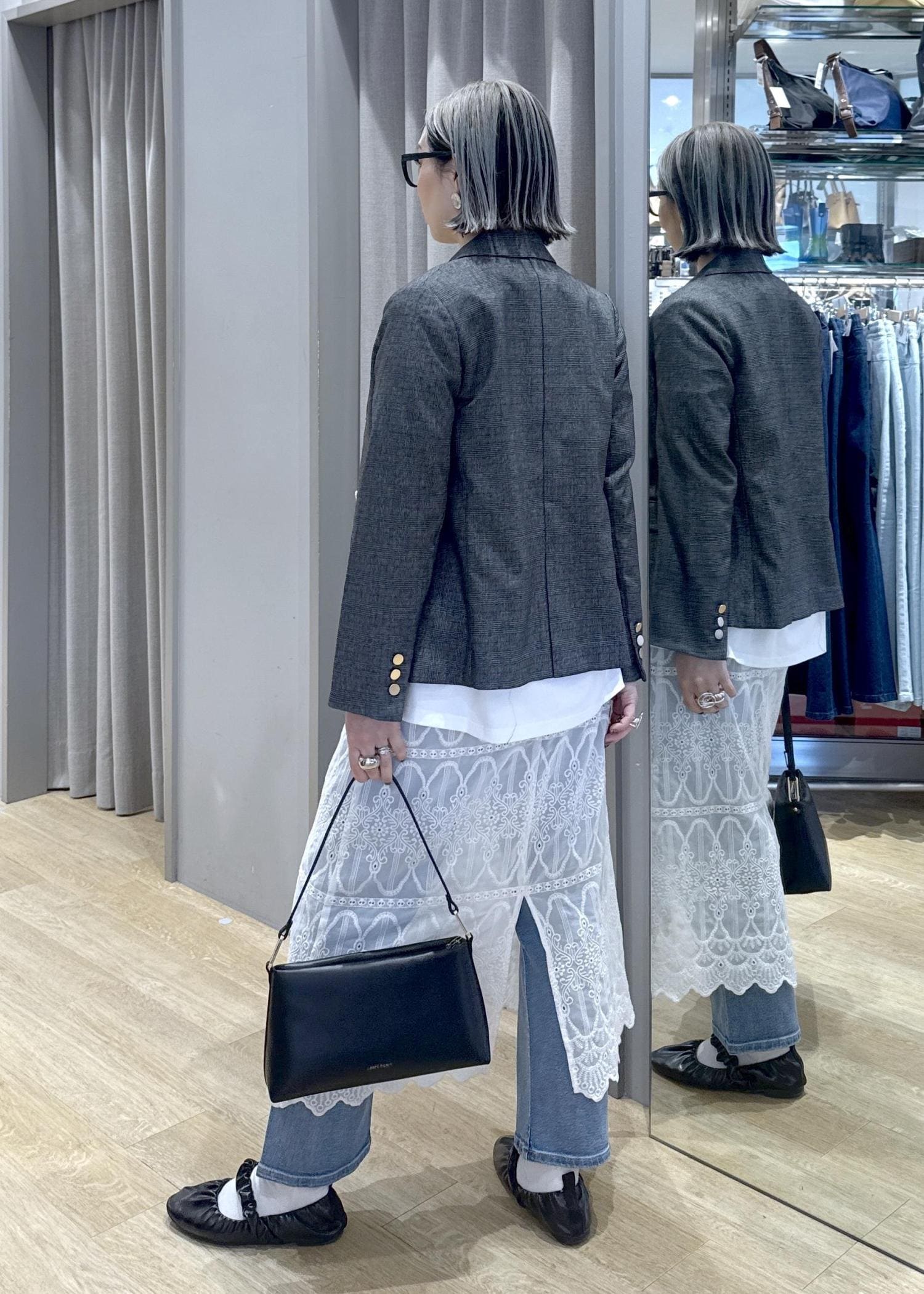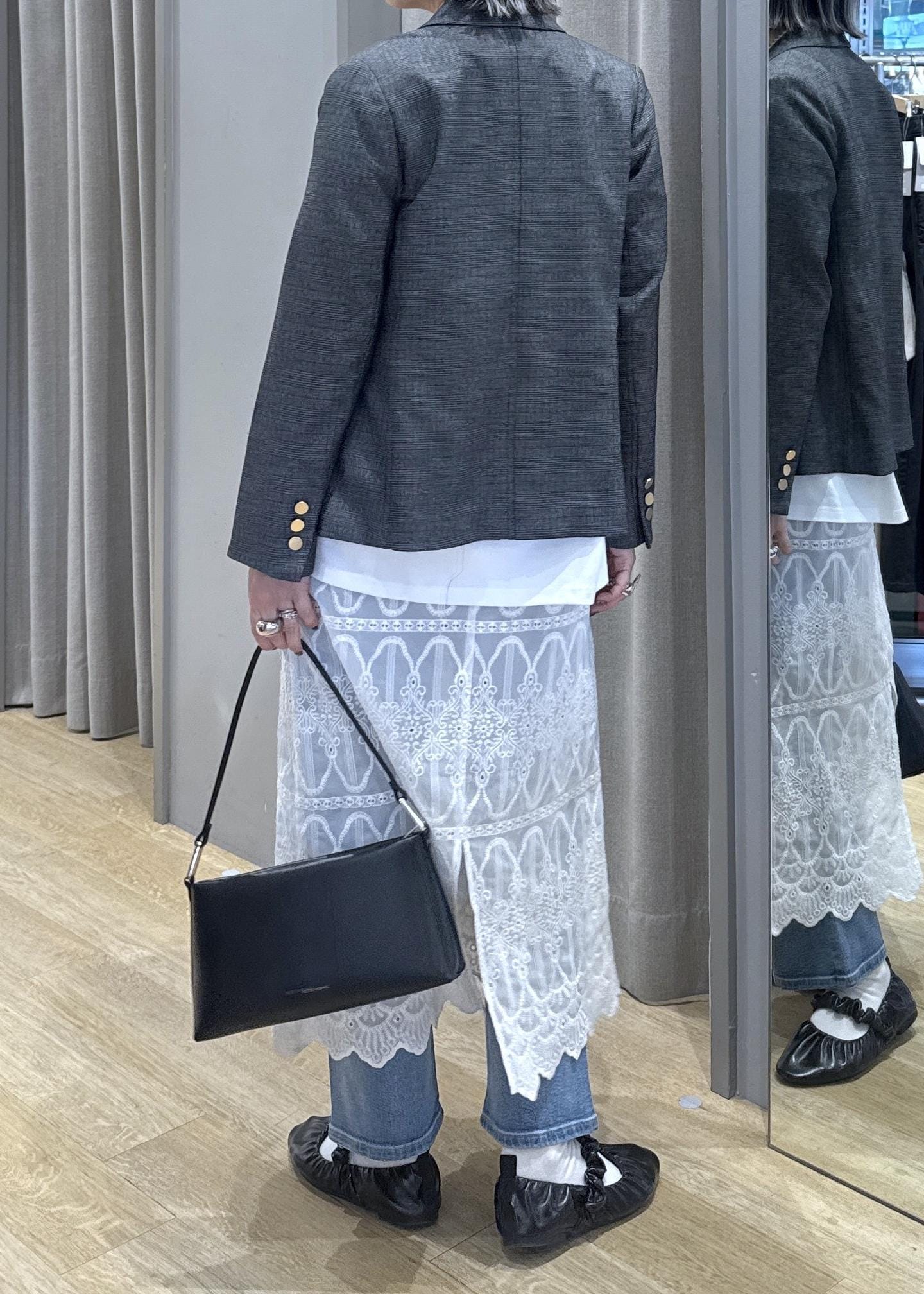 レースをプラスすることで体型カバーとフェミニンさをプラス。