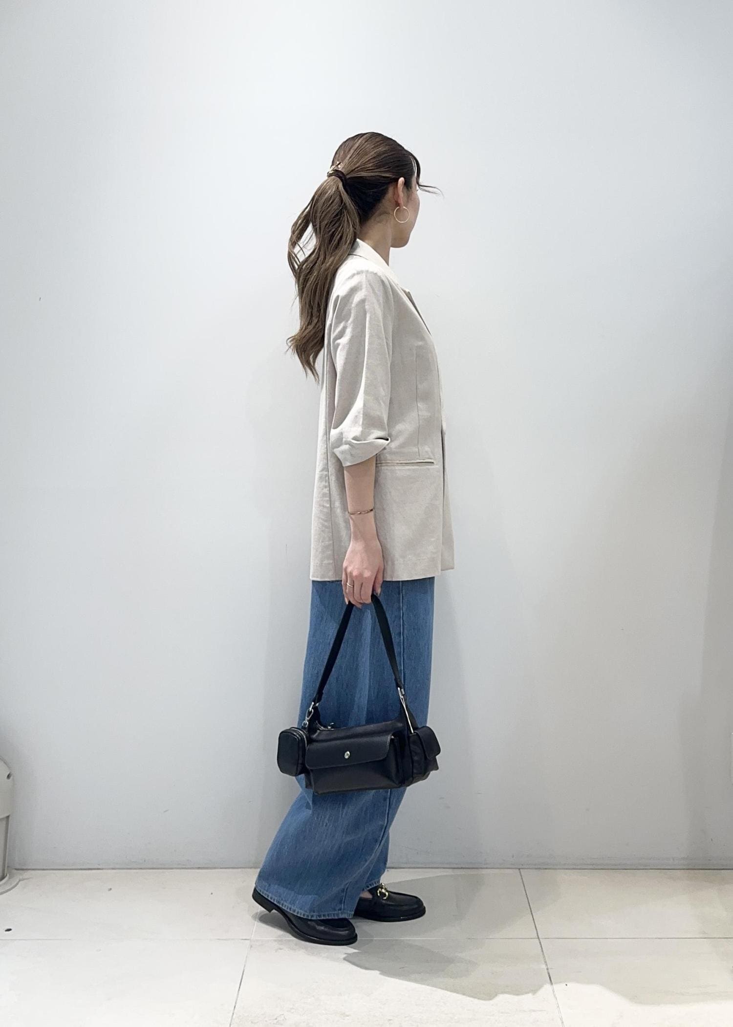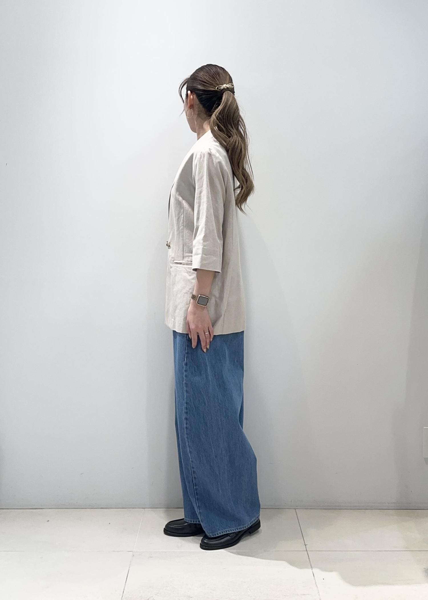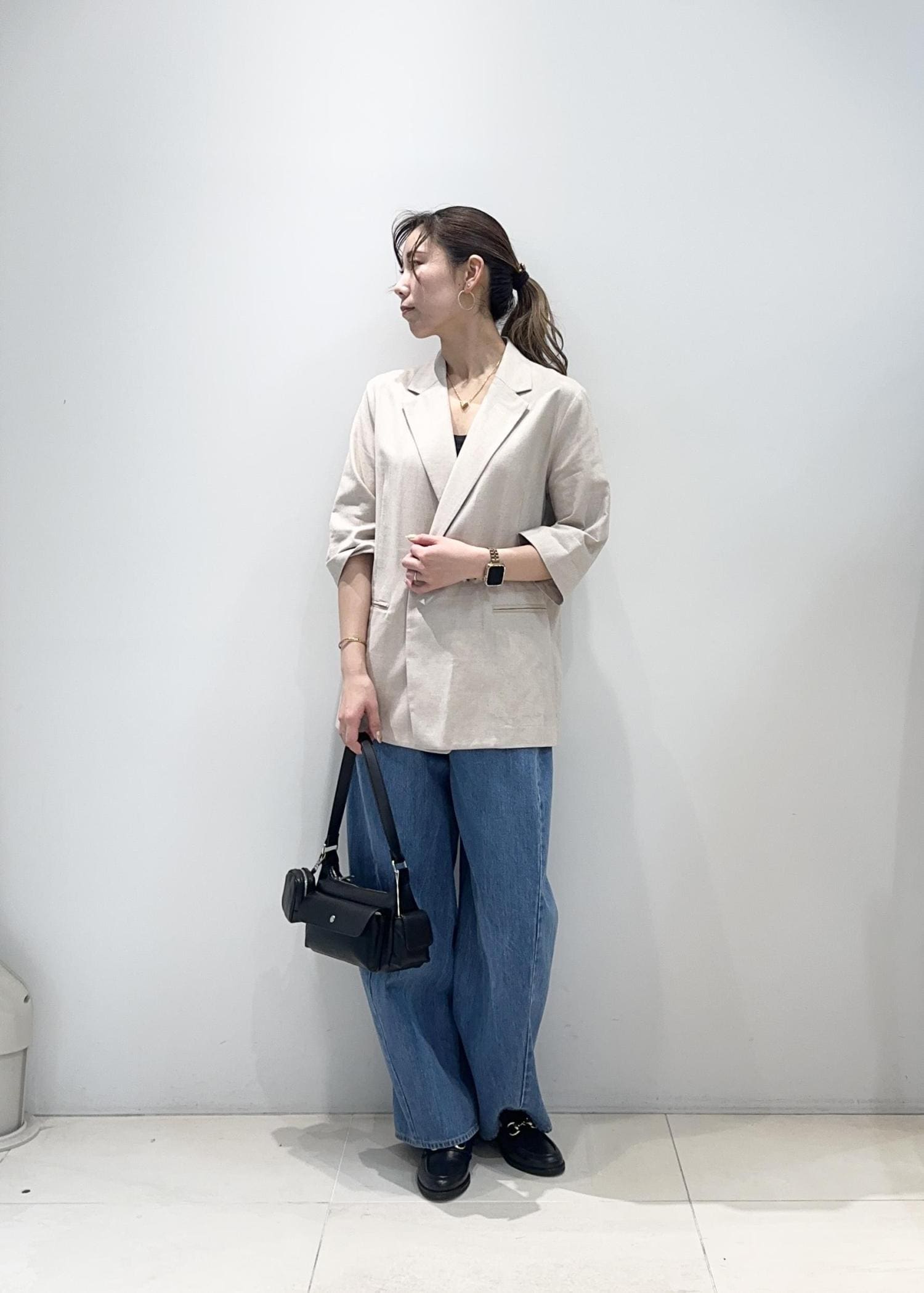 軽やかなジャケットに、ゆったりとしたデニムを合わせた