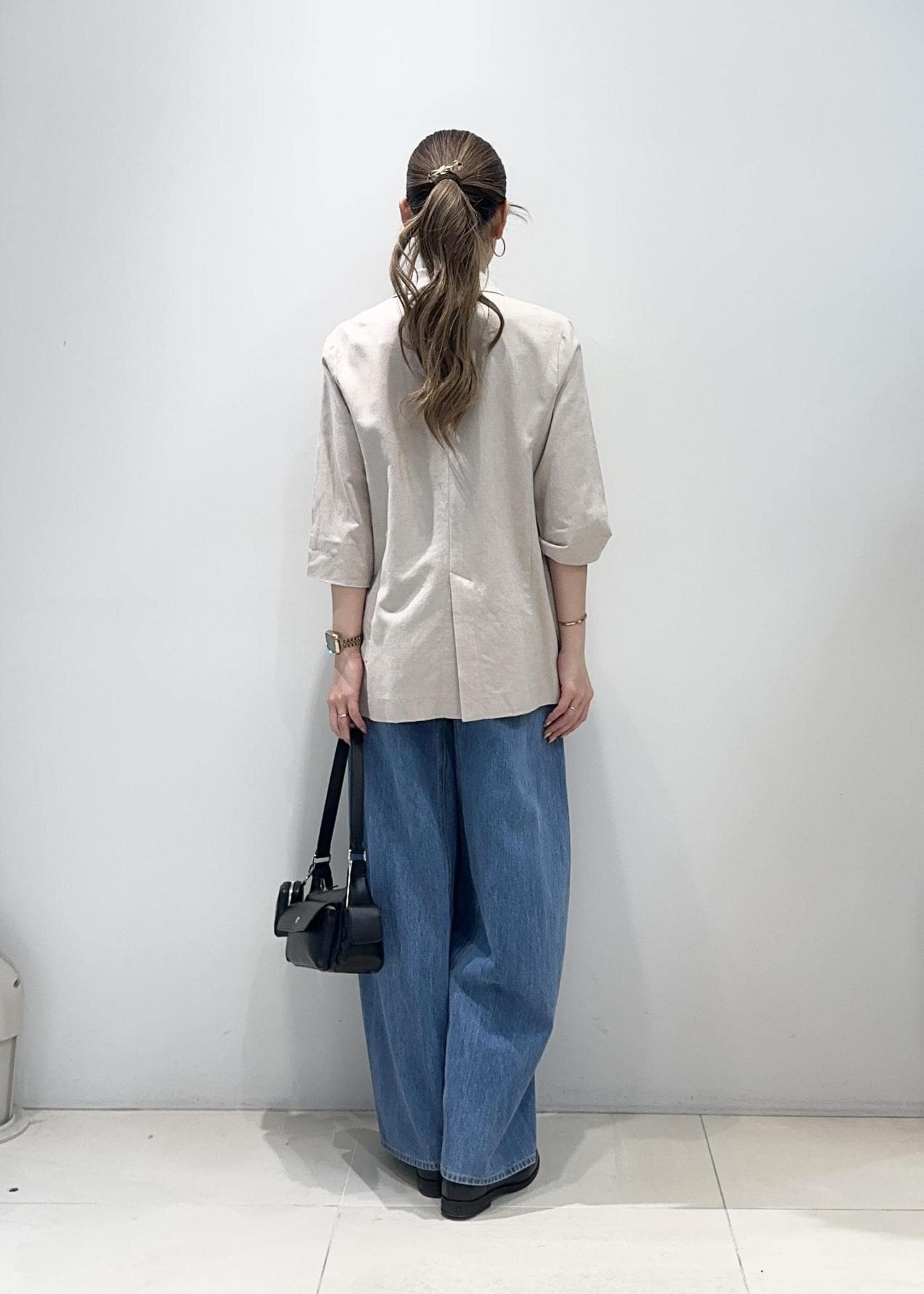 程よくゆとりのあるサイズ感で、Tシャツやタンクトップの上からも羽織りやすく、抜け感のある大人カジュアルスタイルにおすすめです。 -