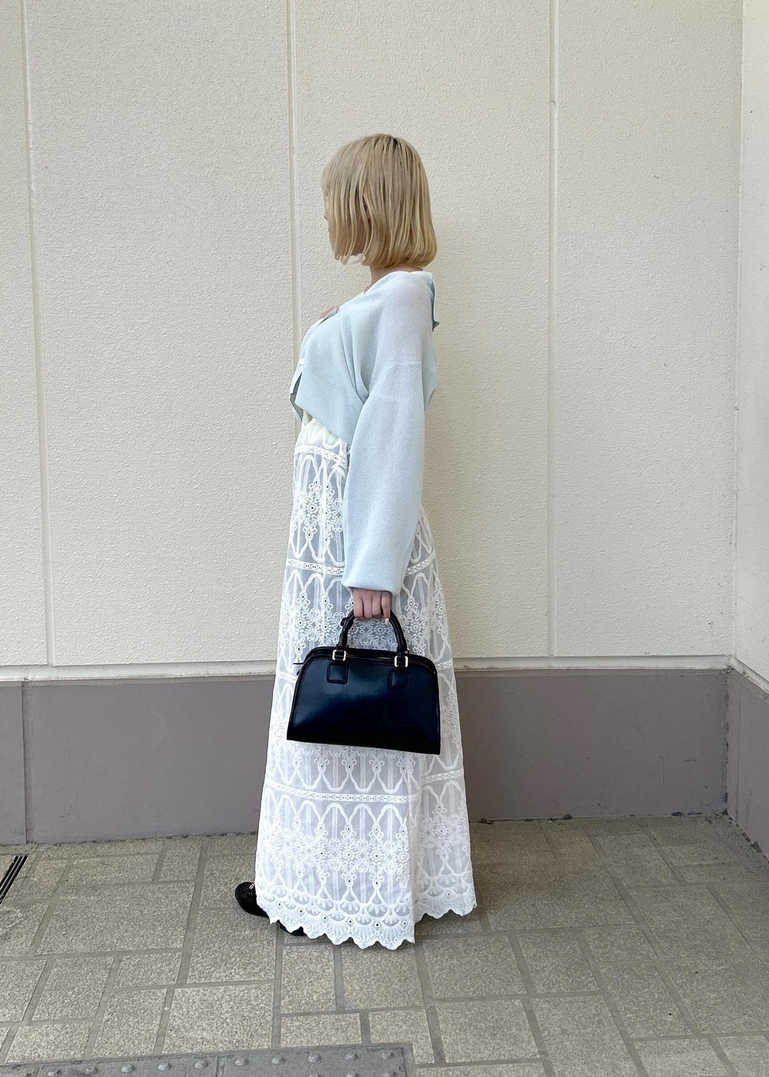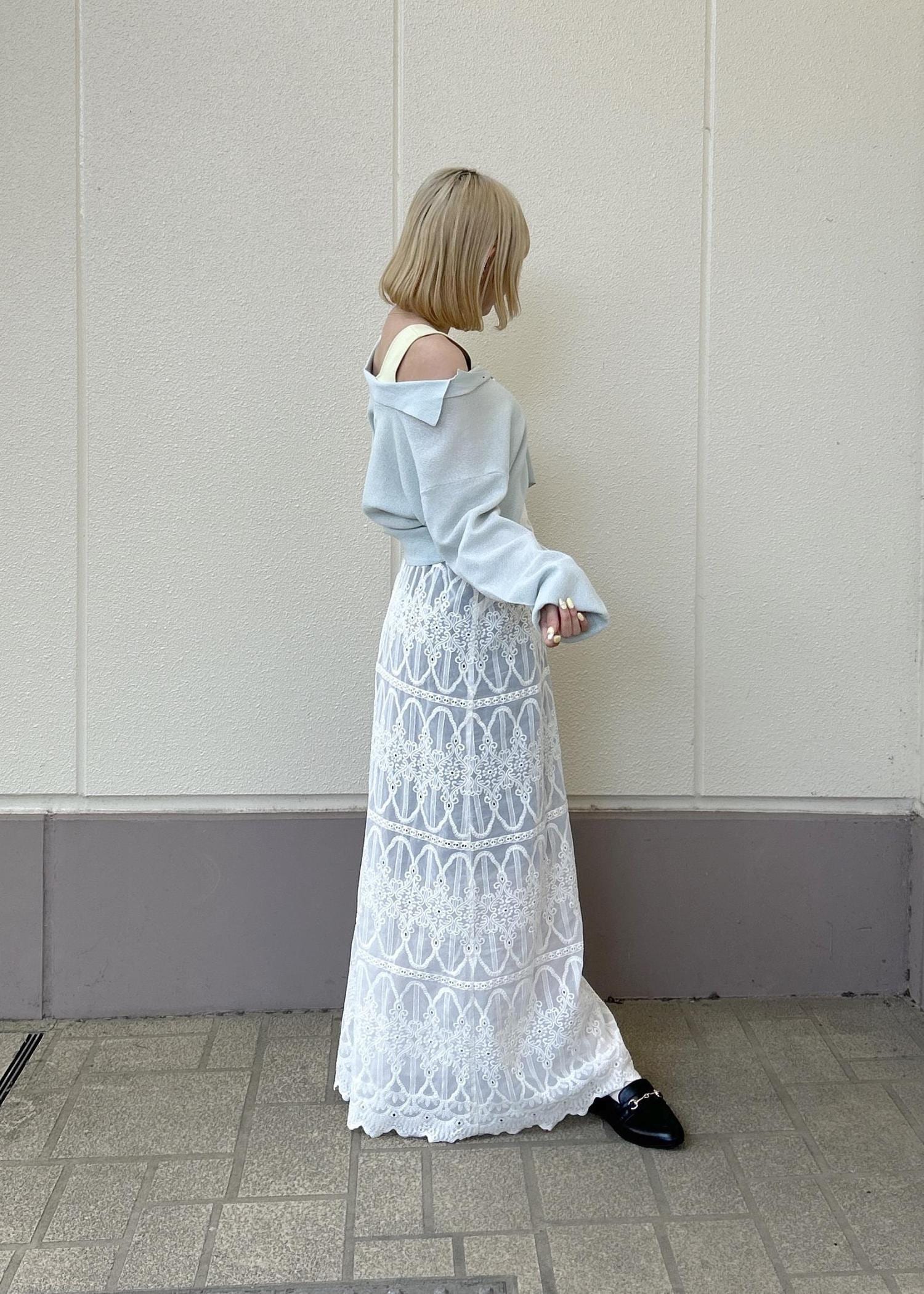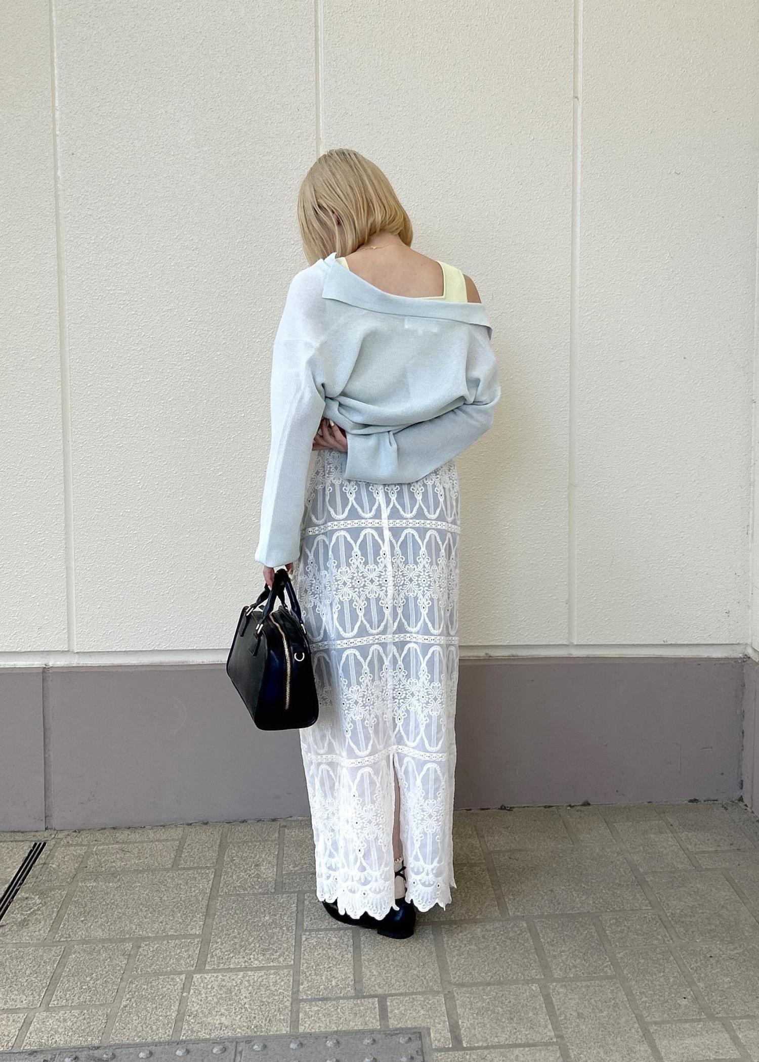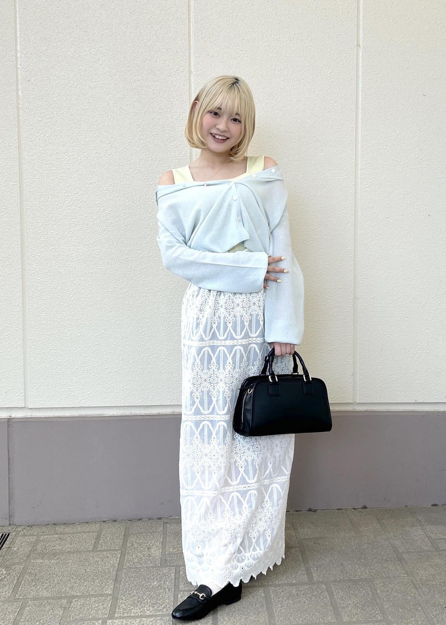 春の人気カラーグリーンを入れることによって温かみを感じられます。またカーディガンをしたの方で着ることにより、オフショルのようなデザインに見せることができます!