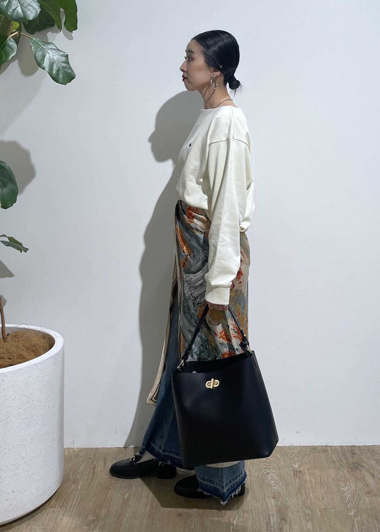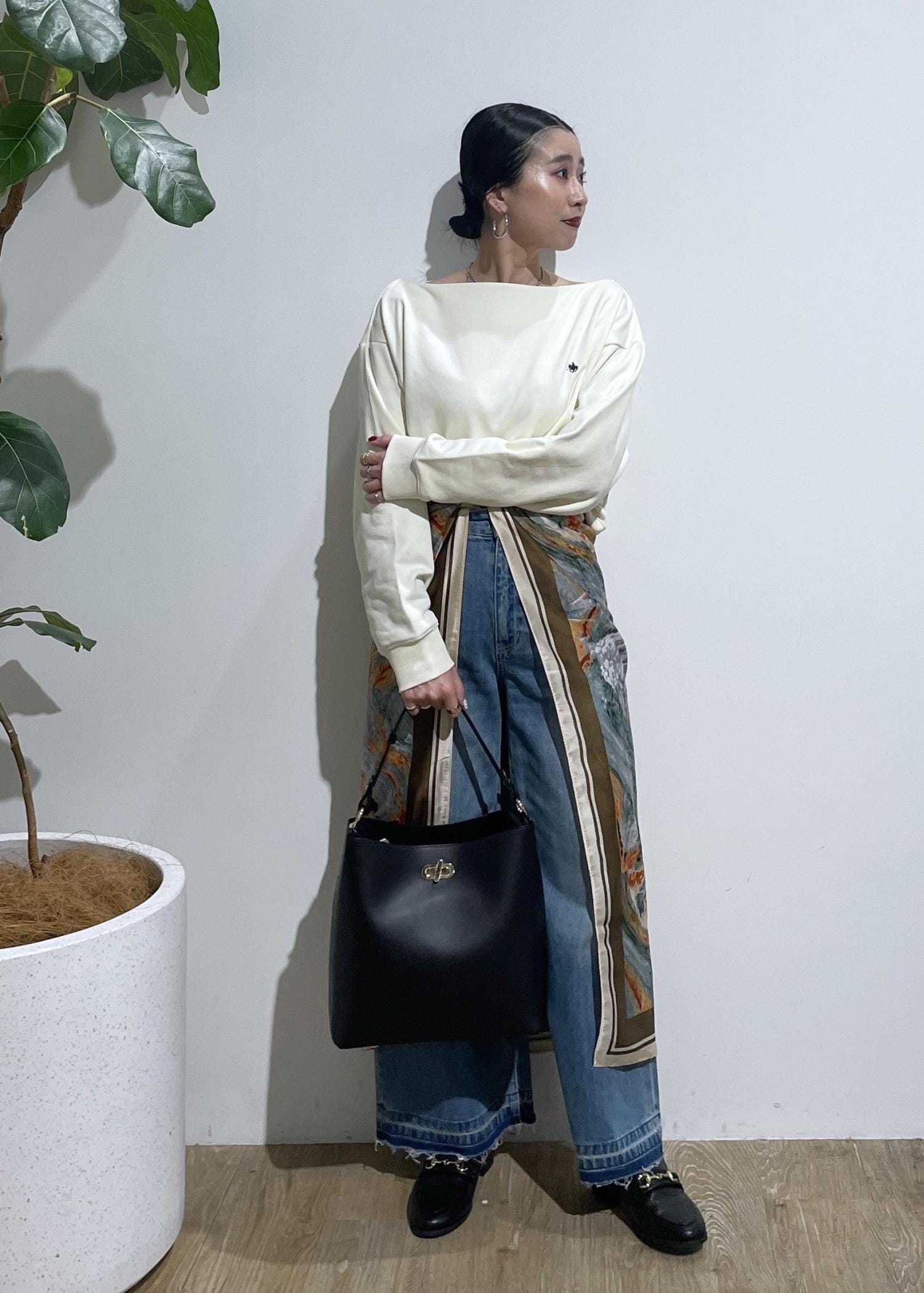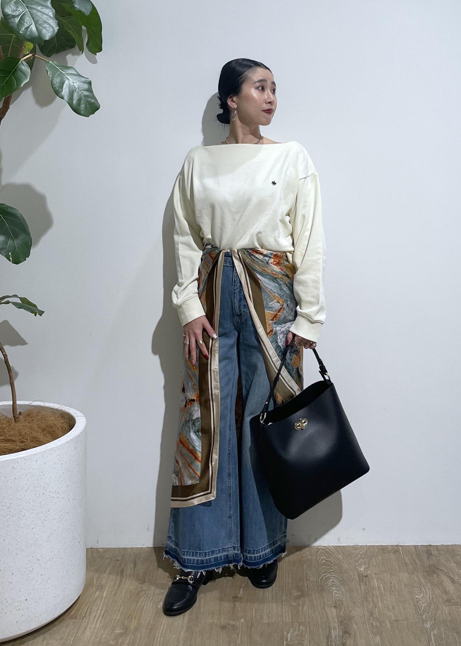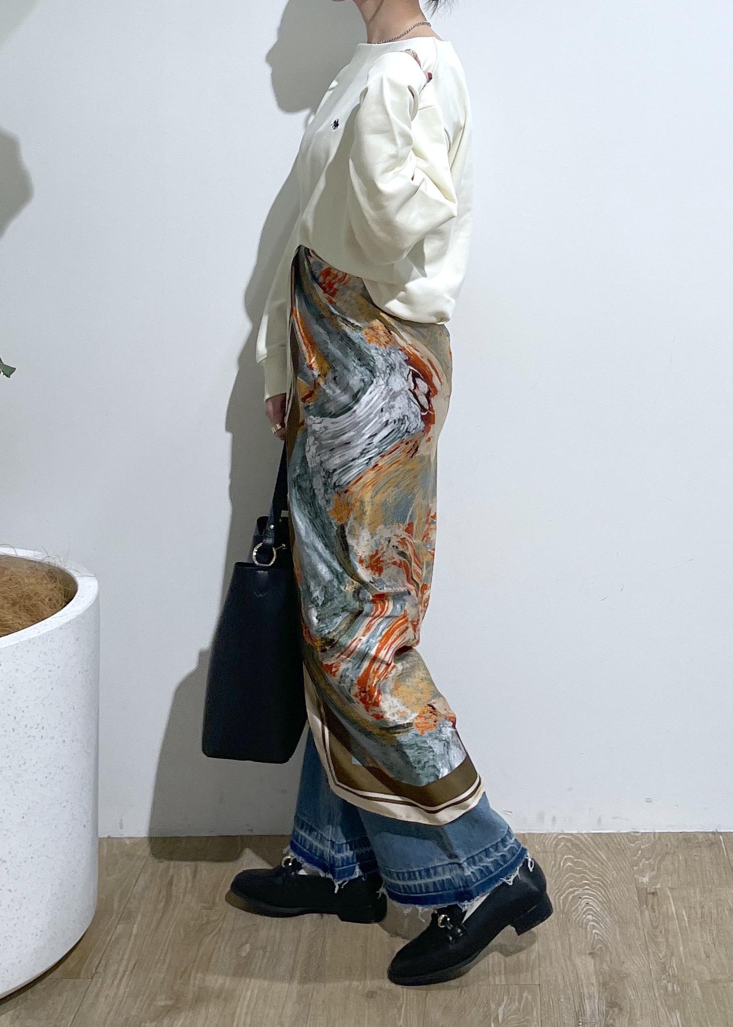 体型カバーにもなるスカーフ‼︎1枚持っているととても便利です。スウェットでも女性らしさを大事にしたコーデにしました。