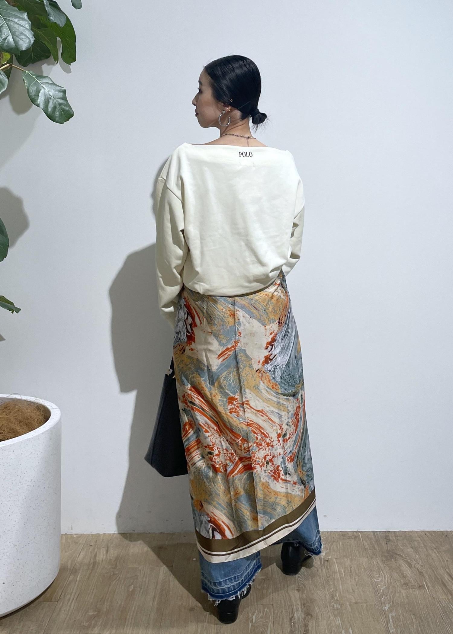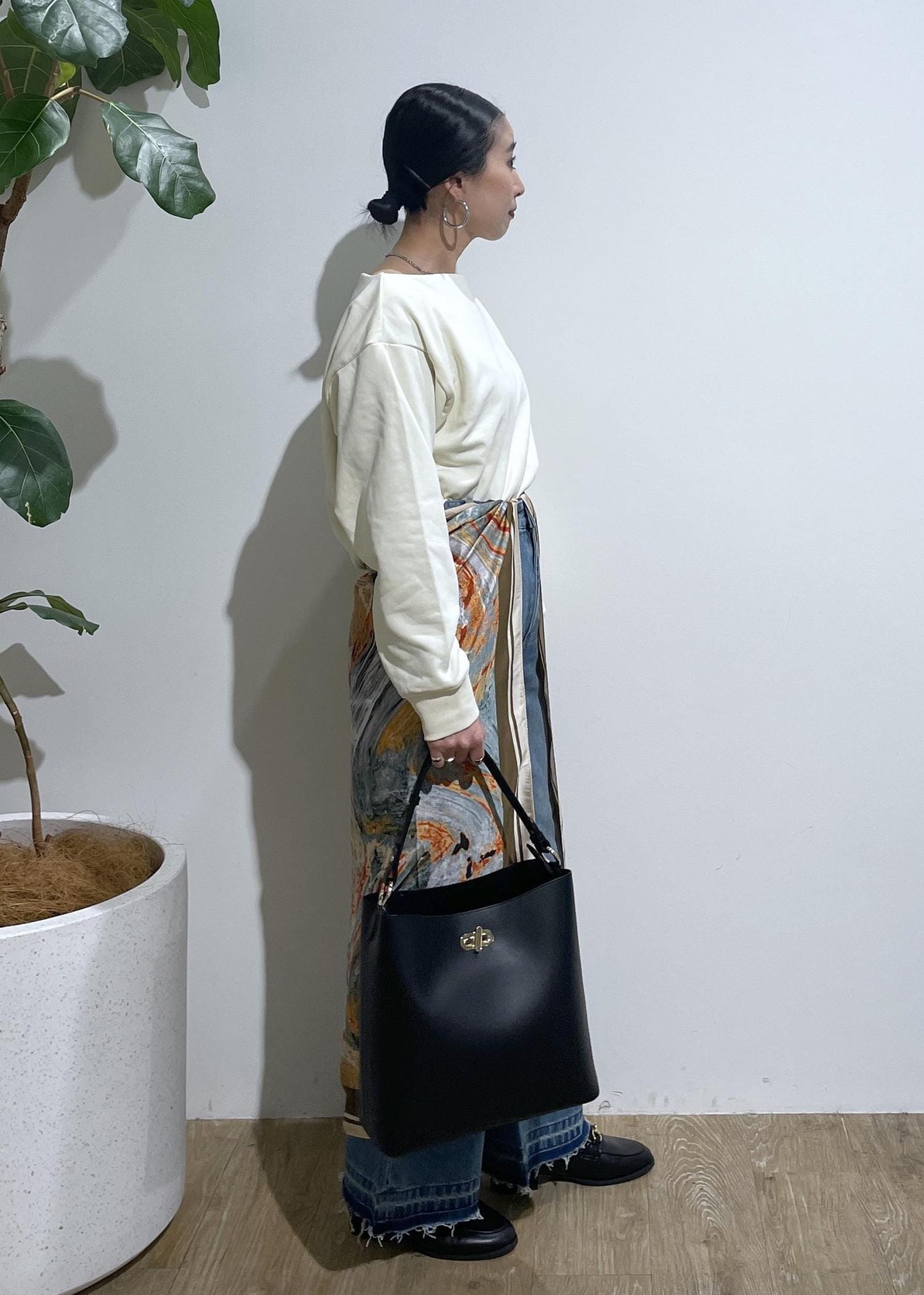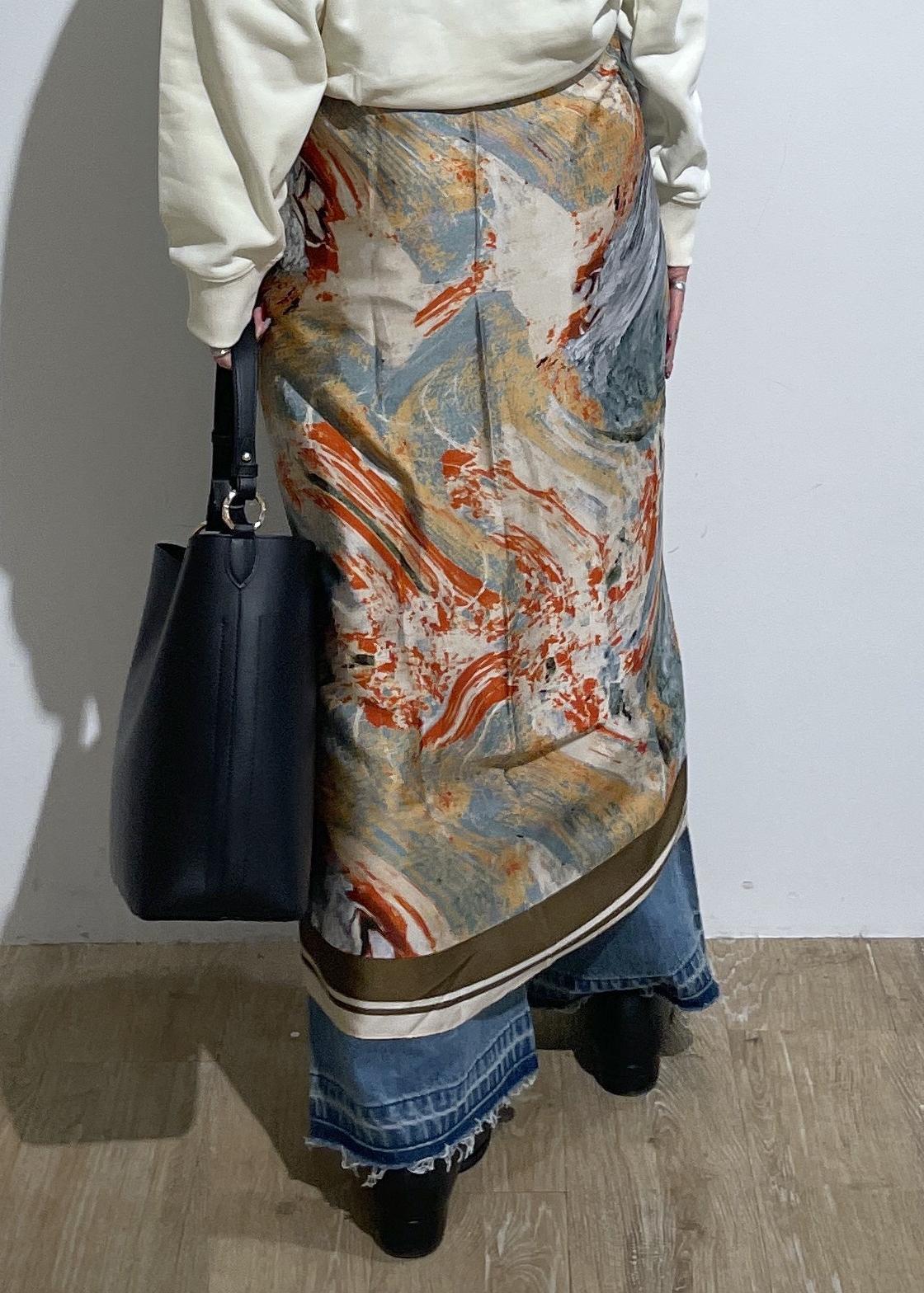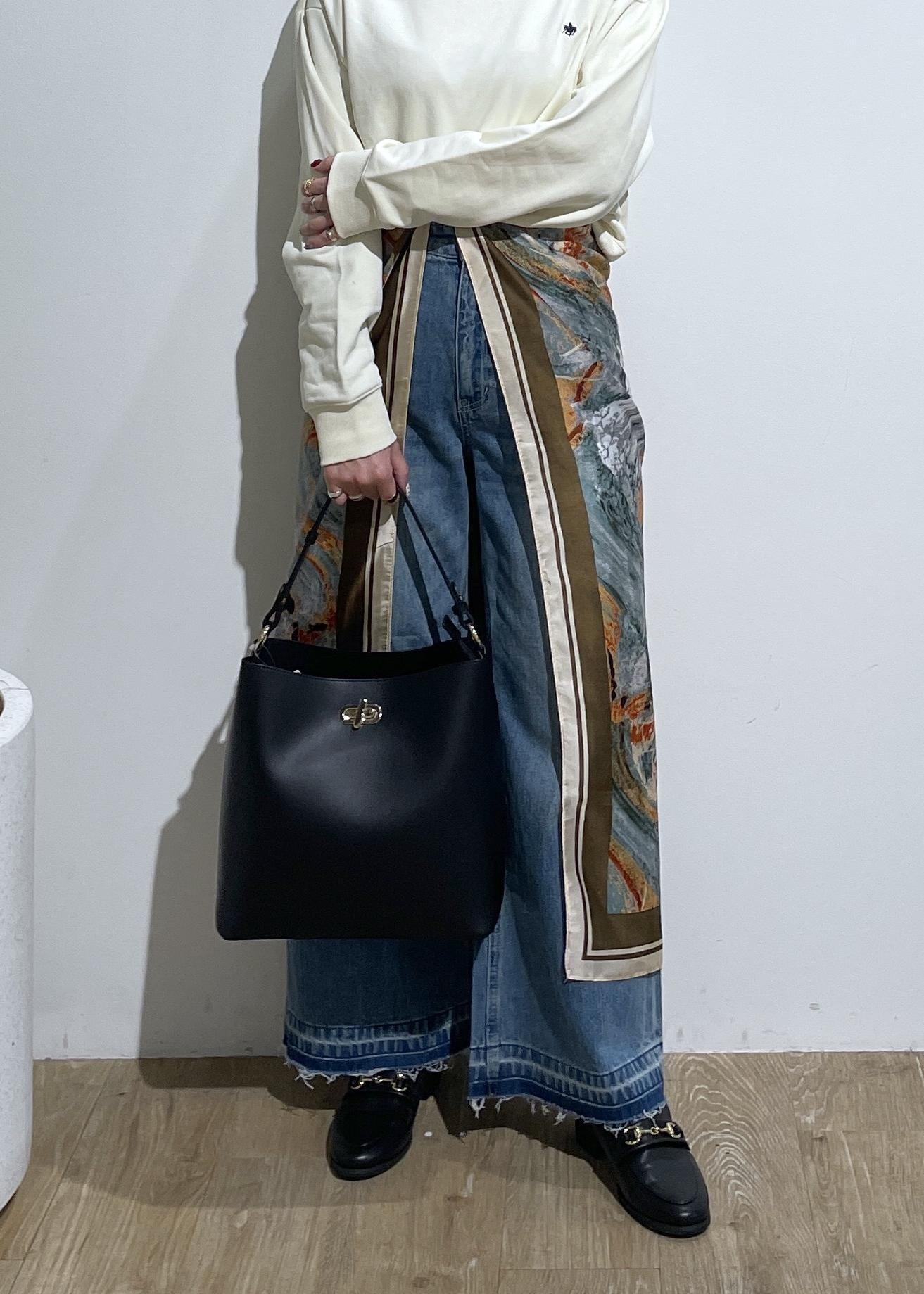 体型カバーにもなるスカーフ‼︎1枚持っているととても便利です。スウェットでも女性らしさを大事にしたコーデにしました。
