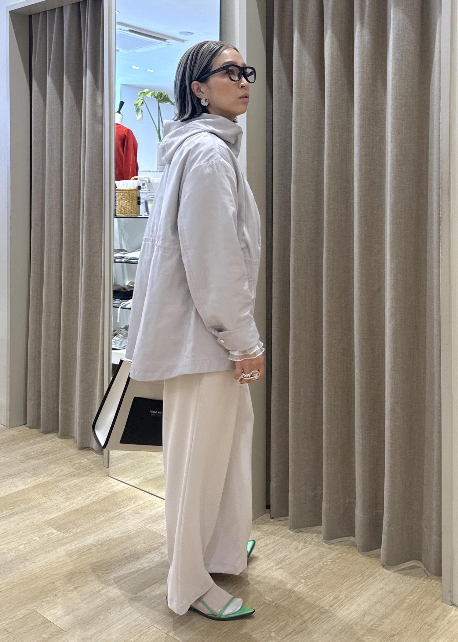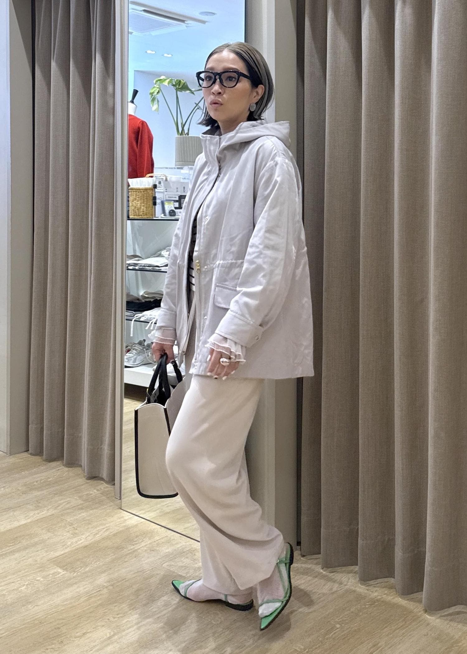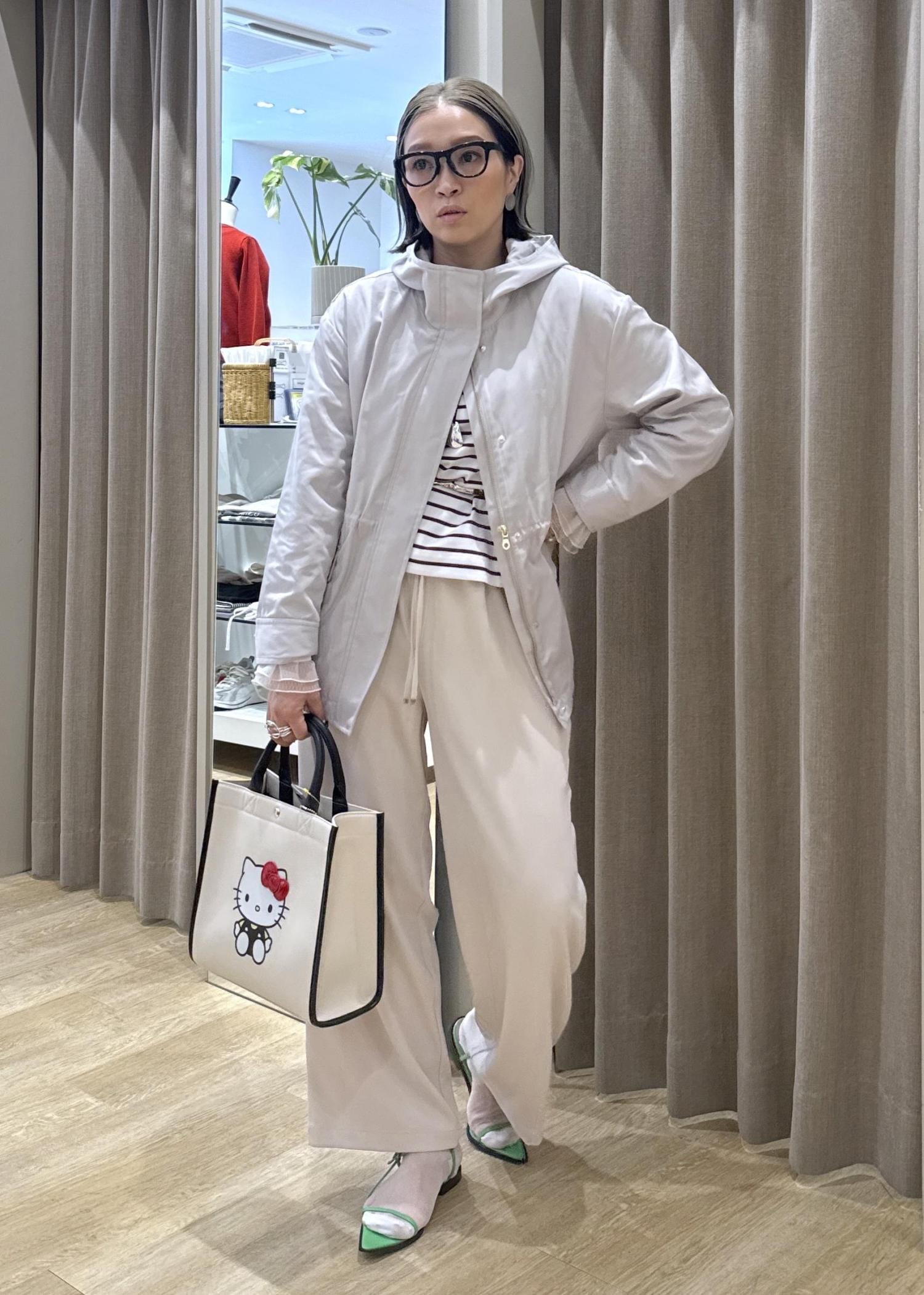 インナーや小物で色や柄を入れると一気におしゃれにまとまりますよ♪
