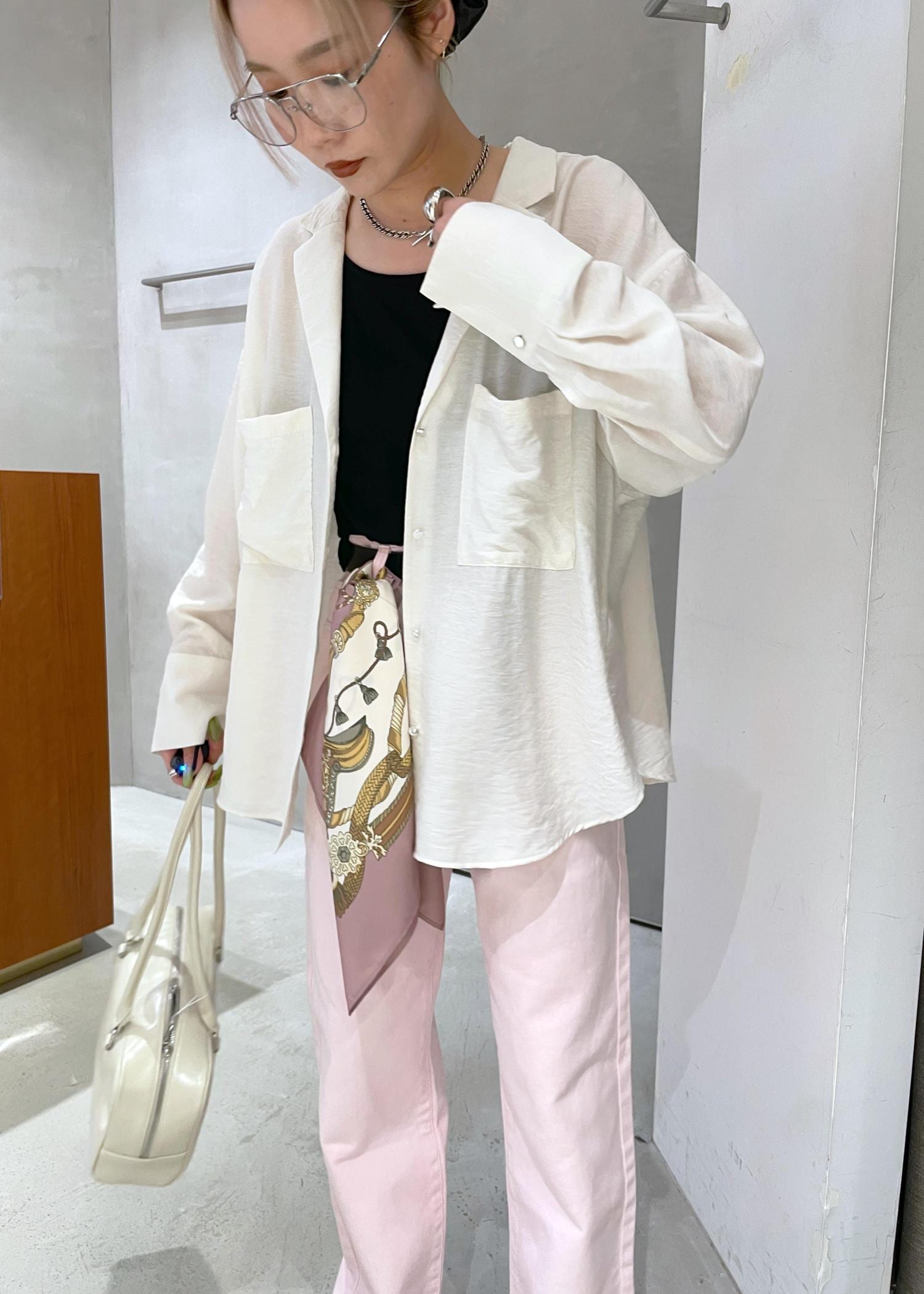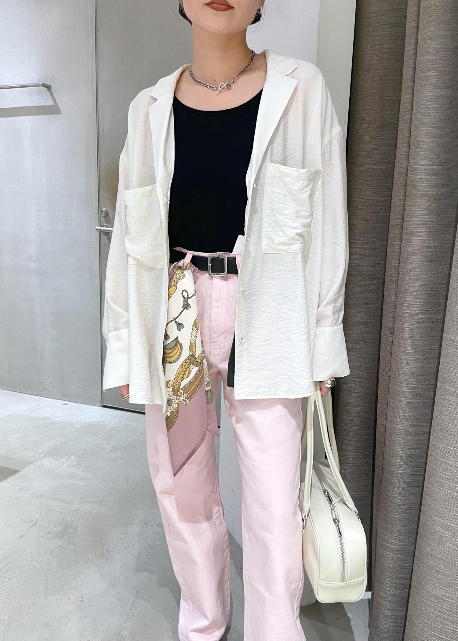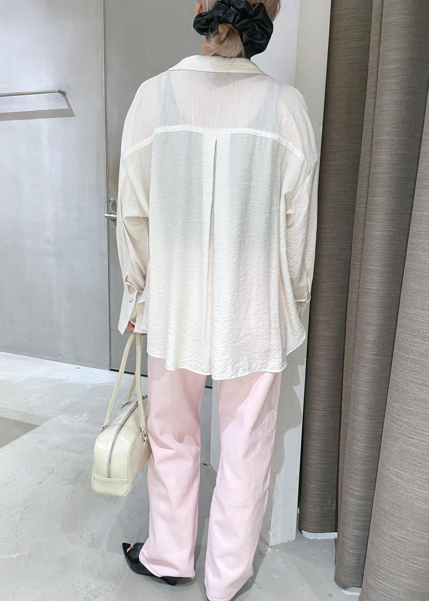 長い季節で羽織れるシャツブラウス、シンプルなデザインがどんなスタイルにも合わせやすいので、温度調節に持ち歩くのもおすすめです。