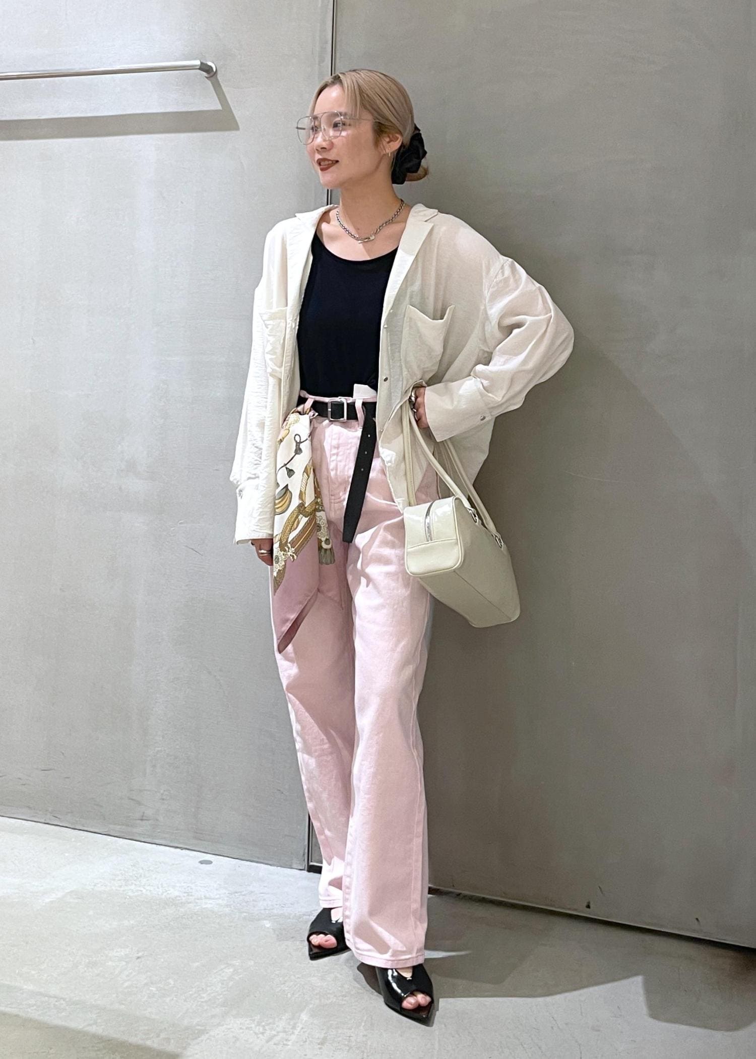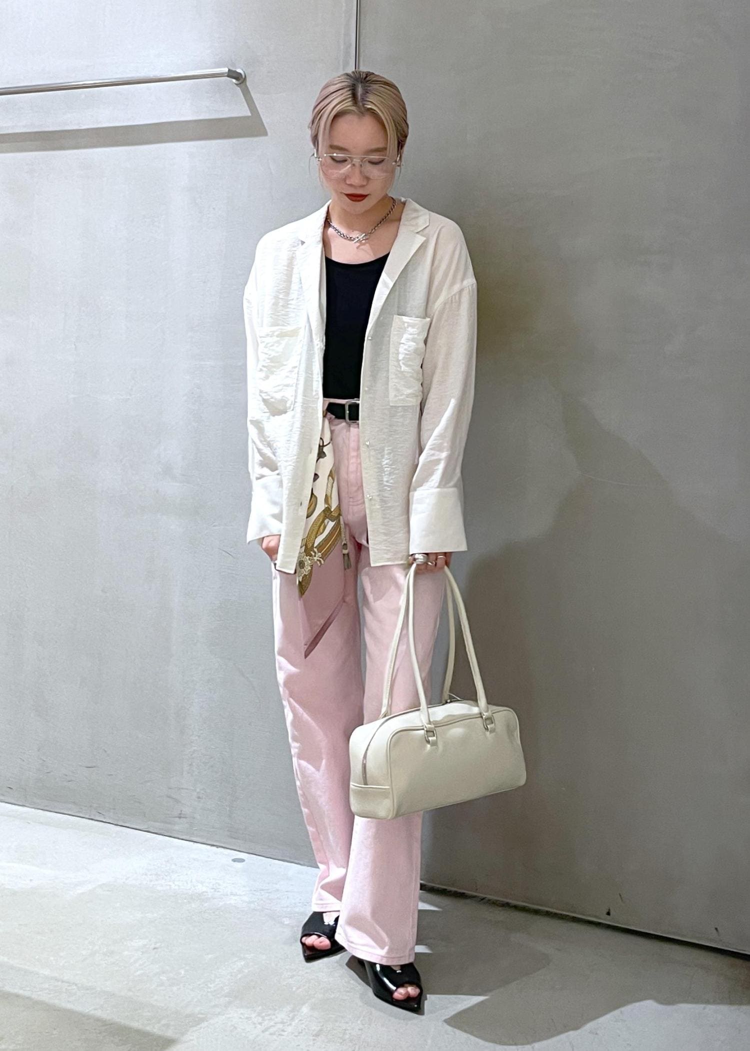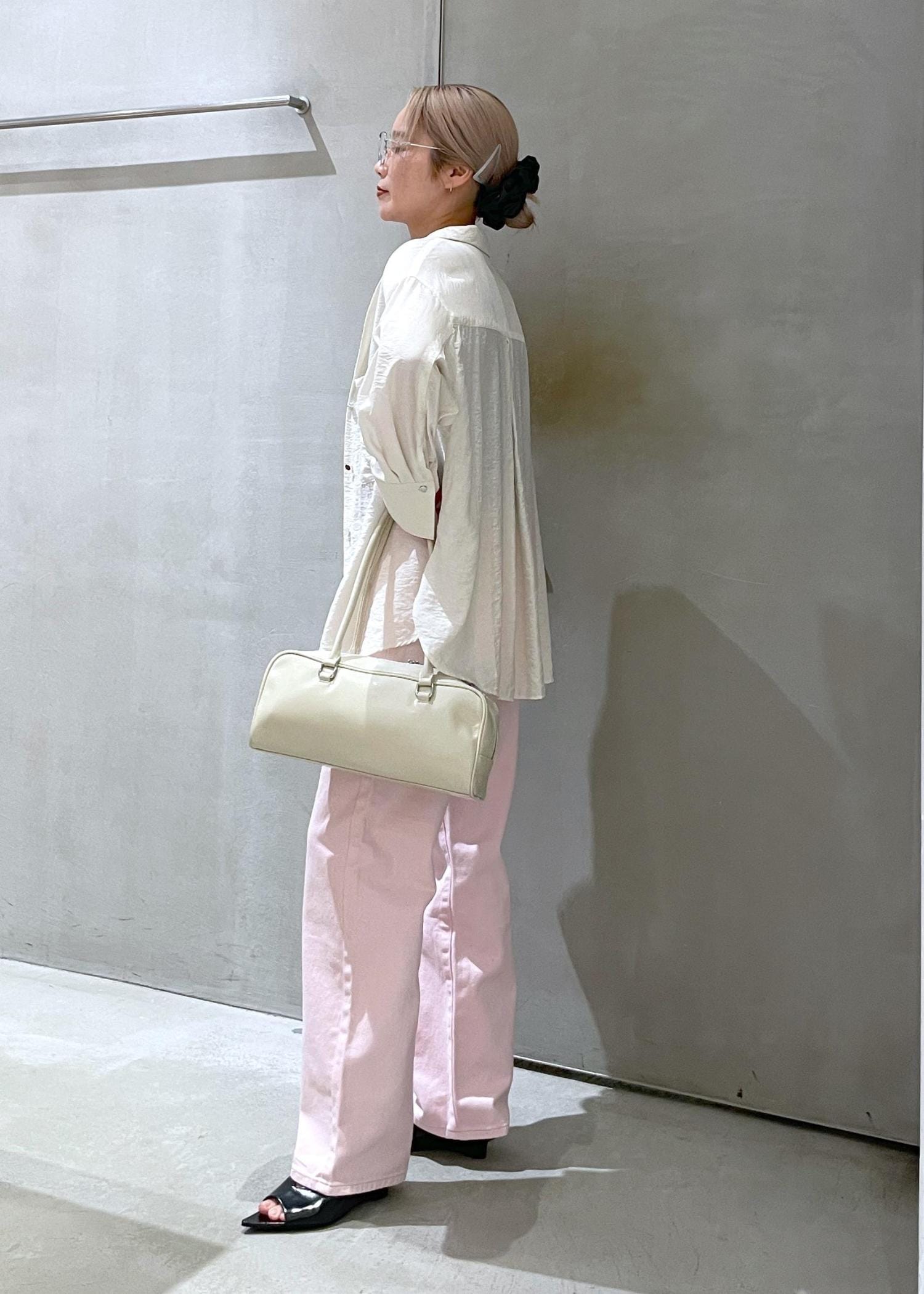 長い季節で羽織れるシャツブラウス、シンプルなデザインがどんなスタイルにも合わせやすいので、温度調節に持ち歩くのもおすすめです。