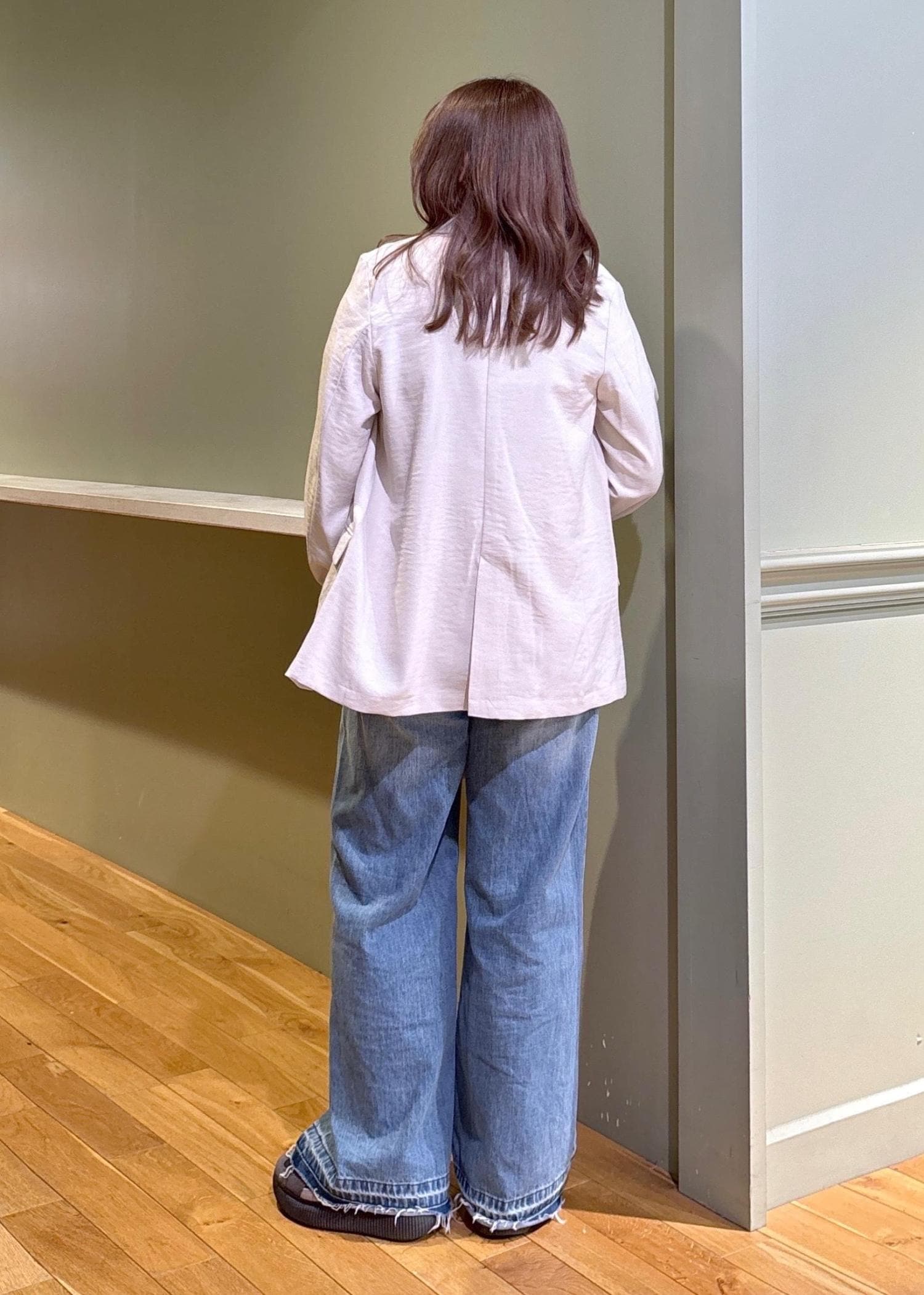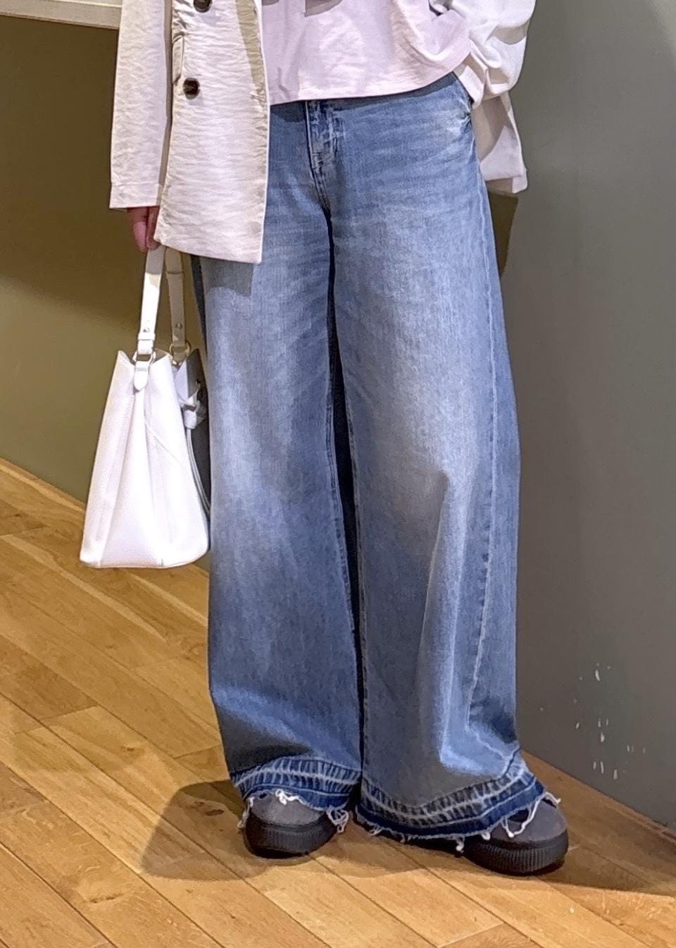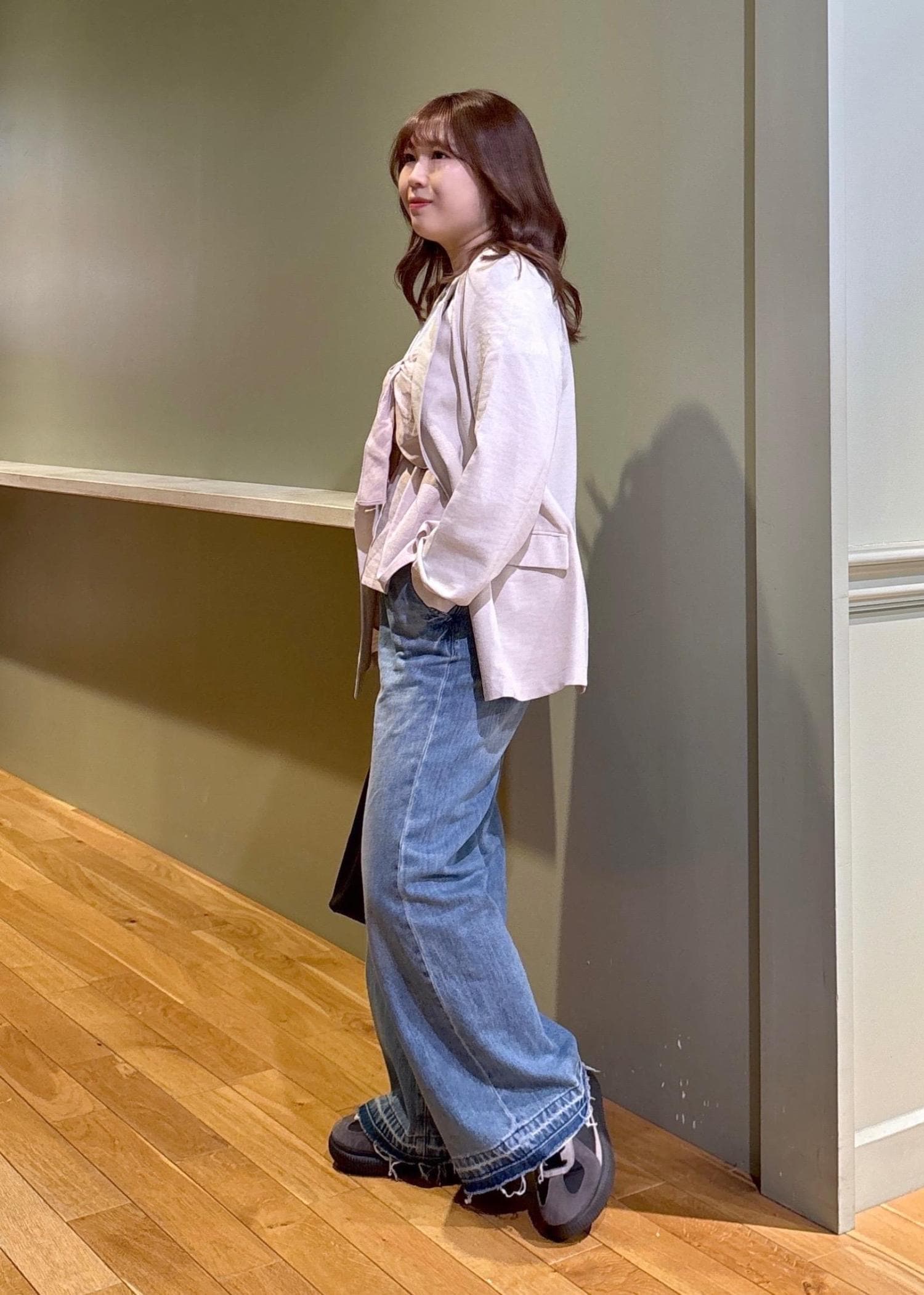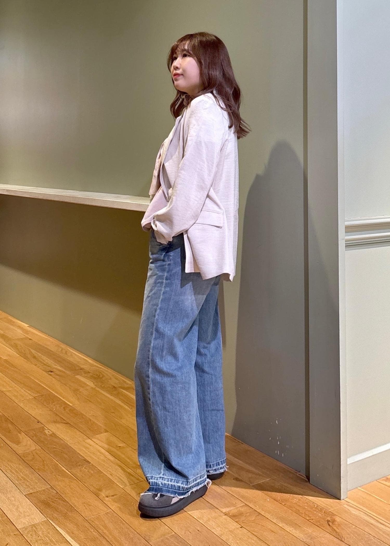 ややソール厚めのスニーカーで床につかない丈感でした -