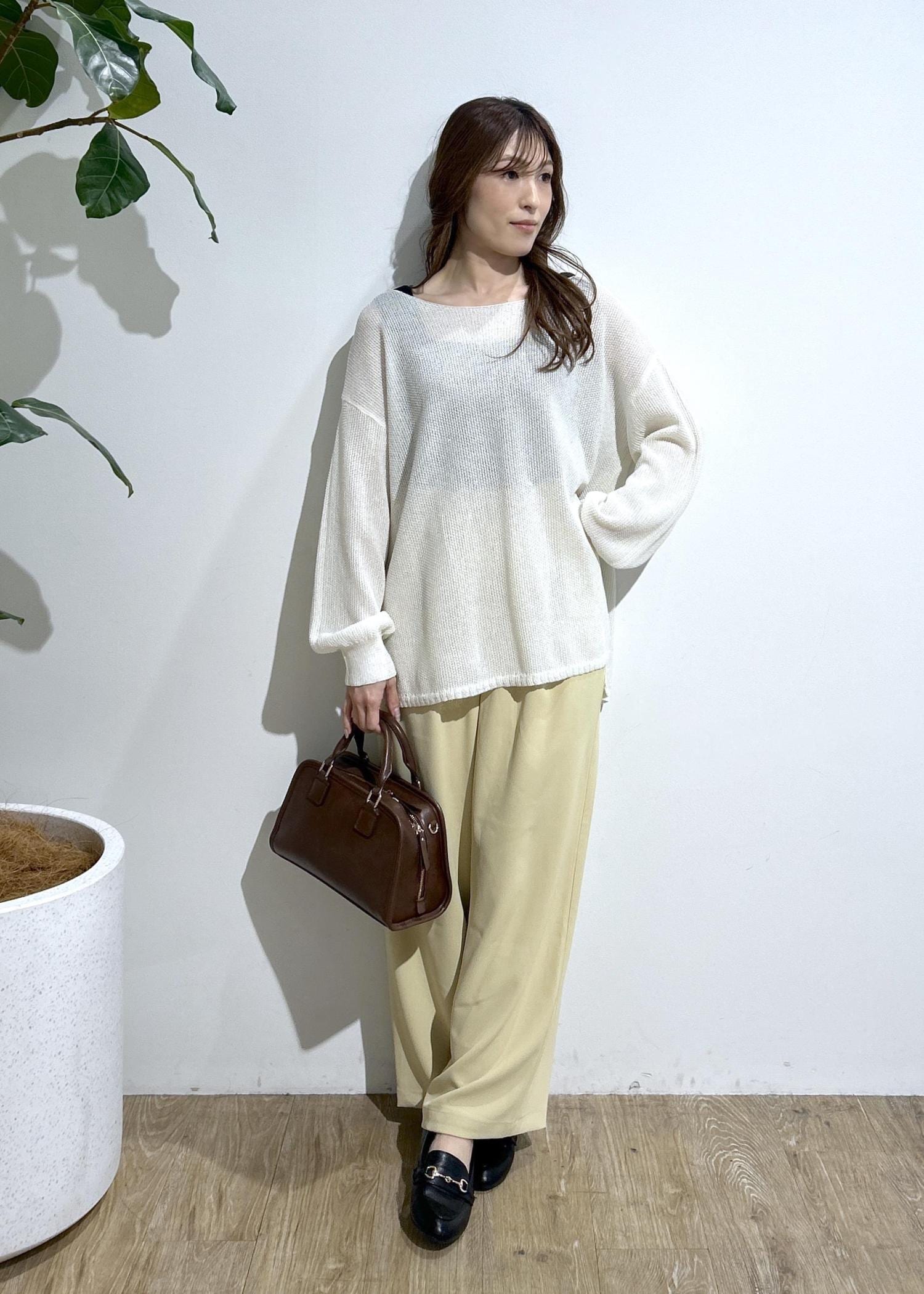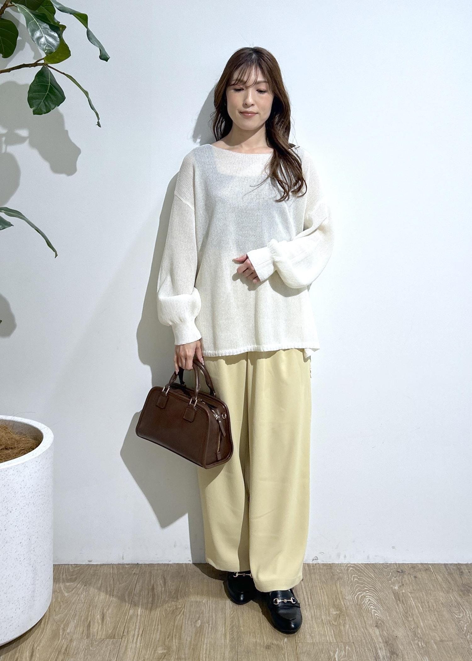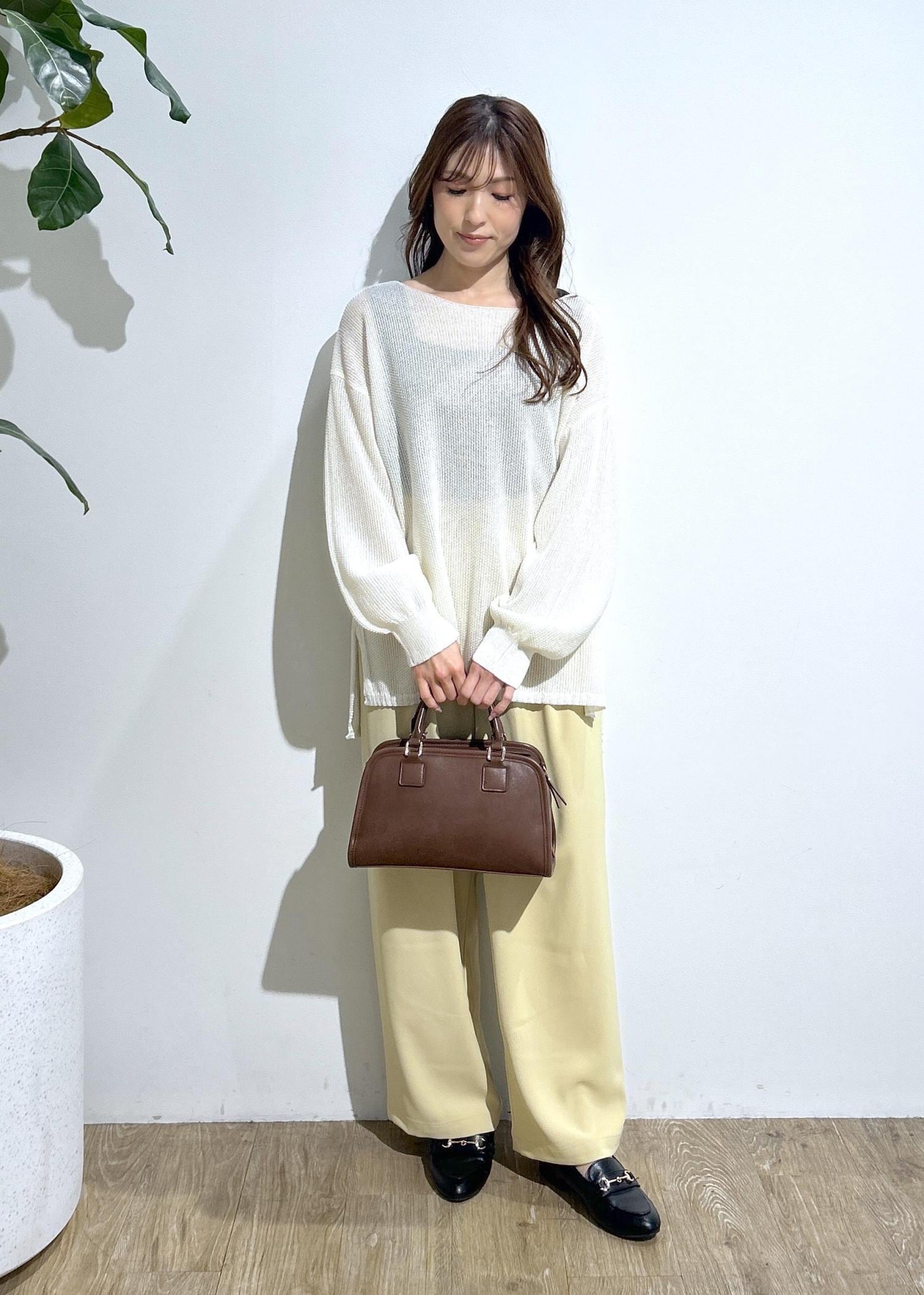 スパンコールニットとイエローパンツを合わせて春らしいコーディネートにしました。