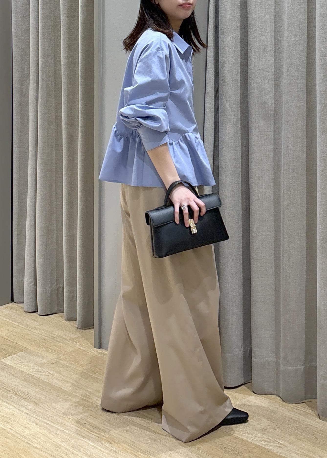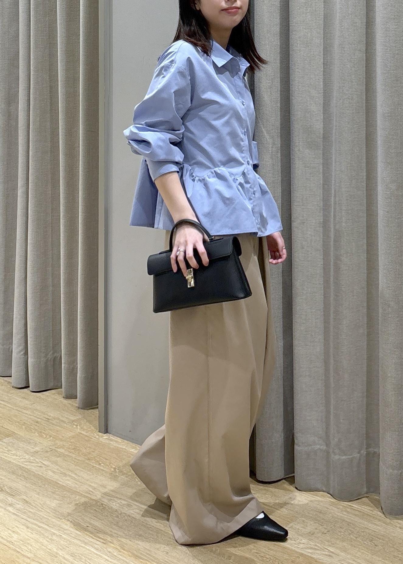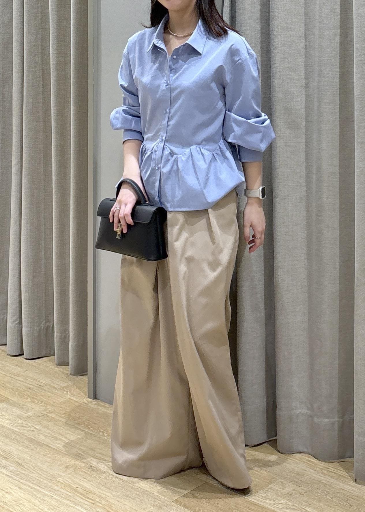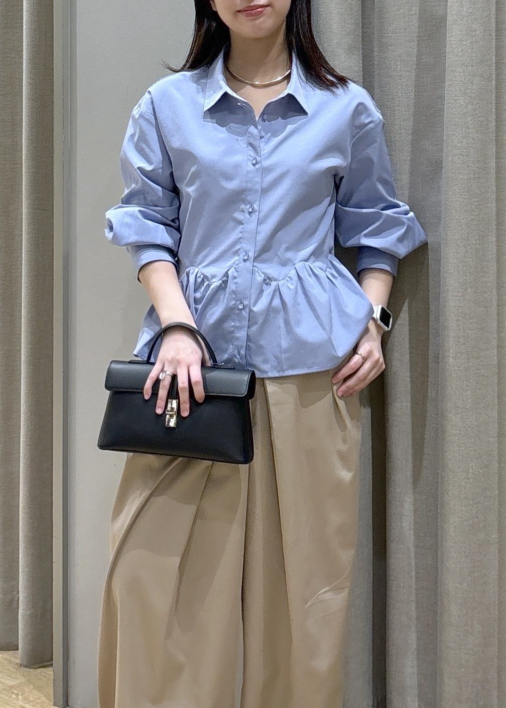 腰周りがふんわりするペプラムシャツなので体型カバーできます!